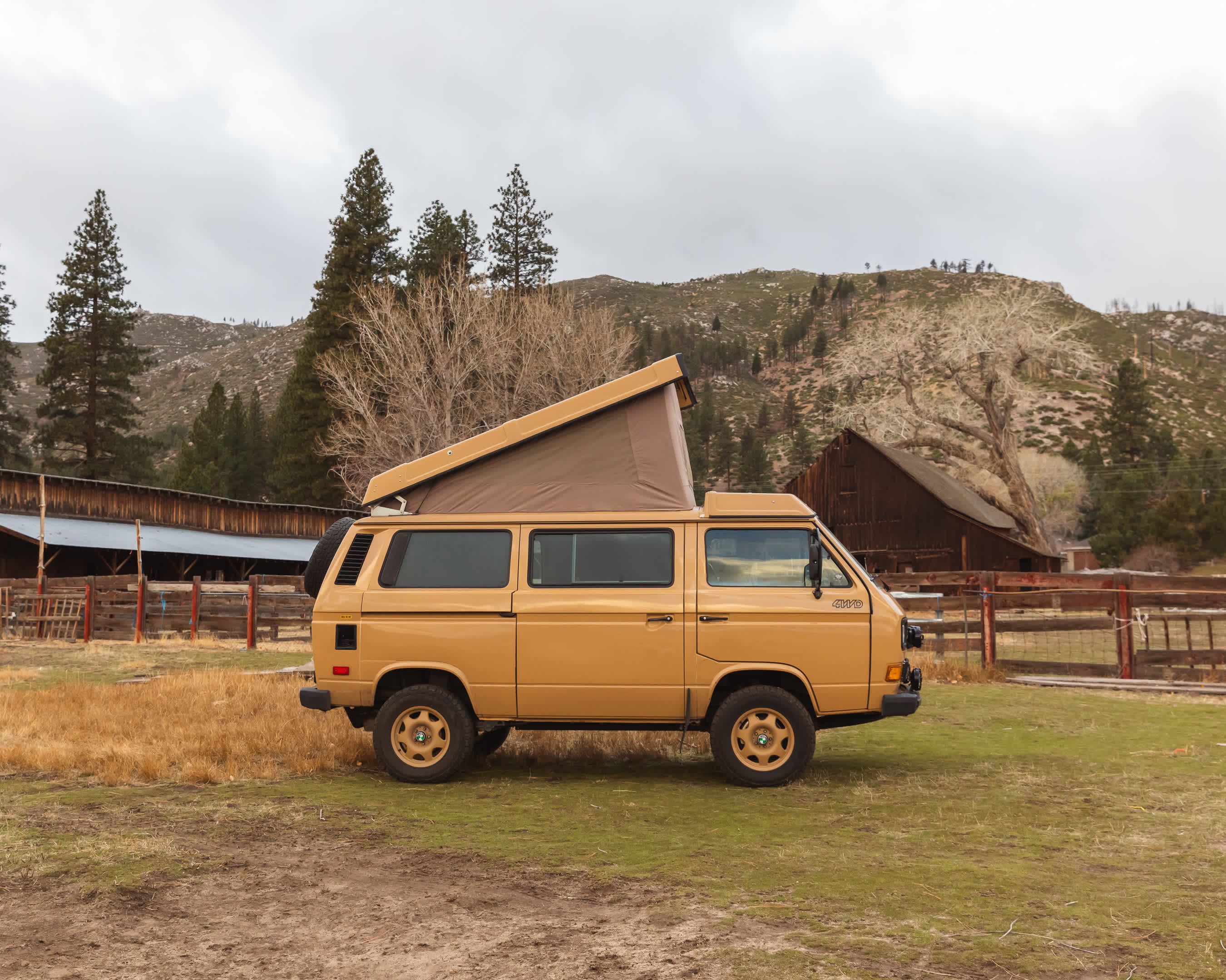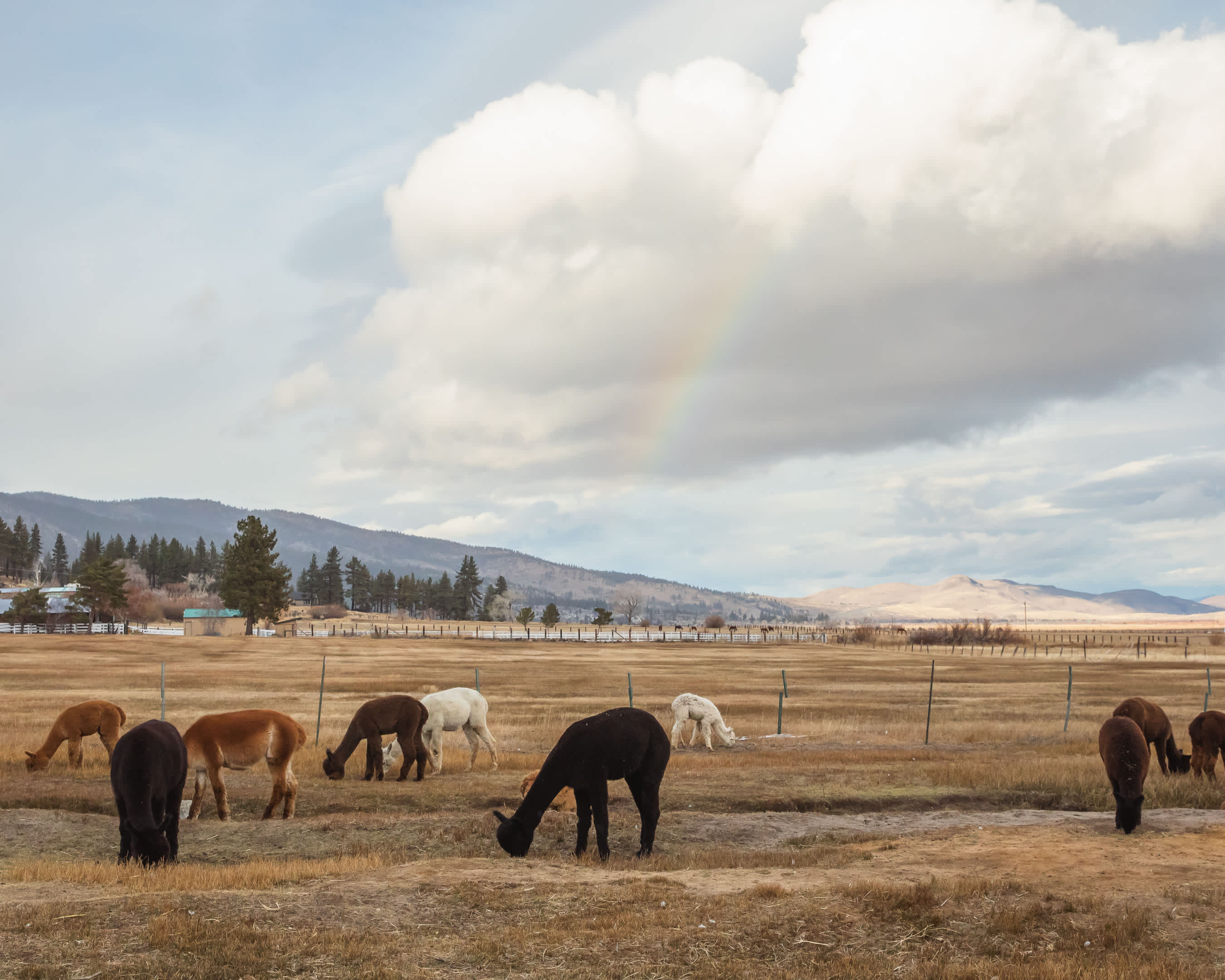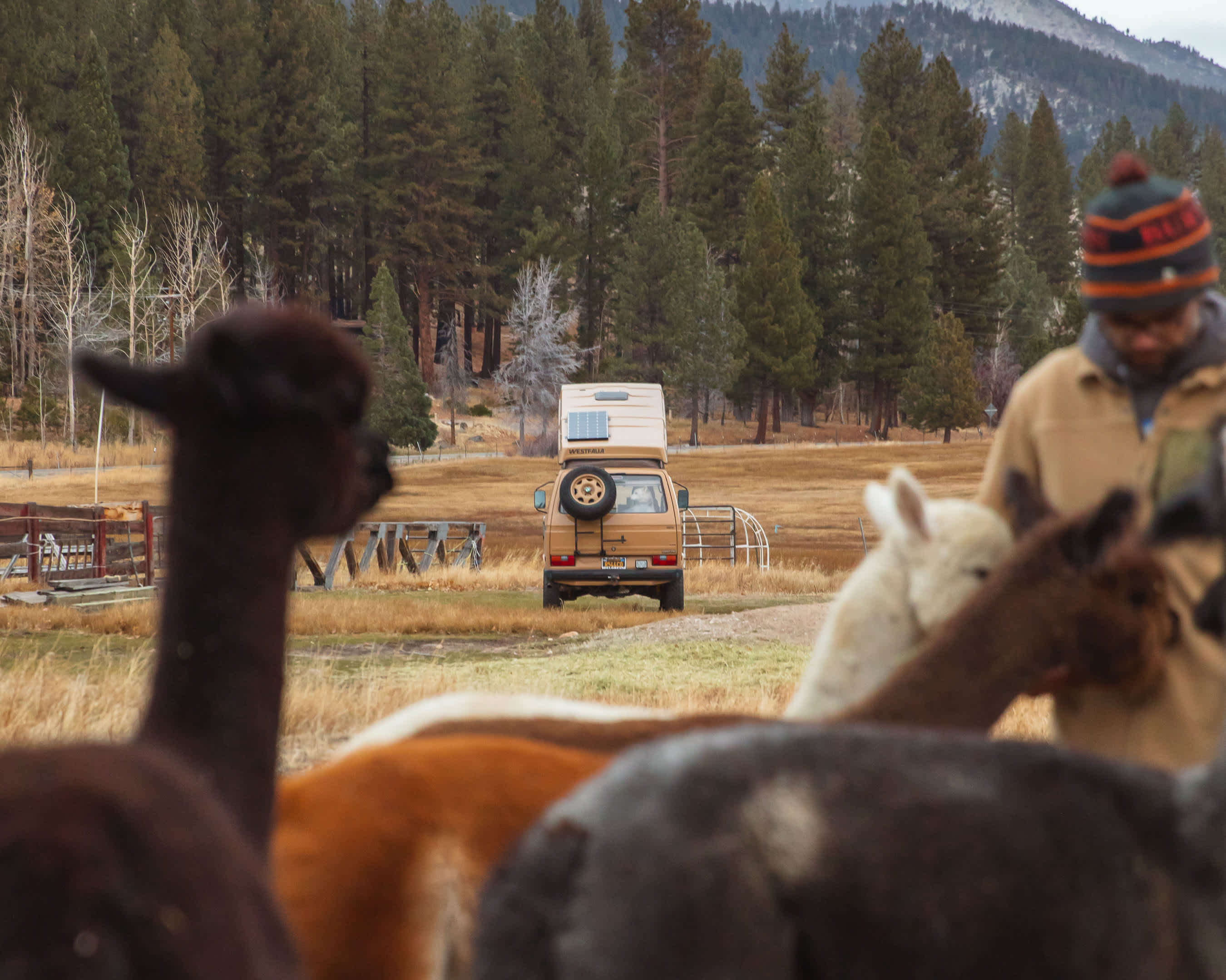 19 ft campervan · With pets · I loved this place. A friend and I met there, me from the Bay Area, she from down near Bishop, each of us with camper vans. Wonderful stormy skies, distant lightning, all that landscape around us. Stacy was welcoming, happy to chat about her work and her herd; her ranch hand was great, too (didn’t catch his name), a real story teller. And the alpacas: Such cool creatures, sort of ethereal, almost alien. Loved standing quietly and letting them check me out, those big eyes and long lashes. Lucky to visit when there were lots of babies, some of them nursing. Lots of other animals, too—sheep, angora goats, llamas, chickens.