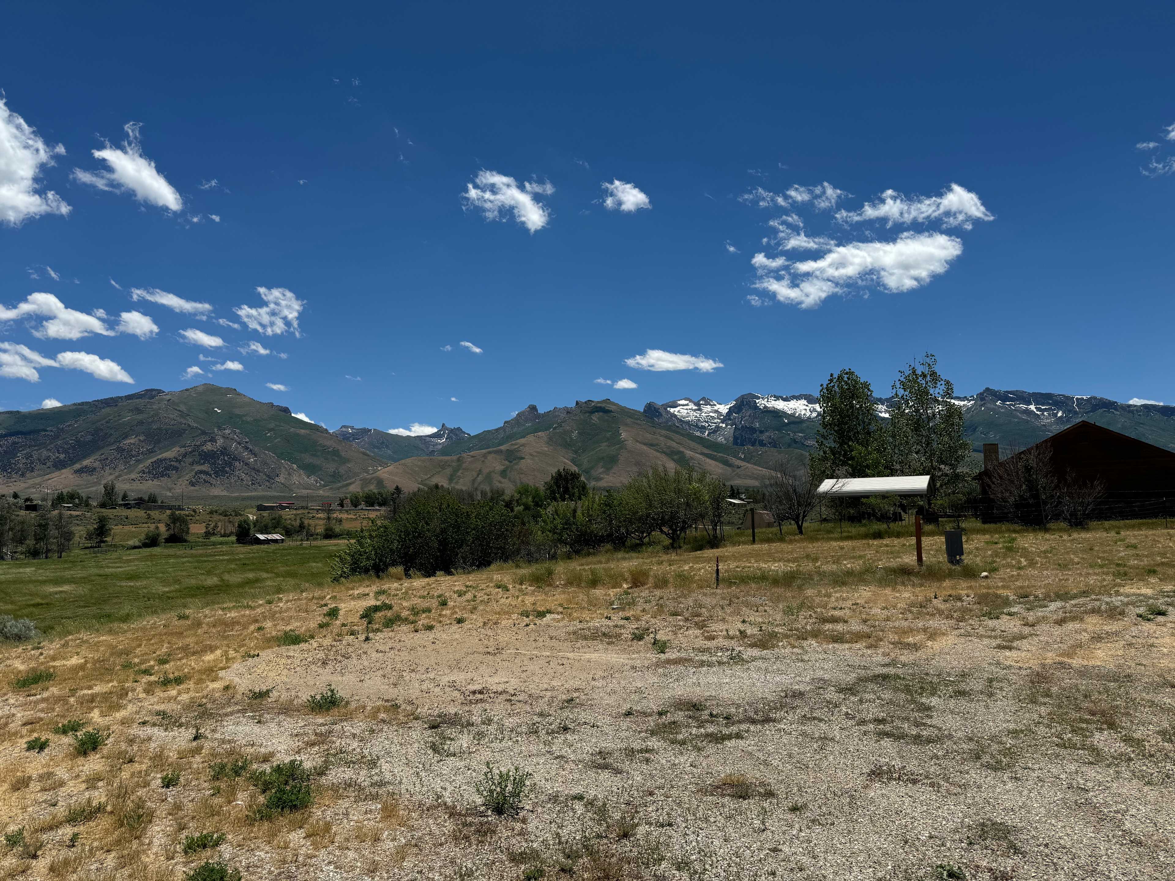 Rabbit Ears is located in Pleasant Valley at the base of the Ruby Mountains. Our property is about 2 miles from the turnoff to Lamoille Canyon and features amazing views of the Ruby range. The lot is entirely fenced so feel free to bring your well behaved 4 legged friends, just note that the neighbors have sheep so escape happy dogs may need some supervision. The site has water, electric, and sewer hookups if needed.This site is in the center of the property near the power pedestal, yard hydrant, and sewer hookups. It overlooks the pasture below the property and has a beautiful view of the Ruby Mountains. RV’s can easily pull in and situate their camp near the hookups. There is only one gate in and out but there is plenty of room to turn around within the property.