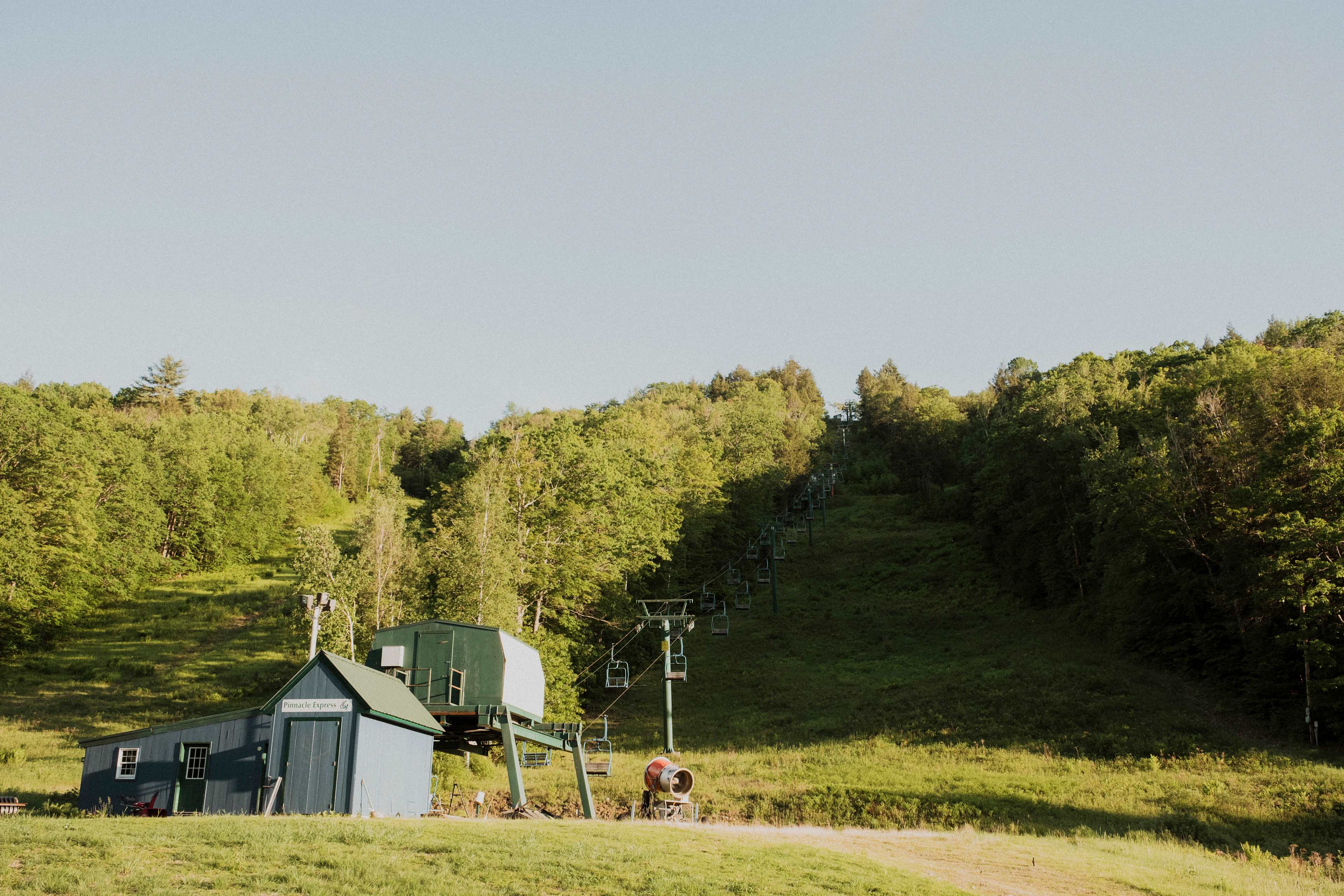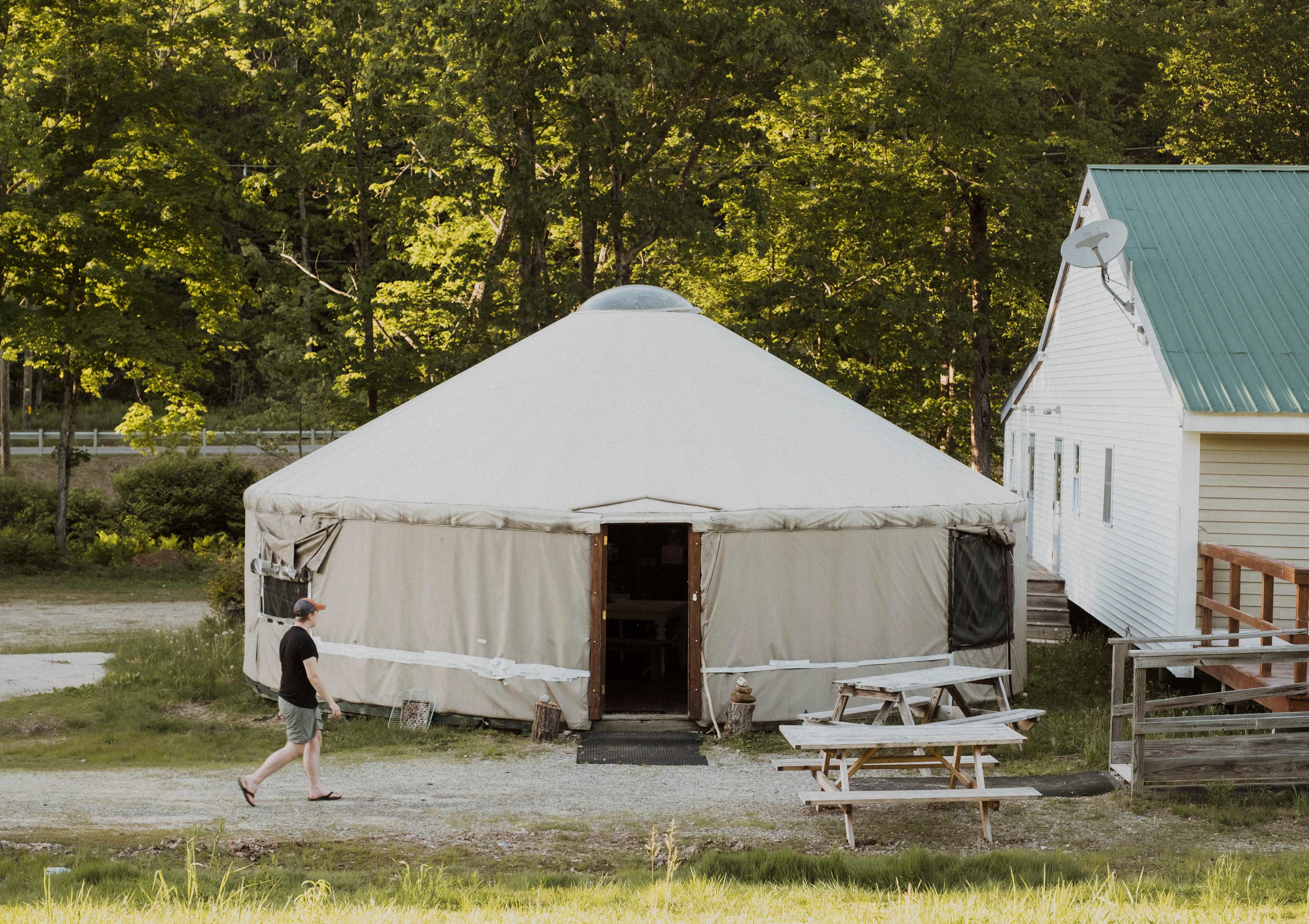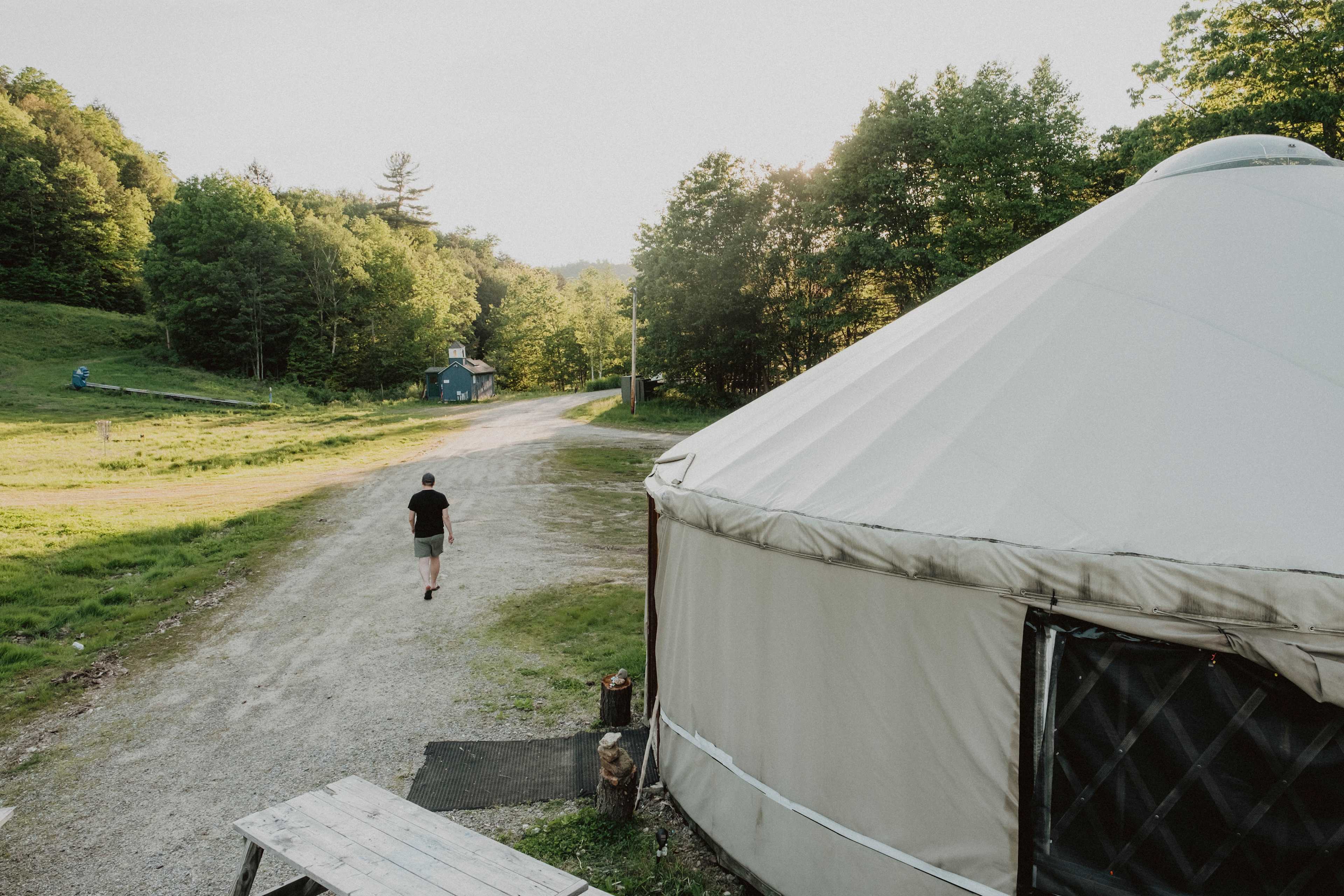 There is parking dedicated to this tent in the grass. The tent is set up on a wooden platform about 30 yards or so up one of the ski runs. It’s a bit of an incline, so be aware if you have any mobility issues. Also, keep this in mind when deciding what to bring. We had a foldable wagon and a cooler with wheels. That helped out immensely. Lots to explore right there. You can get a great hiking workout exploring the ski runs and property. Even have a nice creek that runs along the front of the property to walk along in.