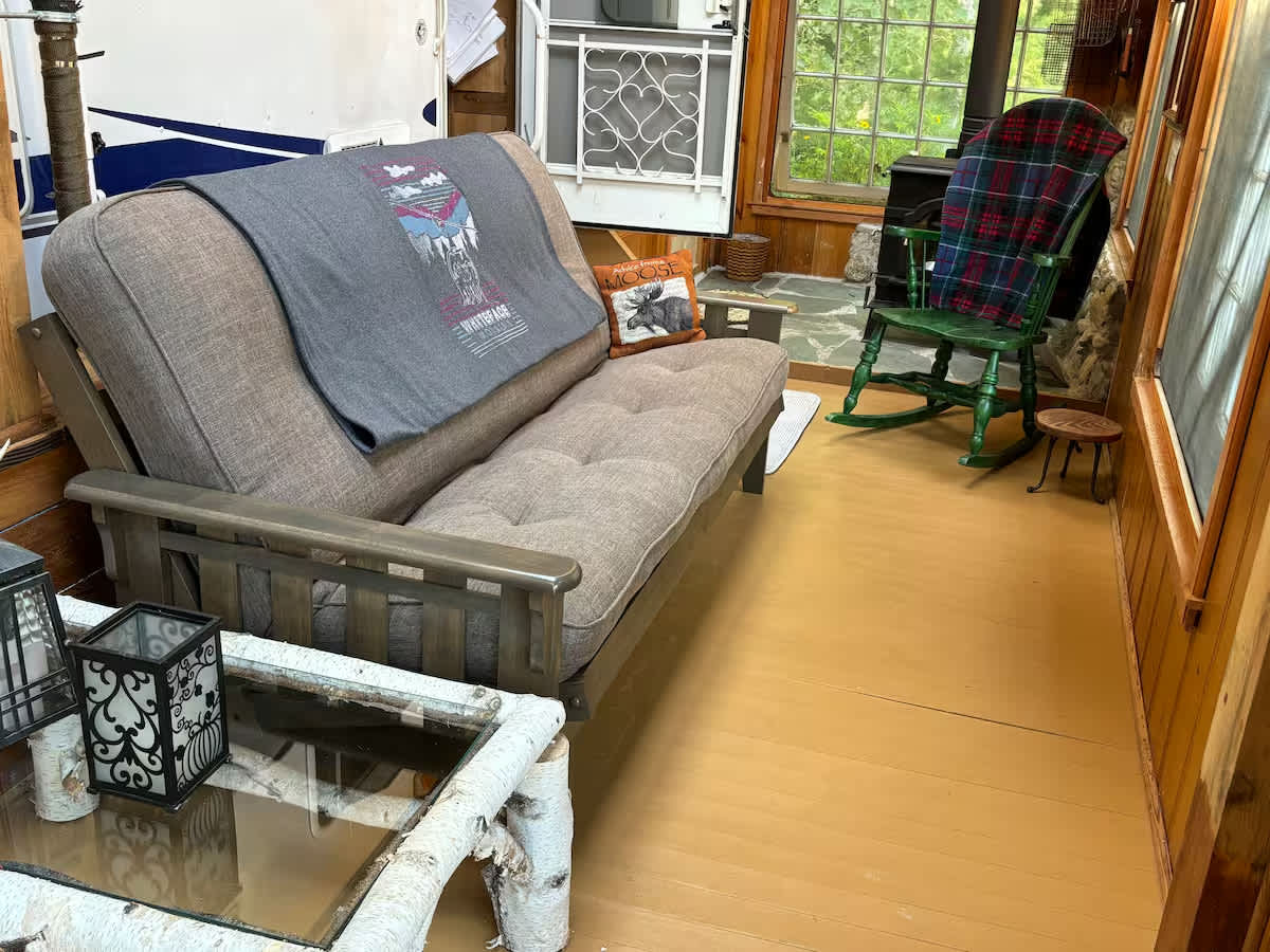 Fully equipped Camper, with a spacious front porch. Maximum: 4 occupants. Queen bed. The futon inside the camper sleeps one. A large futon on the porch sleeps two. Bunk beds for two children <10. Full kitchen. Composting toilet and outhouse (no flush toilet). Indoor tiny shower, plus an outdoor shower and washer/dryer. Close to Elizabethtown, Essex. Pet friendly, with 32 acres of woodland with trails that will take you to ledges with views of Coon Mt. Easy access from I-87, the Adirondack Northway. We used to do a lot of canoe camping in our younger days. We call this "glamping." Refrigeration, a/c, high-speed WiFi, and an oven are wonderful luxuries... Good news! We will be fully solar-powered soon… hopefully in September! We tried to imagine what we would want if we were returning from a week-long canoe trip. A hot shower, a washer and dryer, an internet connection, and a good hot meal. We are “living the dream in the Adirondacks,” and we are happy to share with others. We have enjoyed visiting the Adirondacks for many years. My father was born in Keene and grew up in Keene Valley. We still have family in the area. My husband Richard and I just retired in June 2024. We could not think of a more beautiful and peaceful place to live out our retirement years. We searched for 6 years and finally settled on the gray house in Westport, with 32 acres of wooded land. You have the entire camper, porch, high-speed satellite internet, full kitchen, indoor full bathroom with composting toilet, outdoor shower and washer/dryer, fire pit, outdoor seating, outhouse, and 32-acre woodland surroundings. Feel free to explore the two marked walking trails (former logging trails). One is marked with orange tags; the other is green. Park in front of the camper.Fully equipped Camper, with a spacious front porch. Maximum: 4 occupants. Queen bed. Single futon inside the camper sleeps one. A large futon on the porch sleeps two (double size). Bunk beds inside for two children (less than 10 years). Small full kitchen (3 gas burners, oven, sink, apartment-sized refrigerator/freezer, coffee pot, water kettle, toaster, dishes, silverware, pots and pans). Composting toilet and outhouse (no flush toilet). Indoor tiny shower, plus a spacious outdoor shower, along with a washer/dryer. Located in Westport, close to Elizabethtown, Essex, Lake Champlain. Pet friendly, with 32 acres of woodland with trails that will take you to ledges with views of Coon Mt. Easy access from I-87, the Adirondack Northway. We used to do a lot of canoe camping in our younger days. We call this "glamping." Refrigeration, a/c, high-speed WiFi, and an oven are wonderful luxuries... Good news! We are now fully solar-powered! We tried to imagine what we would want if we were returning from a week-long canoe trip. A hot shower, a washer and dryer, an internet connection, and a good hot meal. We are “living the dream in the Adirondacks,” and we are happy to share with others. We have enjoyed visiting the Adirondacks for many years. My father was born in Keene and grew up in Keene Valley. We still have family in the area. My husband Richard and I retired in June 2024. We could not think of a more beautiful and peaceful place to live out our retirement years. We searched for 6 years and finally settled on the gray house in Westport, with 32 acres of wooded land. You have the entire camper, porch, high-speed satellite internet, full kitchen, indoor full bathroom with composting toilet, outdoor shower and washer/dryer, fire pit, outdoor seating, outhouse, and 32-acre woodland surroundings. Feel free to explore the two marked walking trails (former logging trails). One is marked with orange tags; the other is green. Park in front of the camper.