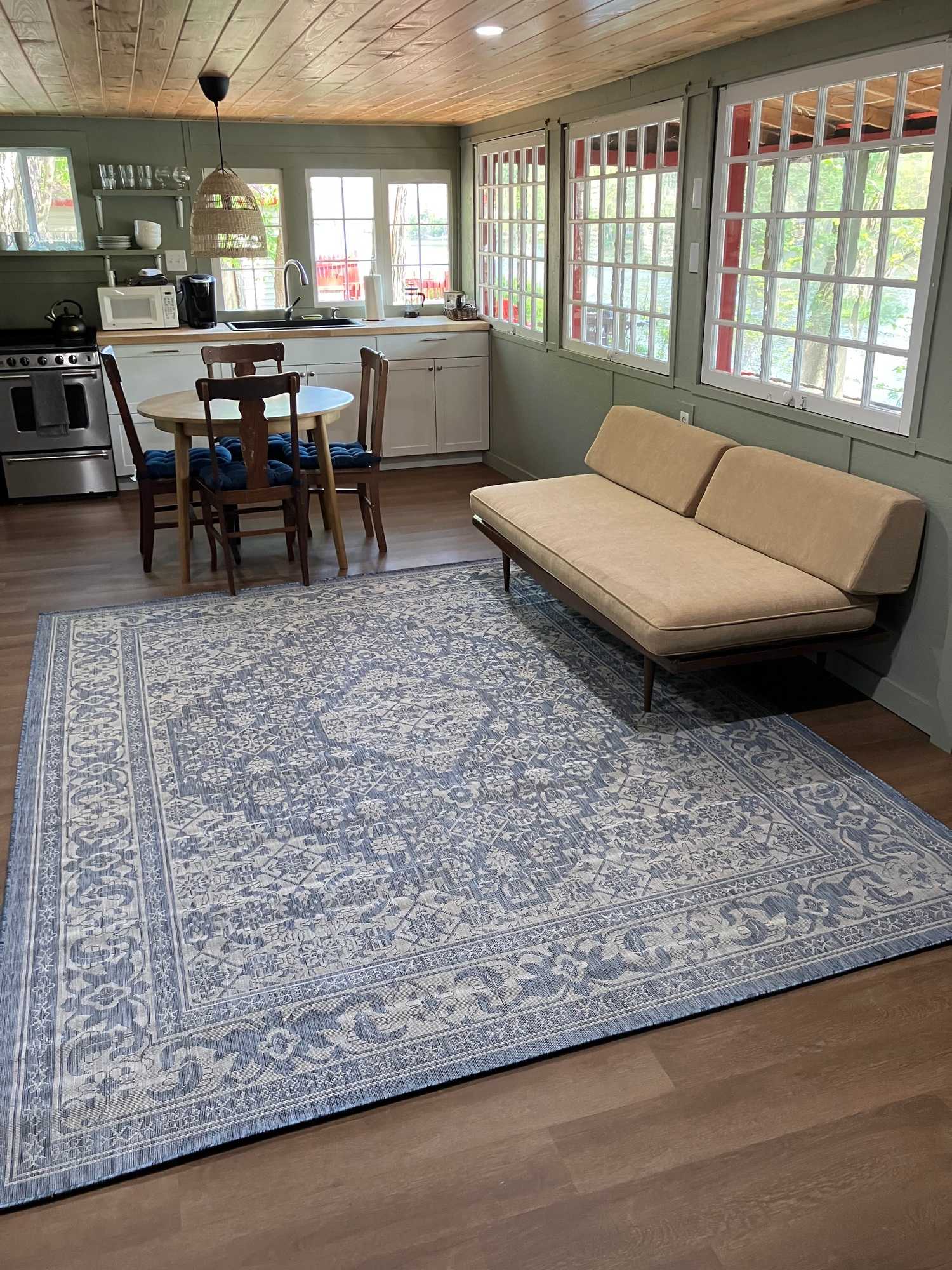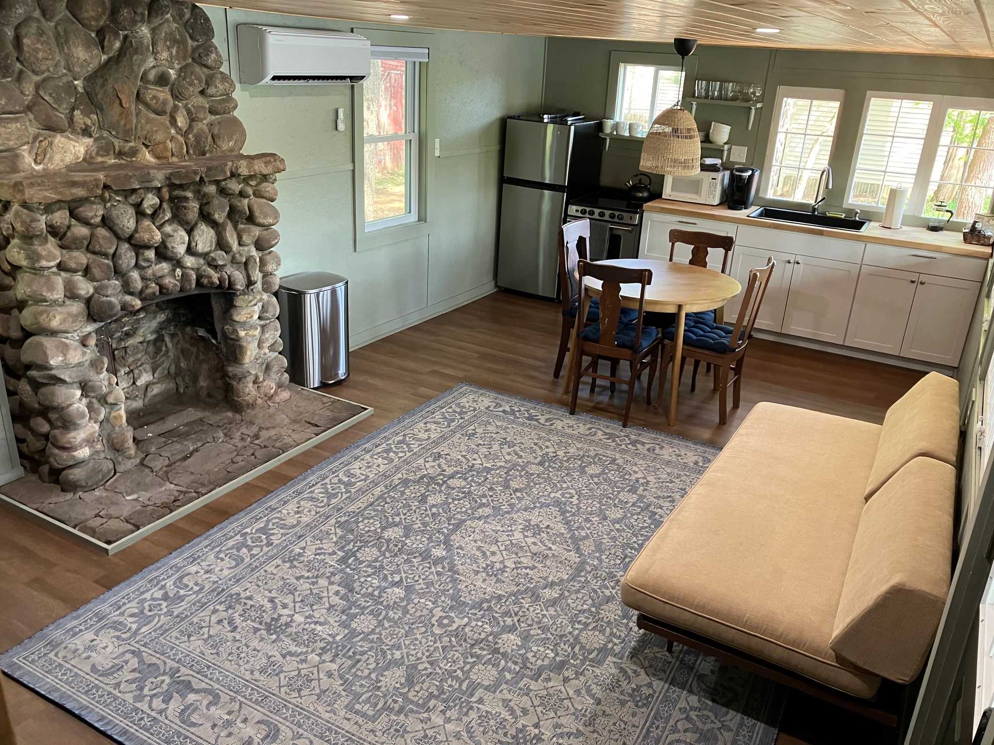 Tamarack cabin has huge windows on the main floor looking out on an incredible view of the Hudson River. Whether cozy in the cabin or, enjoying the fresh breeze on the screened-in-porch, this is a place to relax. The main level is open with the kitchen sink looking out over the Hudson. It has an oven and stove, refrigerator, microwave, Keurig, french press and toaster. It has all the basic cooking items and dishes you will need. There is a table for four and a couch and chairs to watch tv. The bathroom has a shower, and a washer and dryer. The main level steps out to a screened-in-porch with a bench and a small table and chairs to enjoy the river view. Outside there is a Solo stove with Adirondack chairs and a propane grill. Or enjoy reading a book in the hammock under the canopy of trees. Upstairs is completely open with a pitched pine ceiling. There is a queen bed and two twin beds. There is a pull out trundle as well for a young child. There is a mini-split system both upstairs and downstairs keeping the space cool in the summer and warm in the fall and spring. This cabin is its own property, but is a part of a larger campground with waterfront swimming access, a pool and a camp store. You can keep to yourself at the cabin or explore the rest of the campground and play ping pong or pool in the pavilion. There is WiFi at the house and you can access it in other parts of the campground as well. One dog is allowed at the Tamarack cabin. While we love dogs we ask that you be careful with the space and the furniture with your dog. Dogs are not allowed to be left unattended in either the cabin or the yard. If your dog is left you will be asked to leave and will not receive a refund. There is a pet cleaning fee. If there is any damage done by your dog you will be charged accordingly. We have a dog park a short walk away.