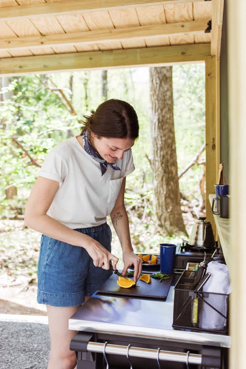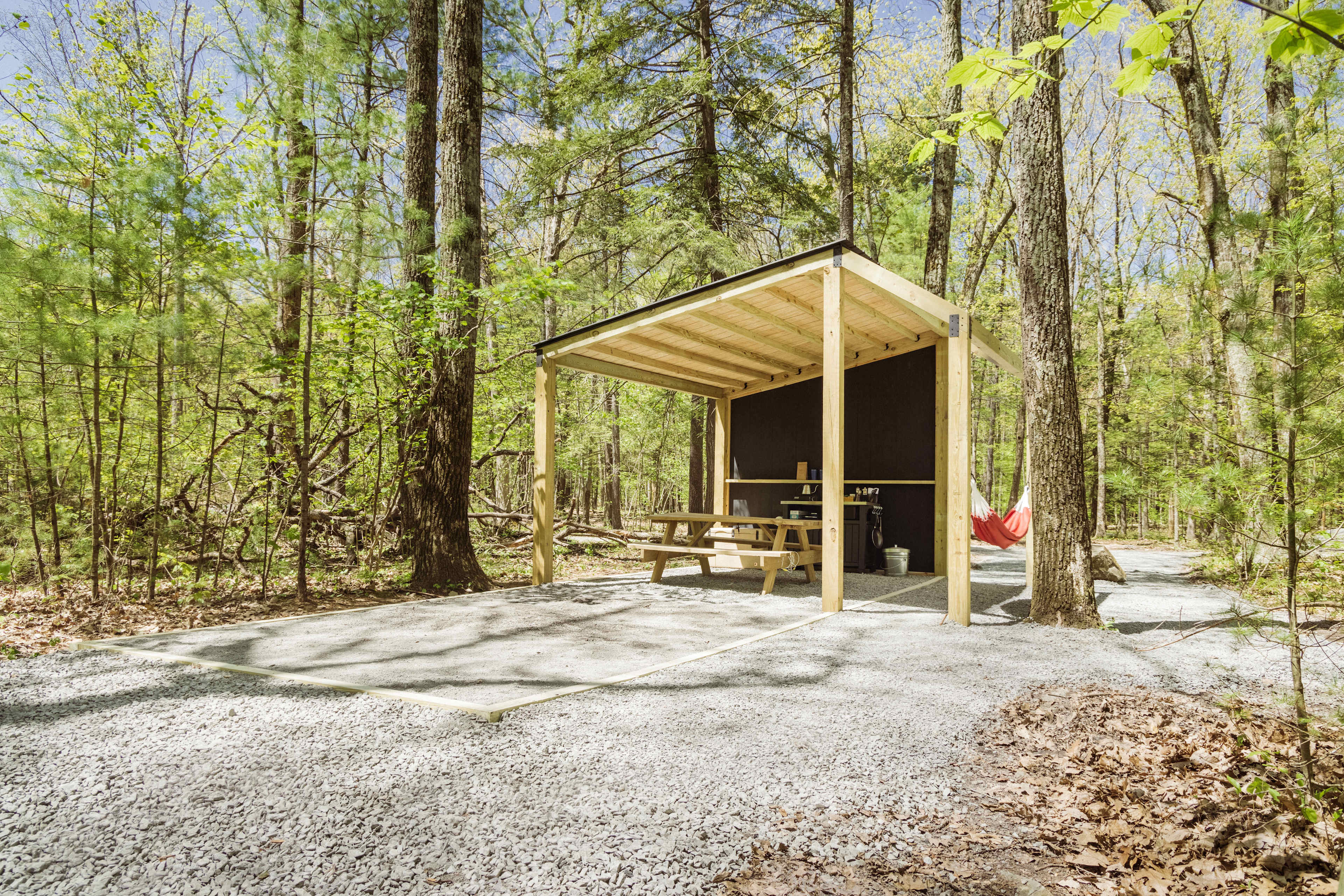 Getaway Campgrounds offers a modern, immersive outdoor experience for today’s camper. Each campsite is built for comfort, with clean and modern amenities designed to help you soak in your surroundings. Our campsites are about 200 square feet with approximately 10’ by 10’ of space for a tent. Each campsite is surrounded by nature and offers a secluded, covered structure complete with a picnic table, hammock, fire pit, and Adirondack chairs. You’ll also have a kitchenette fit for cooking with a propane burner (plus propane canister), and essentials including oil, salt + pepper, dishware, cutlery, and non-perishable provisions for purchase. Plus, private bathroom suites (hot shower, toilet, and sink) are nearby.