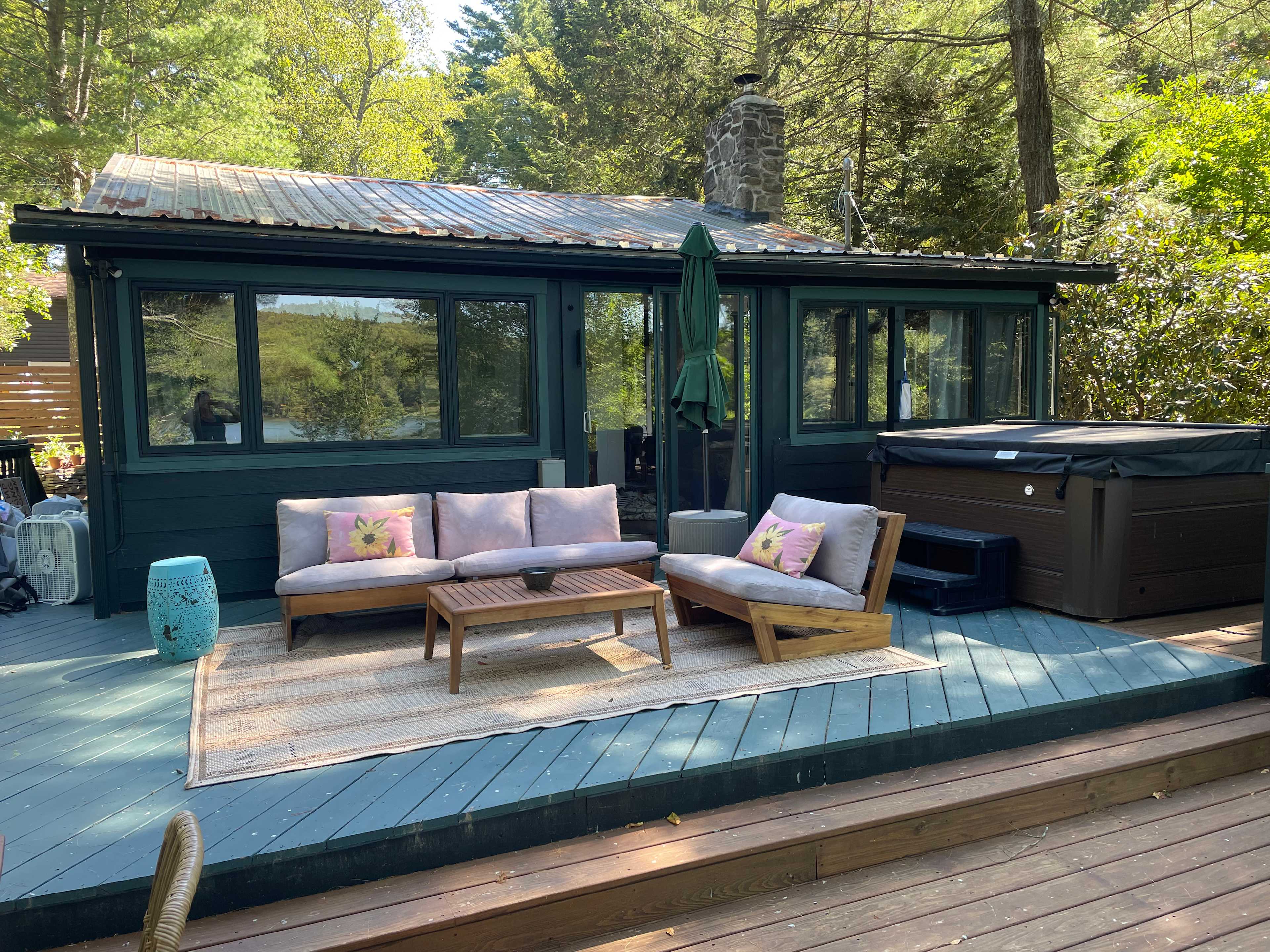 Surrounded by trees and overlooking a stunning lake, this 1940s cottage will have you in relaxation mode in no time. Explore the area, or simply stay in and enjoy the view, hot tub, fire pit, fully equipped kitchen with new appliances, and indoor fireplace. Nearby you’ll find beautiful lakes, scenic drives, the Bethel Woods Performing Arts Center, and the charming towns of Narrowsburg, Livingston Manor, and Roscoe. Well-behaved dogs are welcome with approval, and the property is fully fenced. While there are other houses nearby, the setting still feels private.This is a very peaceful setting by a lake. I do have neighbors, but there it is very private. There is a big deck, side yard, front yard, and patio with fire pit. Down in front of the house there is a small road that rings the lake - perfect for taking a stroll and enjoying nature. The hot tub is up on the deck. Because of HOA rules, guests may not use the lake. There is a reservoir nearby, and a couple other lakes that are for public use.