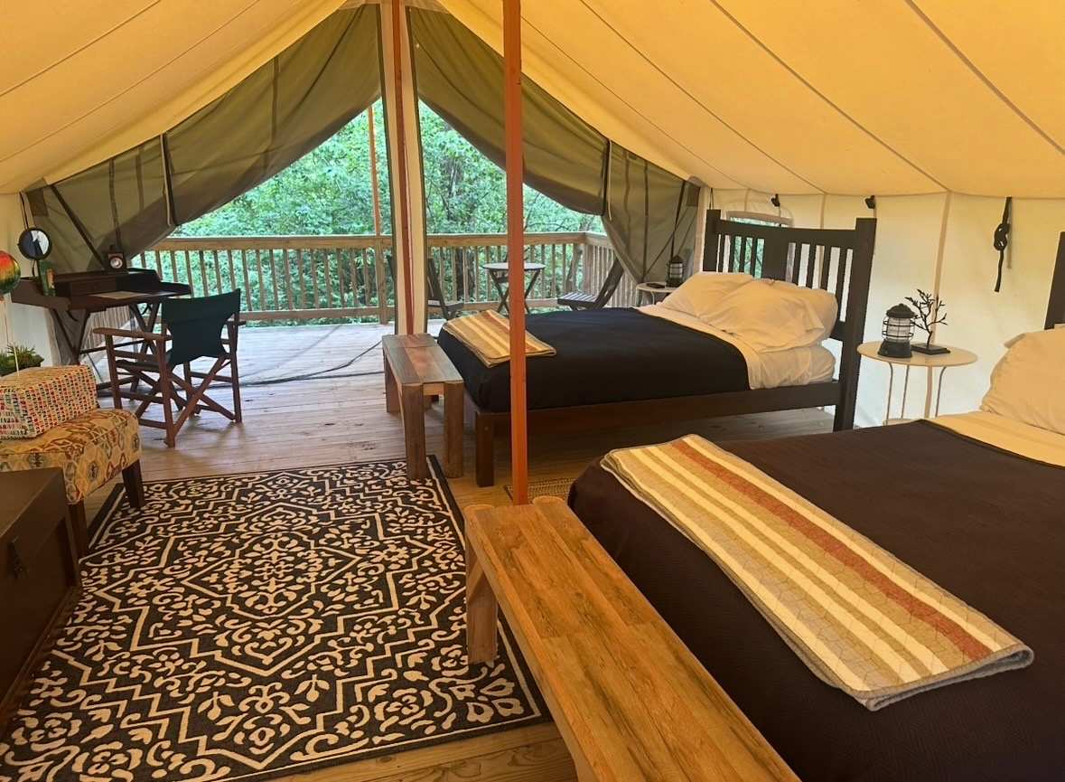 This is a beautiful Safari tent with great space for your family. It includes two queen beds, a desk, comfortable chair and a private balcony with table and chairs. The bed includes Denver mattresses and beautiful, soft linens to make your night very cozy! There is no electric in this tent, but we do provide rechargeable battery, fans, lanterns, and a flash light.