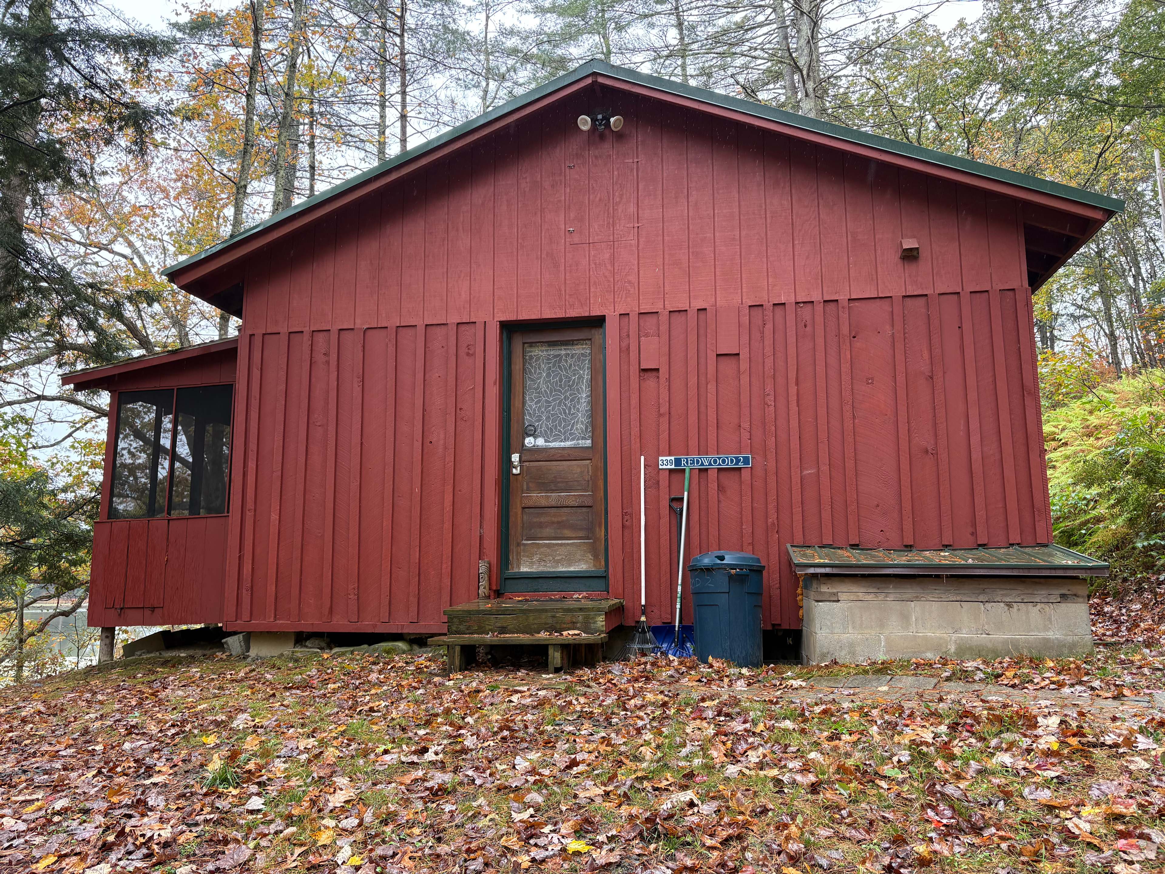 The Redwood Two Cabin accommodates 2 to 4 guests in two bedrooms with full beds, a screened porch, kitchen, living room, and bathroom. One parking space is provided nearby. Overlooking the lake, one of the best locations on site