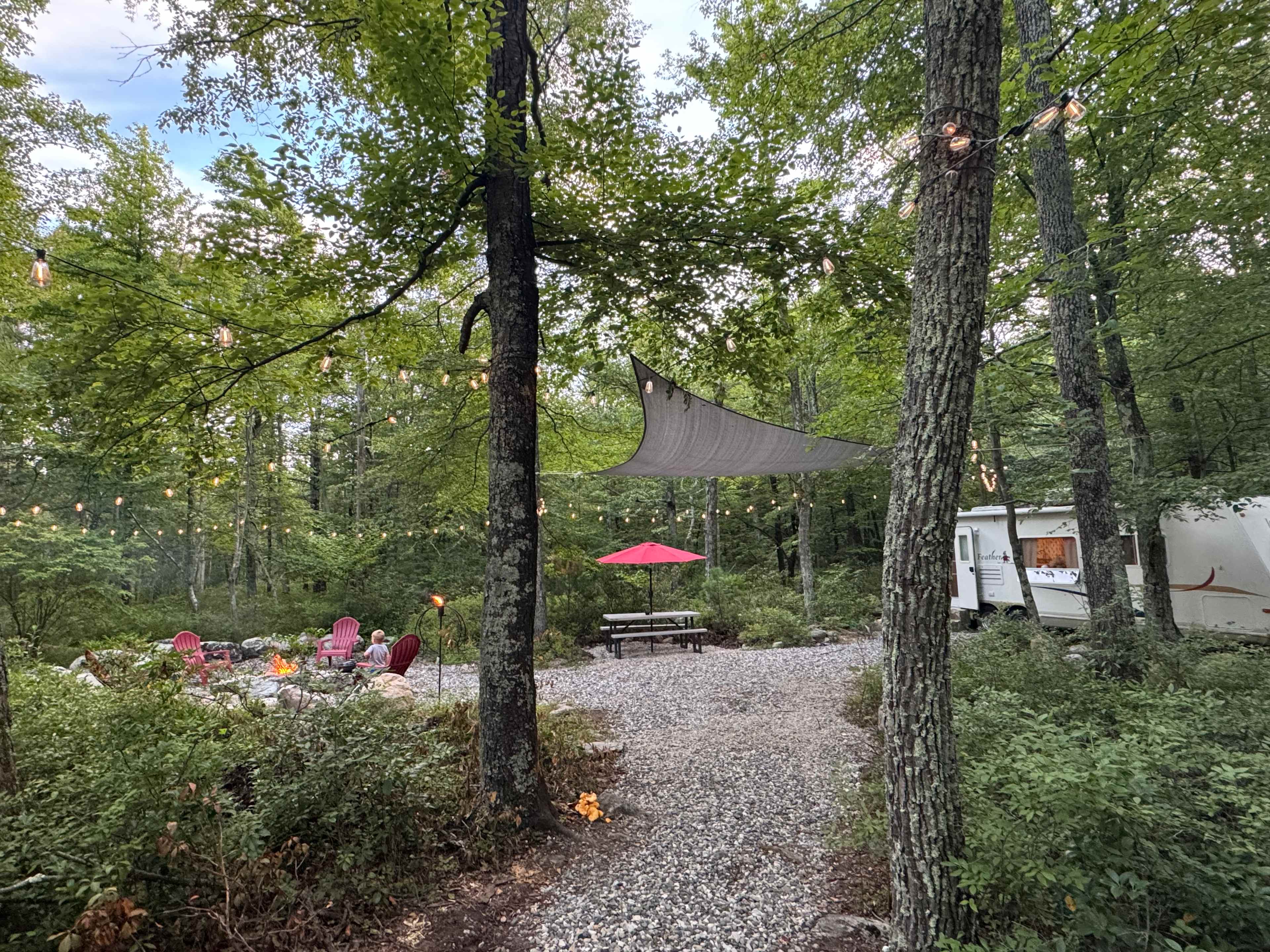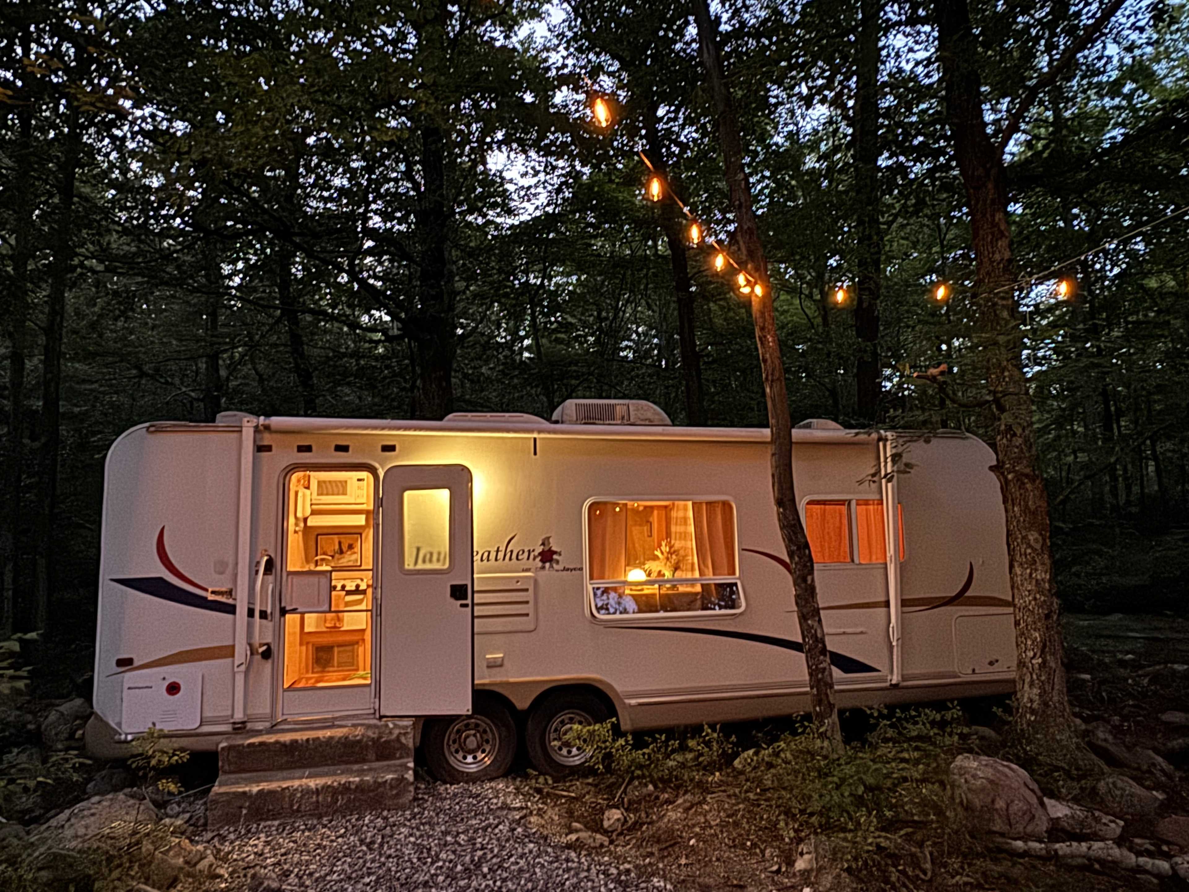 Complete privacy, access to private trail with streams, fire pit, RV with bathroom and kitchen, queen sized bed, modern touches and decor, full size futon, WI-FI, ROKU TV, AC, heat, DVD PLAYER WITH DVD's, CD player/radio. Firewood, charcoal and fire starters provided, Smoky Joe hibachi charcoal grill. Coffee for standard pour over coffee maker provided. Parking is available directly on-site.Peace and quiet! The solitude and nature you’ve been looking for. The RV is situated right along our private trail. Feel free to explore the trail and streams on the property. We are nearby, but you won’t see us and we won’t see you! But if you need anything, we are only a call or text away.