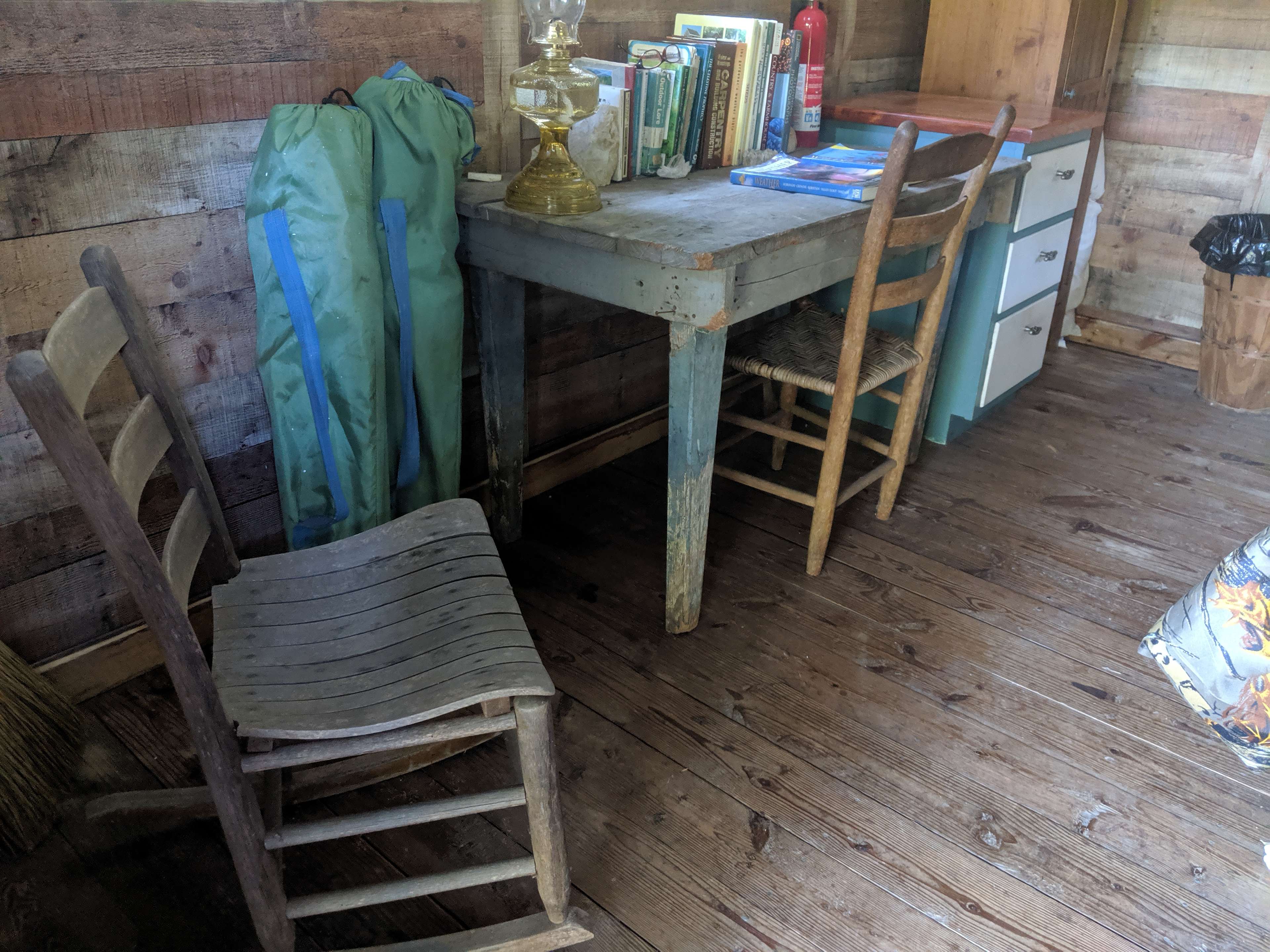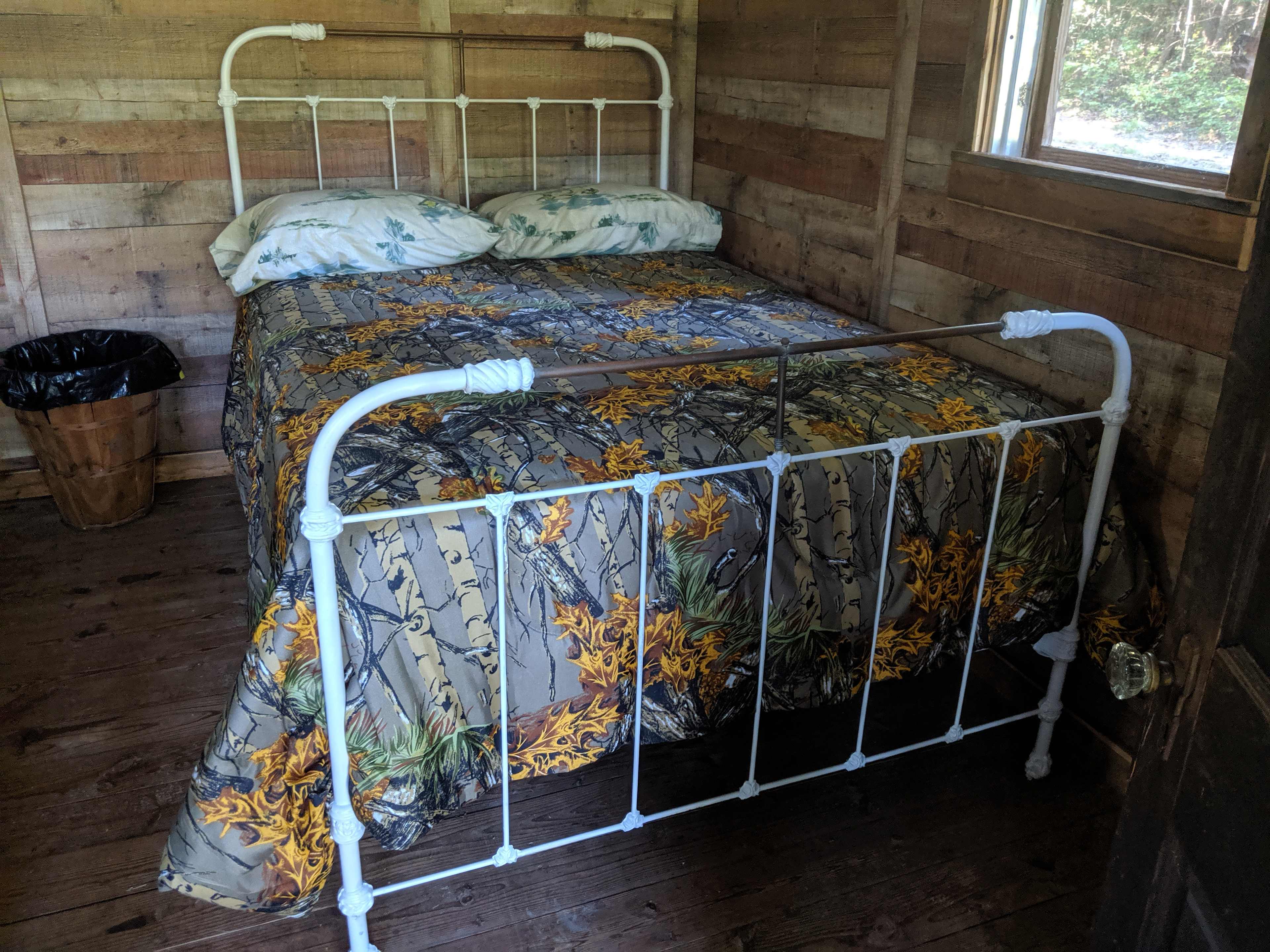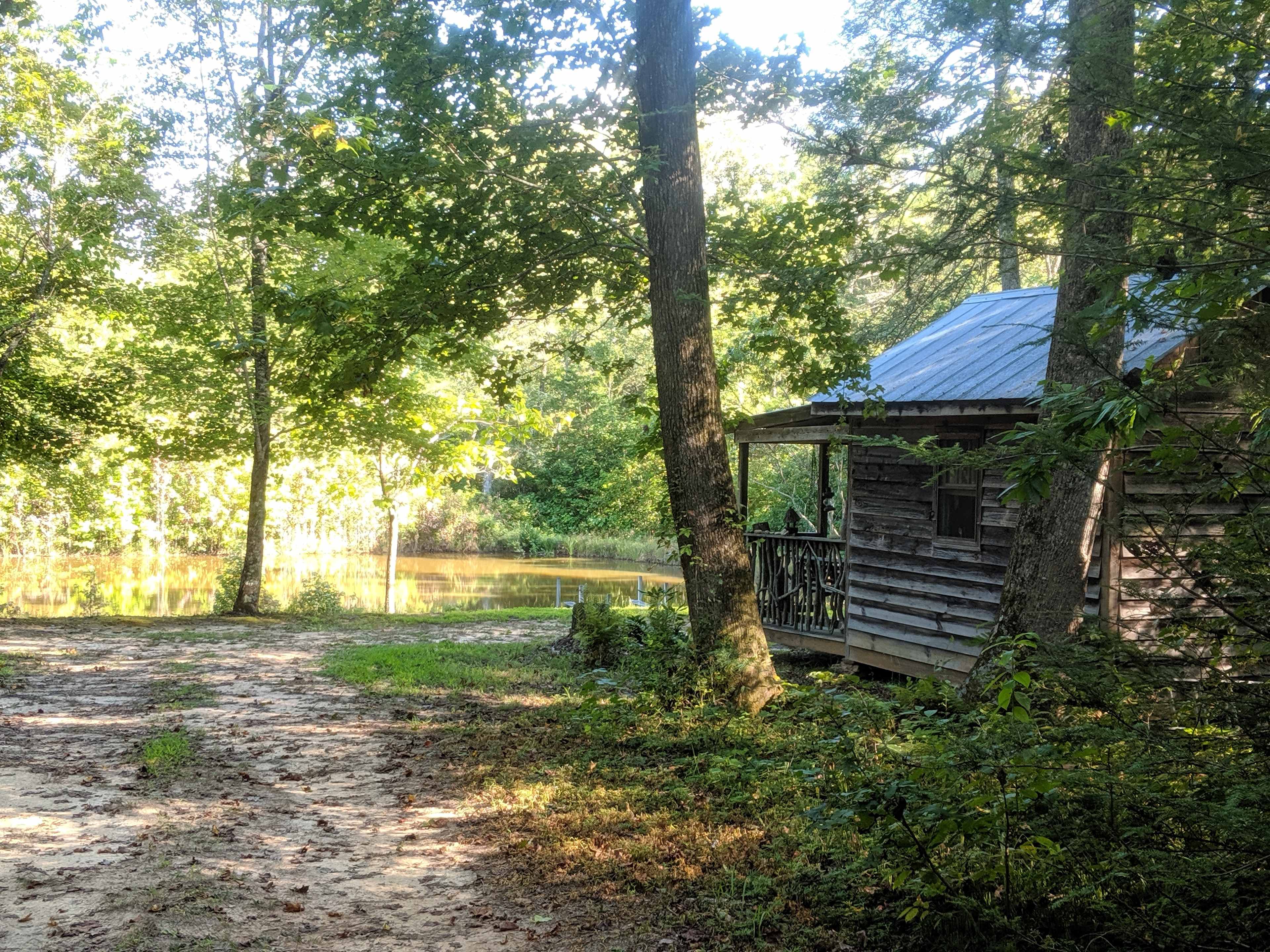 Primitive hand built one room cabin with porch overlooking the pond. Full size bed, table and chairs. Guests bring their own linens for bed. Fishing equipment and a corn hole game is available. The cabin is secluded in the woods with plenty of privacy. The setting is perfect for enjoying nature. Make some s'mores at the fire pit or use the small charcoal grill for cooking a meal. Charcoal is included. Sit around the picnic table or in the chairs to enjoy the fire pit. There's also a hammock for relaxing. The comfort station (out house) is located steps from the cabin. It's equipped with sensor lights for your convenience. The cabin has no running water. You'll be supplied with bottled water and a rain barrel. No access to electricity.