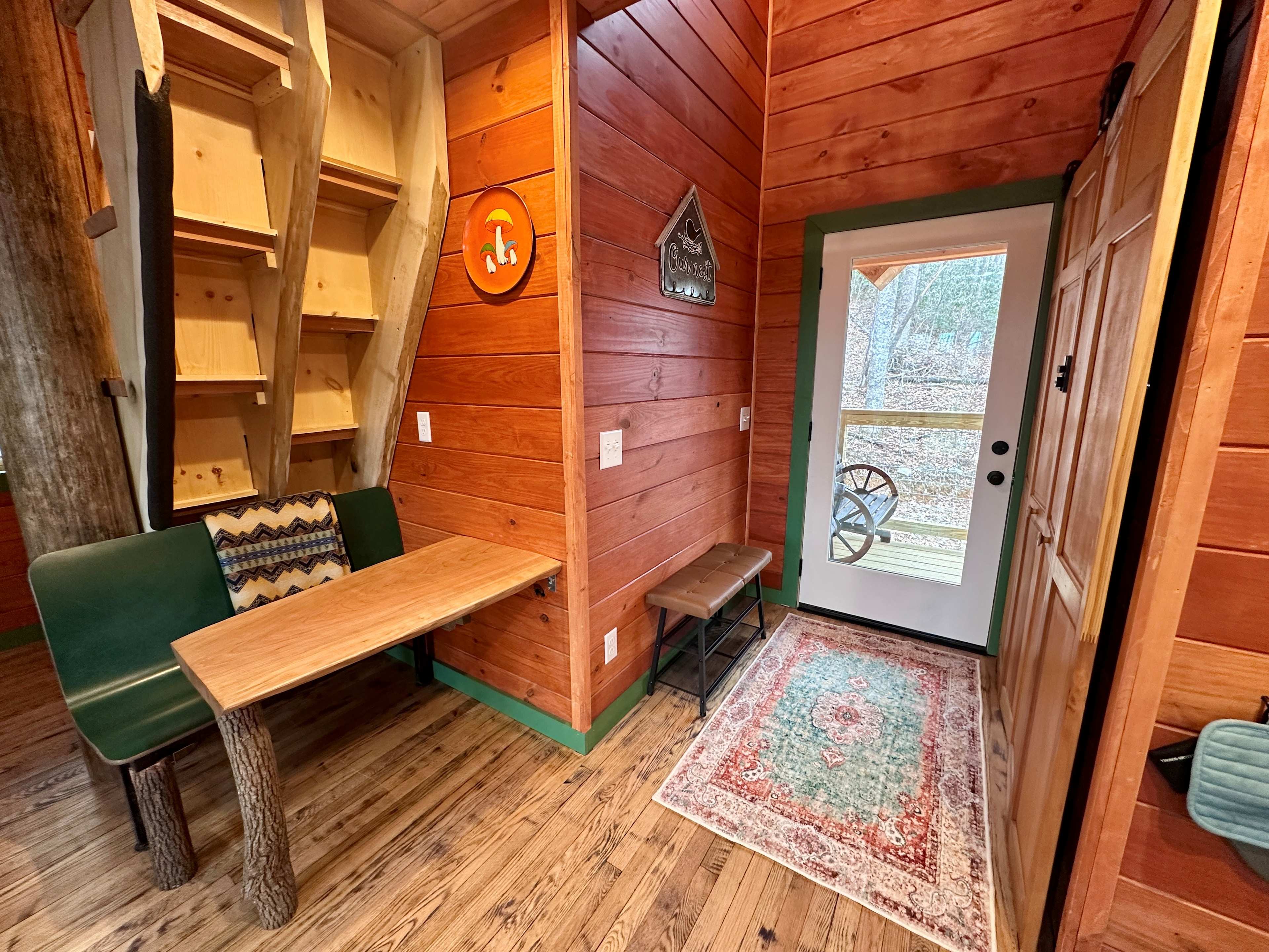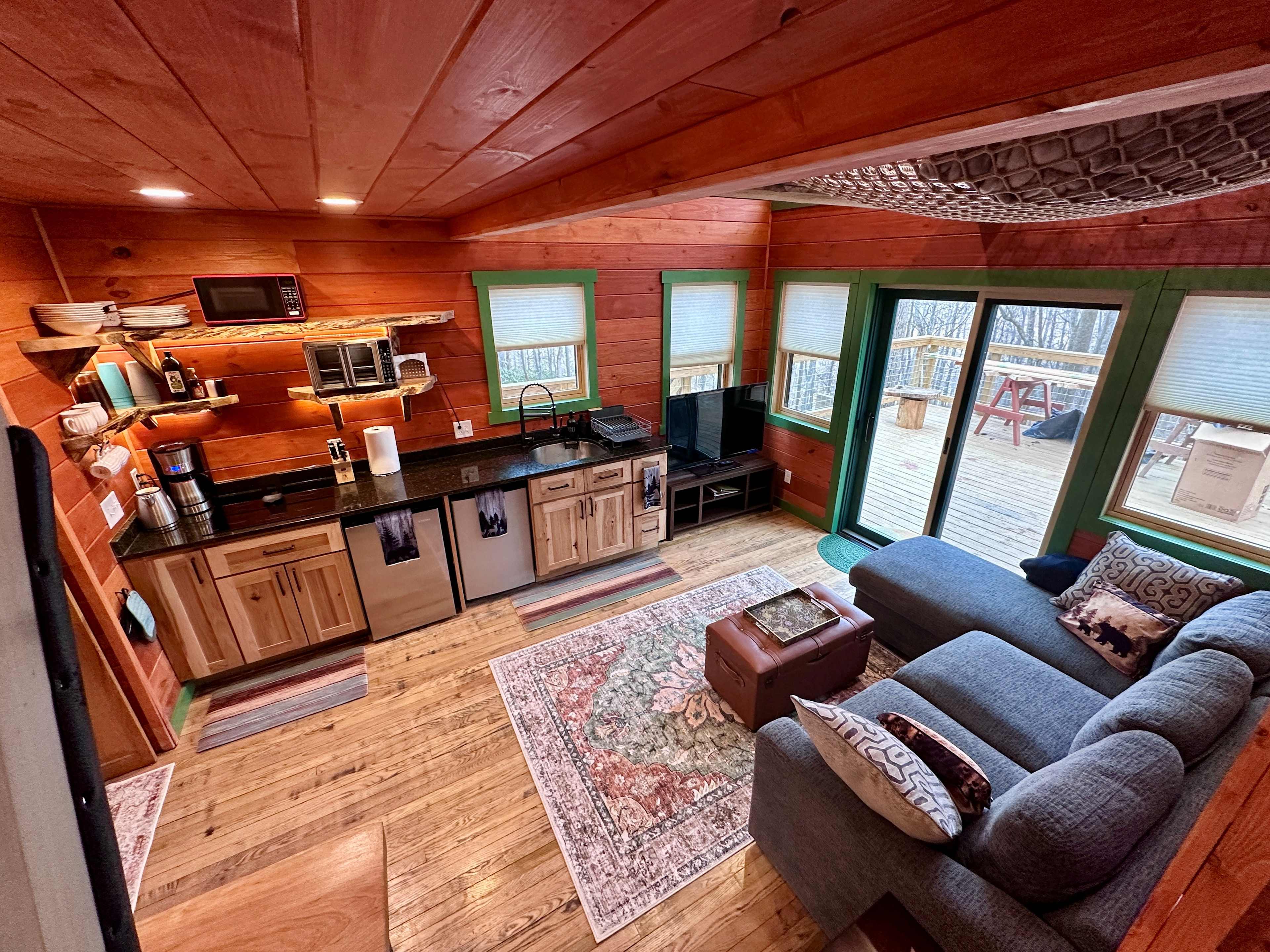 Welcome to the grand opening of the Beary Cozy Treehouse! We're excited to share our newly completed treehome away from home nestled on Bearwallow Mountain between Asheville and Hendersonville. Finished in February 2026, the cabin is built between four mature mountainside trees and fully stocked with all the essentials. Inside the house you'll find one bedroom, one bathroom, living room, and loft with hammock net. The outdoor space includes a large deck with rocking chairs and hot tub. The bedroom has a queen bed and memory foam mattress. The bathroom comes complete with a three headed waterfall shower that can also turn the space into a cedar lined steam room. The living room has one side entirely walled with picture windows facing out to Apple Valley, a chaise sectional couch that converts to a queen size pull out bed, and Roku TV. The kitchen contains a small fridge, small freezer, four burner cooktop, air fryer, microwave, blender, and coffee maker. Nestled behind the stairs is an old school diner bench dinette with fresh Cherry wood slab table. Upstairs you'll a cozy loft space with a queen size pull out couch and hammock net. Curl up in a blanket, kick your feet up and get a bird's eye view from the tree tops through the loft windows. We've got wifi, towels, linens, a guidebook and all the basics waiting for you. We're excited to share our new mountain lodge with you in the first year and look forward to making many improvements in the future. Come stay and enjoy all that Apple Valley has to offer. We'd love to hear your feedback and ideas for making the space even more special. Enjoy your stay and your time amongst the beautiful blue ridges!