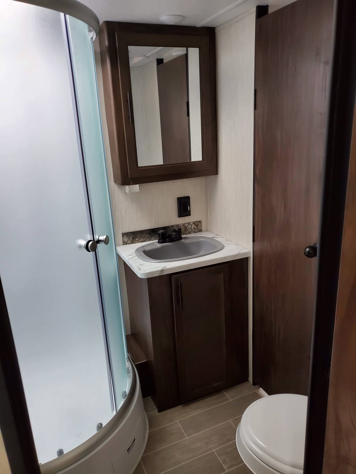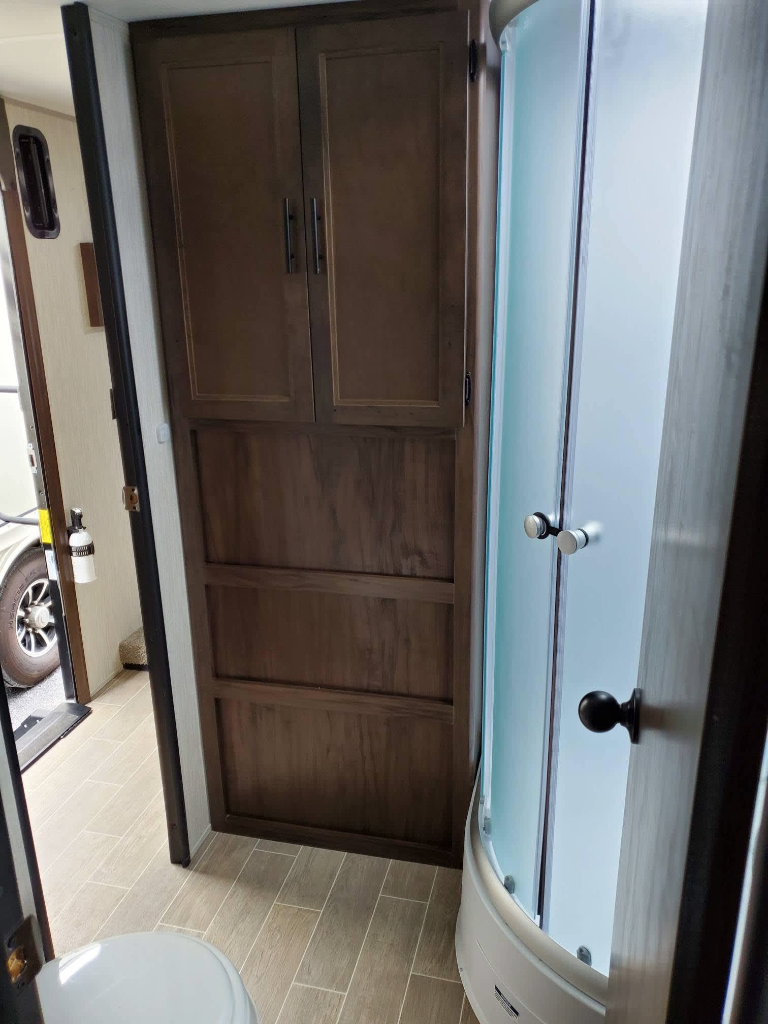 RV living on a farm setting with electric, kitchen and bathroom.