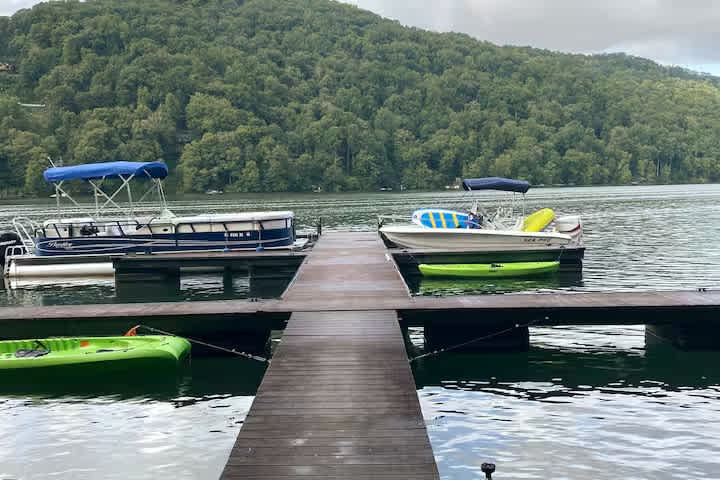 Kick back and relax in this calm, stylish space. This beautiful Chalet is located near Nantahala Lake in the beautiful mountains of western North Carolina, surrounded by the Nantahala National Forest and Smoky Mountains. Nantahala Lake sits at 3,012 feet in elevation one of the highest lakes. The property is just shy of 1 acre and sits on top of the hill surrounded by nature. It is located in the Little Choga gated community right outside of known town Andrews, NC. The space Dream Chaser Chalet is a 3 bedroom 3 ½ bath BOHO/Rustic style chalet. We wanted to bring new and vintage together to stay true to the area and home. It’s in a quiet secluded community in the mountains. PLEASE NOTE: Although we love fur babies the chalet is NOT suitable for them due to severe allergies. Guest access Tri-Level Interior: Main Floor- Dreamers Suite (king bed, dresser, night stand, tv w/Firestick, and ensuite) Half Bath Large Chalet Windows in Livingroom (best for views, lighting, and stargazing) Living Room with Fireplace Kitchen Dining Room (table for 6) Laundry Room Second Floor- Bear Necessities Room and On Lake Time Room Jack and Jill Bathroom (shower with tub) Twin Sofa Bed and Loft (7th guest bed) Basement (with windows and an exterior door)- Media Room Game Room Rustic Full Bath (stand up shower) Mini Fridge (Please Note: The garage is not for guest use as well as two owners closets) Other things to note DREAM CHASER AMENTITIES: Access to the lake Private Docks Community Picnic Area Kayaks- (1) Tandem “two persons” and (March-October) Paddle Board (March-October) Water Tubes Outdoor Wood Burning Firepit and Adirondack Chairs Outdoor Propane Grill and Picnic Table Outdoor Propane Firepit (located on porch) Outdoor Hamock Porch Swing 75” TV in Media Room with Sectional with DVD Player and Firestick XBOX with Kinect (perfect for JUST DANCE competitions) Ping Pong/Air Hockey Table Horseshoe Large Size Jenga Cornhole Dartboard Numerous Board Games and Cards Washer and Dryer WIFI (StarLink) WIFI CALLING (For your use due to the lack of cell phone coverage in area) Two Exterior Camera for Safety Purposes DOCK ACCESS: If you have a boat you can dock it a few feet from where you are staying. If you do not have a boat and would like to rent one Lakes End Marina.