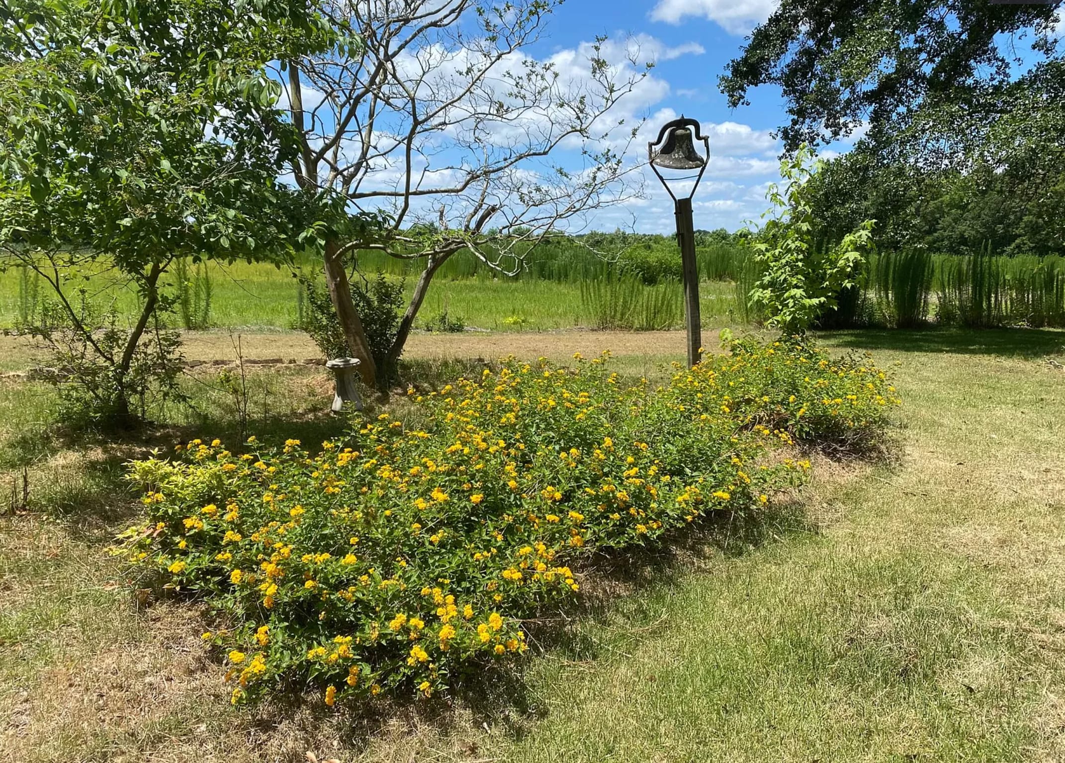 Discover The Secret Garden, a peaceful sanctuary nestled directly behind our 1870s historic farmhouse in the large backyard. Shaded by the wide, leafy canopy of our stately pecan trees, this grassy site offers a quiet and airy escape that feels like a hidden corner of our 33-acre farm. The backyard overlooks our farm fields. The Space: This site is level and grassy, perfectly suited for one tent and up to 4 guests. It provides the safety and comfort of being close to the farmhouse while still offering the tranquility of life on a historic estate. Amenities & Access: You’ll have a private fire ring for evening gatherings under the pecan grove. Please note that this is a primitive site with no on-site toilet, so please come prepared to "pack it out" with your own portable camping toilet. You are just a short stroll away from the peaceful farm pond and our majestic old-growth cedar and oak trees.