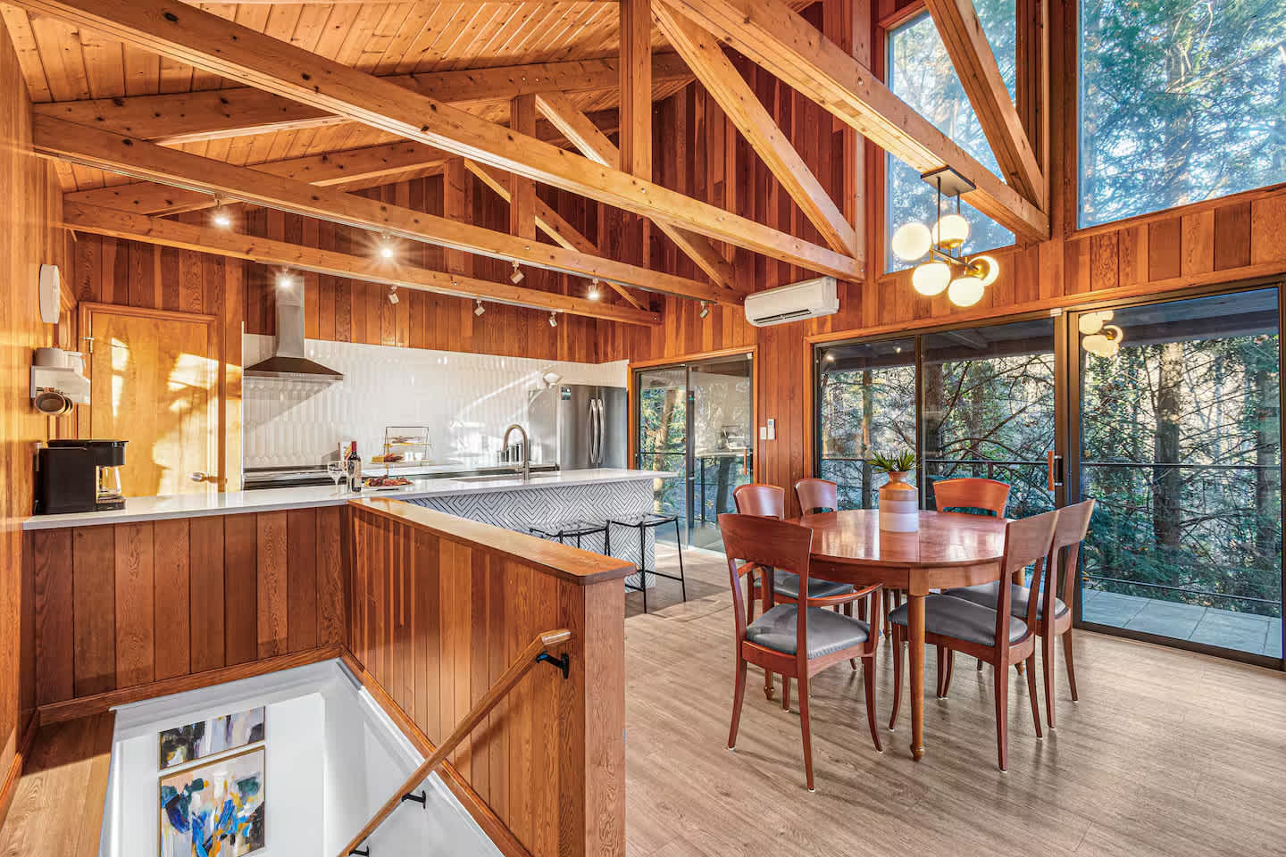 Escape to the Maggie Pines Hideaway! Nestled in the trees overlooking Maggie Valley Club, enjoy a fully-renovated mid-century chalet offering panoramic mountain views from every room in the house, including the hot tub. Whether you're hiking, golfing, or taking the motorcycle out for a spin, you have everything you need in this beautiful mountainside retreat. Book now for an unforgettable holiday! The space Property Overview: • Meticulously renovated chalet in Maggie Valley • Features panoramic windows offering breathtaking mountain and golf course views Outdoor Amenities: • Outdoor hot tub overlooking the mountains, with provided beach towels and regular servicing • Propane fire pit and grill available for gatherings on the expansive deck Kitchen: • Open, modern kitchen with new appliances and dining area with scenic views Lower Level: • Family room with large sofa and 65" Smart TV • Board games and a Pacman arcade machine for entertainment • Corridor leads to additional bedrooms, a laundry closet, and a full bathroom Bedrooms: • Primary suite with a king-sized memory foam bed and 55" Smart TV • Second bedroom: two twin beds, cozy swing, and projector for creating a galaxy experience • Third bedroom: queen-size memory foam bed, workstation, and 55" Smart TV • Fourth bedroom: king-size memory foam canopy bed, spacious closet, settee, and 55" Smart TV Guest access Parking for 3 vehicles maximum. Mountain roads to the chalet are fully paved, curvy, a bit steep – you’ll be a pro after one trip up! Trailers not recommended. Four wheel drive is highly recommended for the months of November-March. Other things to note Dog Policy: • Dog-friendly property (fees and exclusions apply) • $100 fee for the first dog, $50 for the second dog • Pets must be registered; unregistered pets may result in eviction without a refund Near Attractions • 15 minutes away from Waynesville • 38 minutes away from Downtown Asheville Damage Protection: • $5,000 in "All-Risk" Damage coverage in addition to Airbnb's AirCover • Covers most accidental damage caused by guests • Exclusions include normal wear and tear, infestation, or prior damage Guests can enjoy their stay with peace of mind, knowing they are protected against accidental damage through Waivo's damage protection plan.