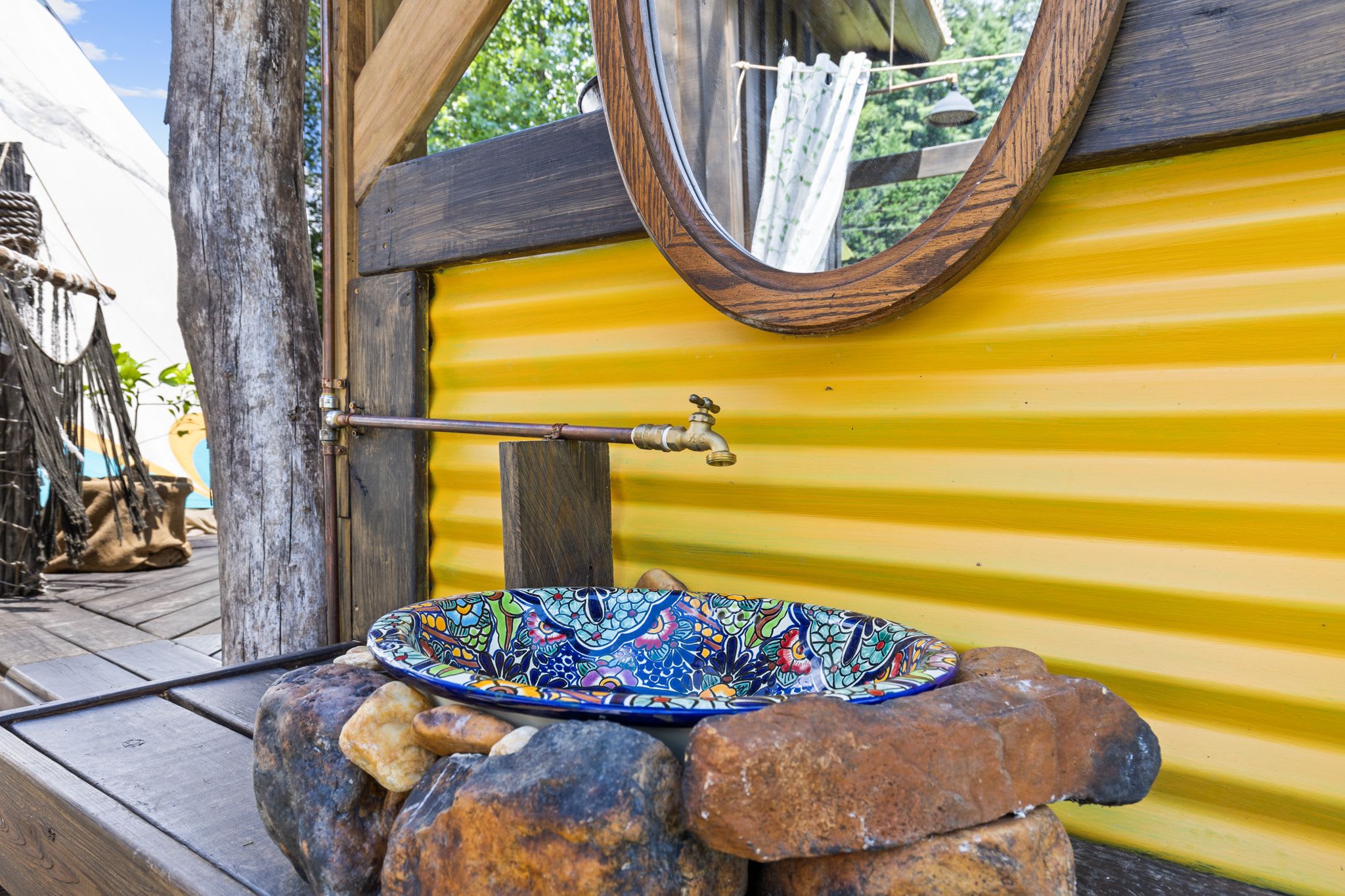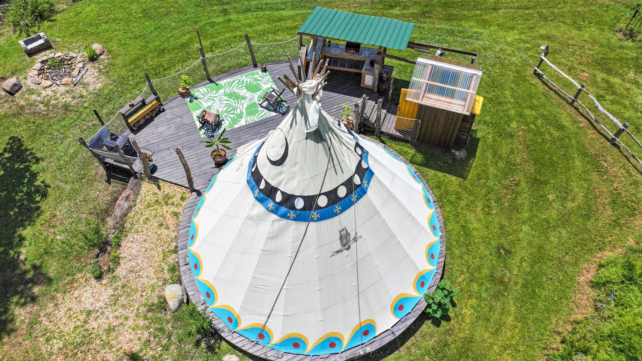 Book the all TEEPEE AREA for YOUR PRIVATE PARTY Creek Front Covered Common Living Area (28-foot diameter) Outdoor Kitchens Outdoor Showers Bath House Barbecue Area Fire Pit Game Room with Pool Table Playground Outdoor Games Area