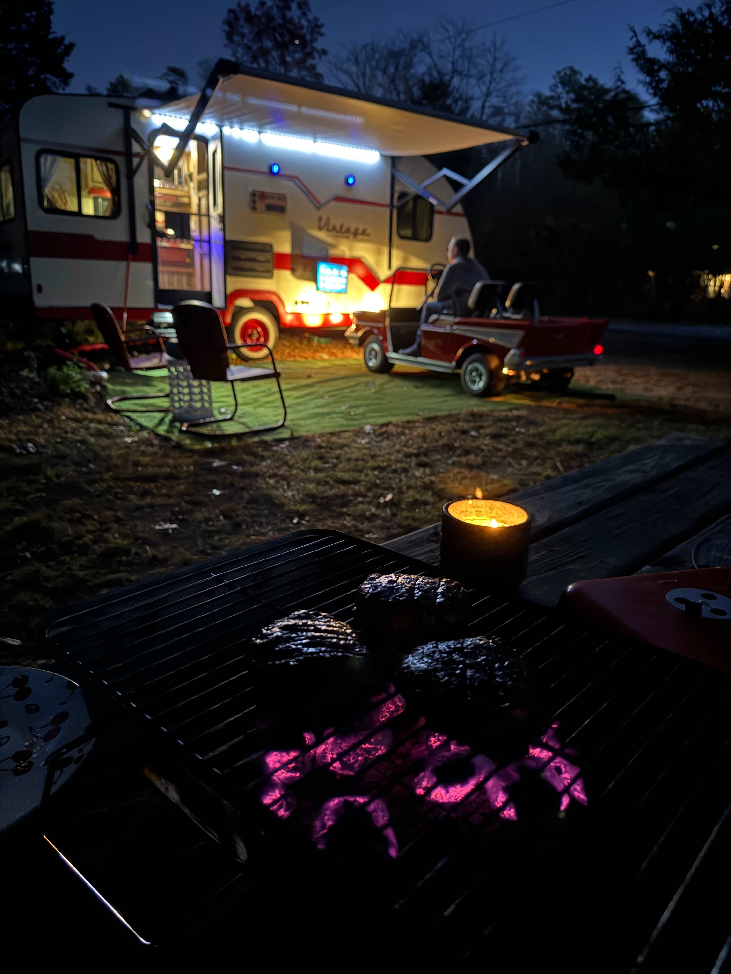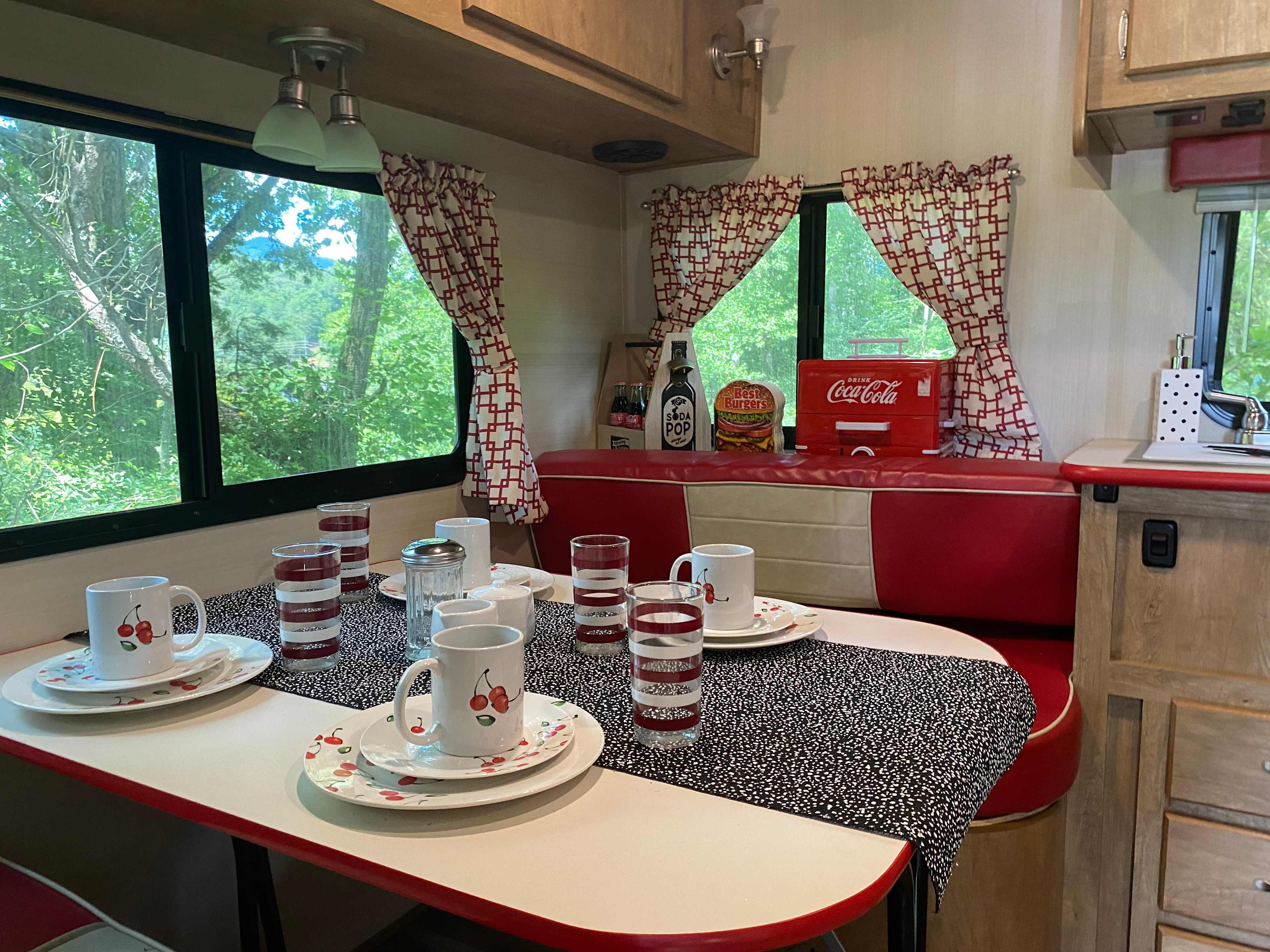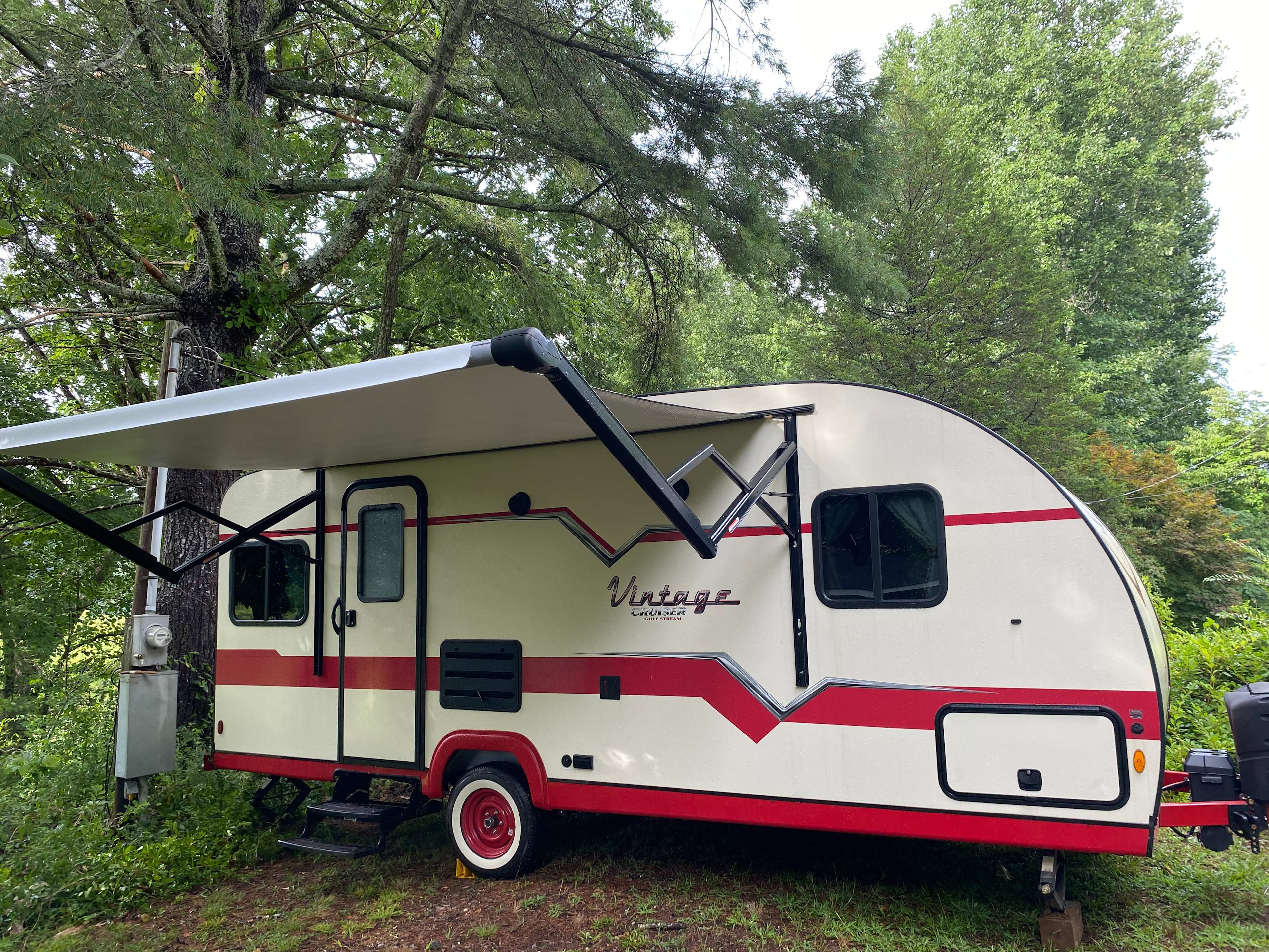 2021 Vintage camper in Franklin, NC. Just under 1 acre with 300 feet of water frontage with tons of wildlife - bald eagles, turtles, mallard ducks & cranes. Very private but also only a few miles away from the historic town of Franklin where you'll find incredible businesses such as Bent Willow Coffee/Bakeshop, Lazy Hiker Brewery and Slanted Window Winery. Numerous waterfall trails, hiking trails, and rock climbing opportunities nearby. Camper is situated where the Little Tennessee River empties into Lake Emory. Camper stay includes all the fixings for burgers, glass bottle cokes, charcoal, lighter fluid, and enough wood for 1 campfire. Enjoy evenings around the fire pit, pic-ic outdoors, playing horseshoes, cornhole and more! Catch a movie from our 1957 Chevy golf cart-a drive in experience! Driveway is very accessible, no 4-wheel drive required.