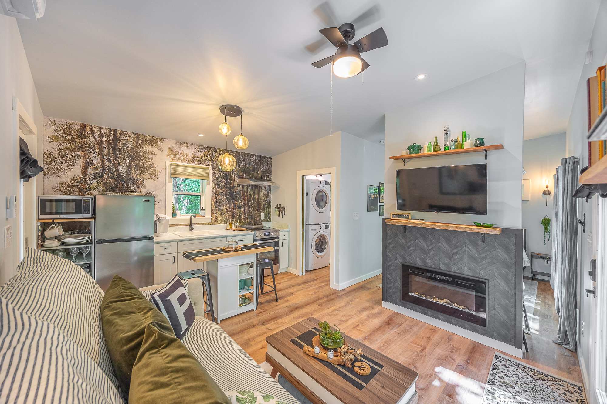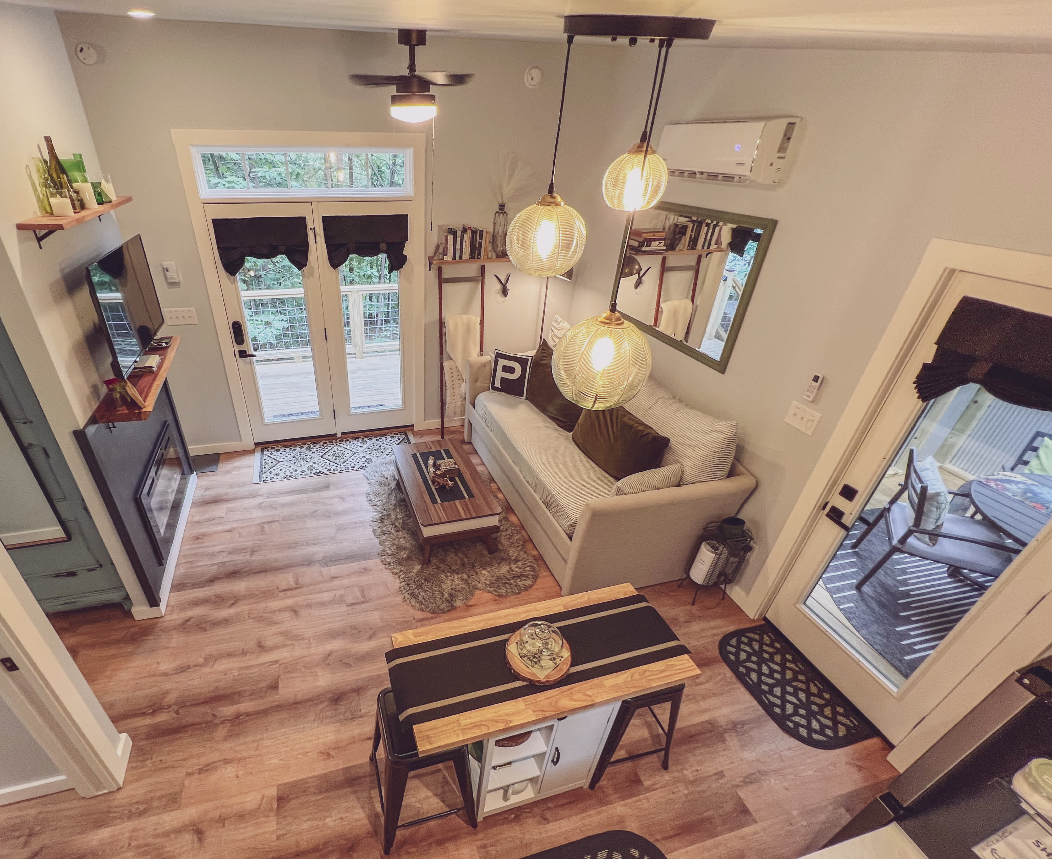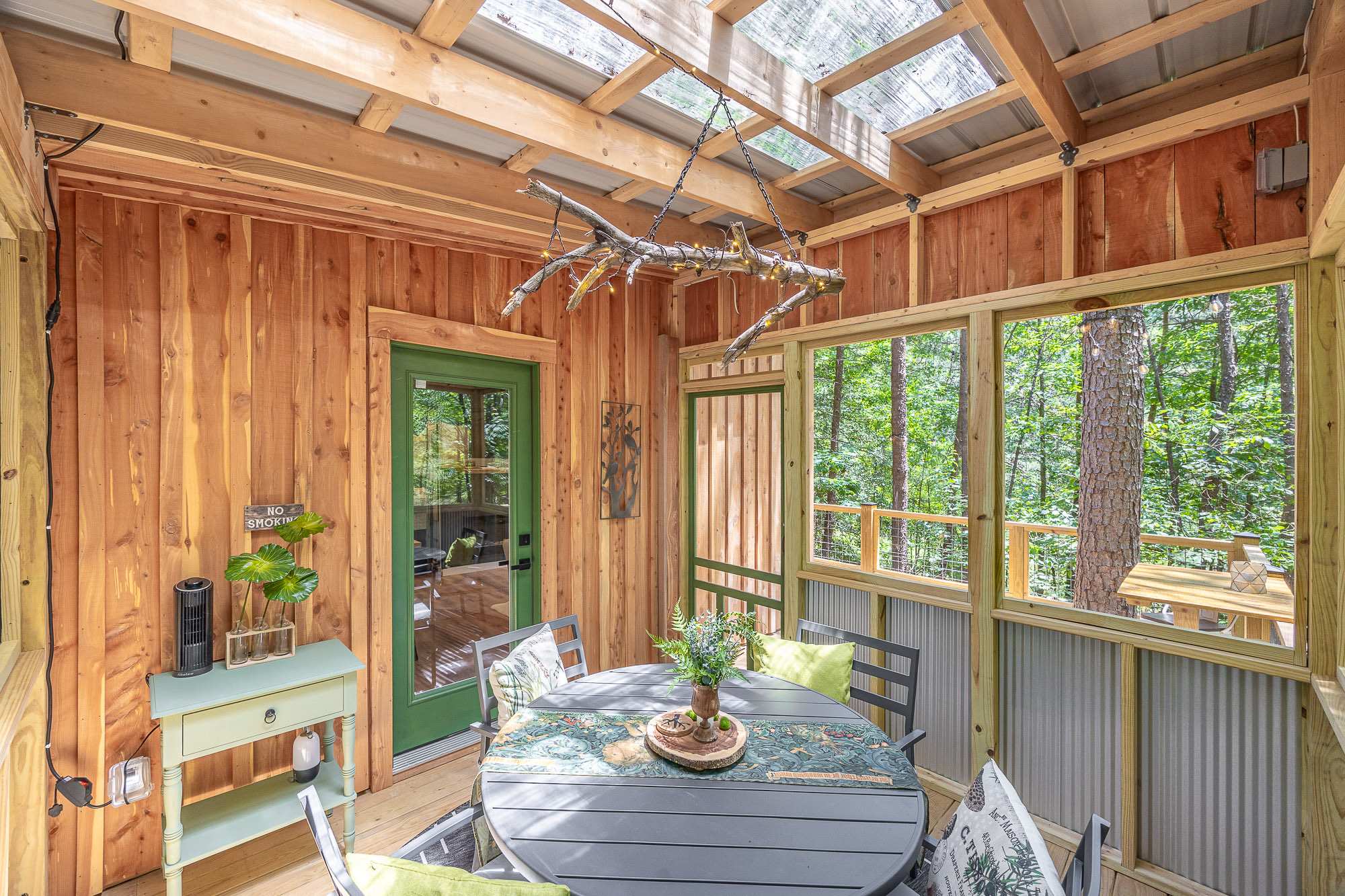 Nestle into your own corner of our 8 acres. Kick back in a forest setting and leave the rest behind. Wander the nature path. Sit on the screened-in porch or by the crackling firepit, take an outdoor shower, or soak in the roomy spa. Enjoy rural foothills living in Western NC, conveniently located near Hickory, Morganton, Historic Valdese, and Lenoir. There are great parks and lakes to explore, with a boat launch just 4 miles away. Check out a local winery or brewery, and take a short drive to the breathtaking Blue Ridge Parkway. The Perch tiny treehouse is a custom-built tiny house (just under 400 square feet), situated in a mixed forest. It’s perfect for a couple or cozy for a small family. The modern design features whimsical, storybook touches—like stumbling across Granny’s cottage in the woods, but way cooler. The space offers a screened-in porch with dining for four, plus a two-seater bar top built around a big pine through the deck. Cook up a tasty meal in the full kitchen or on the charcoal grill. Wander along our little nature path through the forest. Hammock swings are available creekside. Enjoy a soak in your private hot tub, then sink into the daybed, turn on the fireplace, borrow a book from our mini library, or watch a movie. The Perch has its own dedicated high-speed internet for our guests.Nestle into your own corner of our 8 acres. Kick back in a forest setting while leaving the rest behind. Wander the nature path. Sit on the screened in porch or by the crackling fire pit, shower outdoors (or in) or soak in the roomy spa. Rural foothills living in Western NC, convenient to Hickory, Morganton, Valdese & Lenoir. Great parks & lakes to explore. (Boat launch is 4 miles away). Check out a local winery/brewery. The Blue Ridge parkway is a short drive & absolutely breathtaking. ‘The Perch’ Tiny treehouse is a custom built tiny house (just under 400 square feet). It is situated in a mixed forest. It is heated and cooled with a mini split for year-round comfort. Perfect for a couple or cozy for a small family. Modern design with whimsical storybook touches. It’s like stumbling across granny’s cottage in the forest, but way cooler. We don’t charge for “extras“. Linens (including beach towels for the hot tub), charcoal, firewood, coffee/filtered water, & soap/shampoo are all included with your nightly rate. There is a screened-in porch with dining for four plus a two-seater bar top by the big pine through the deck. Cook up a tasty meal in the full kitchen or on the charcoal grill. Wander on our little nature path through the forest. There are hammock swings available creekside. Enjoy a soak in your private hot tub & then sink into the daybed, turn on the fireplace and candles, borrow a book from our mini library or watch a movie on dedicated hi-speed internet. This is a private home with its own gravel driveway & parking area. There is one outdoor camera facing only the driveway. The flat, mulched path from your vehicle to the Perch is approximately 40 feet. It is suitable for about any vehicle to access & room for truck and boat/utility trailer to park (with an experienced driver). Please note this is a rural/country environment. While guests find our area very peaceful, you may hear a passing vehicle/lawn mower from time to time, encounter wildlife & sounds common to country life such as a dog bark, woodpeckers pecking, a tractor, a dirt bike/4 wheeler, children at play or even hunting/target practice in the distance. There is a queen bed & 2 twins. A partition is between the sleeping areas, but no door.