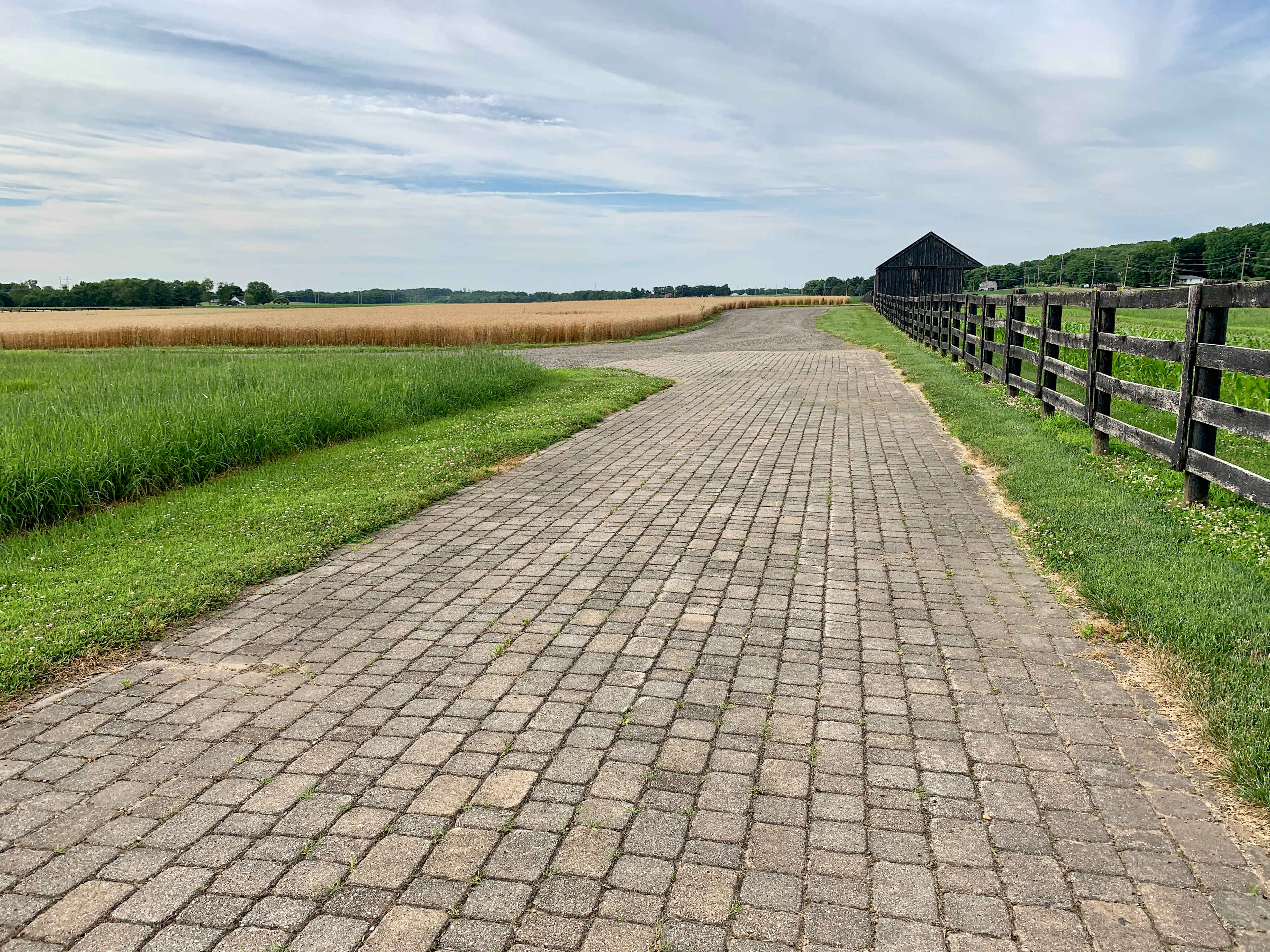 Follow the driveway past the Farm Stand to spot 1. It is a pull-in/back-in spot. Electric and water hookup. Level spot on pavers. Located between two livestock pastures.