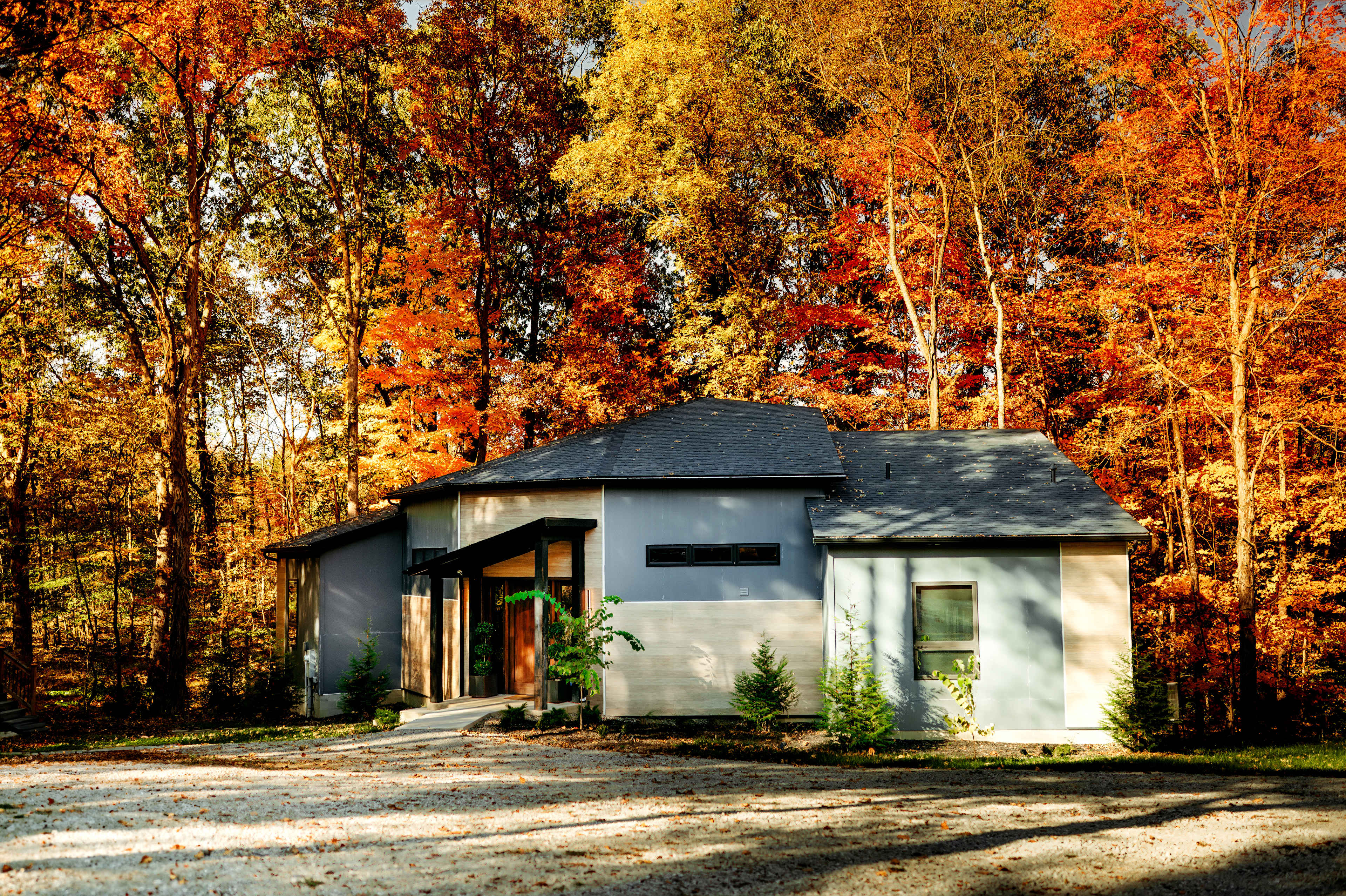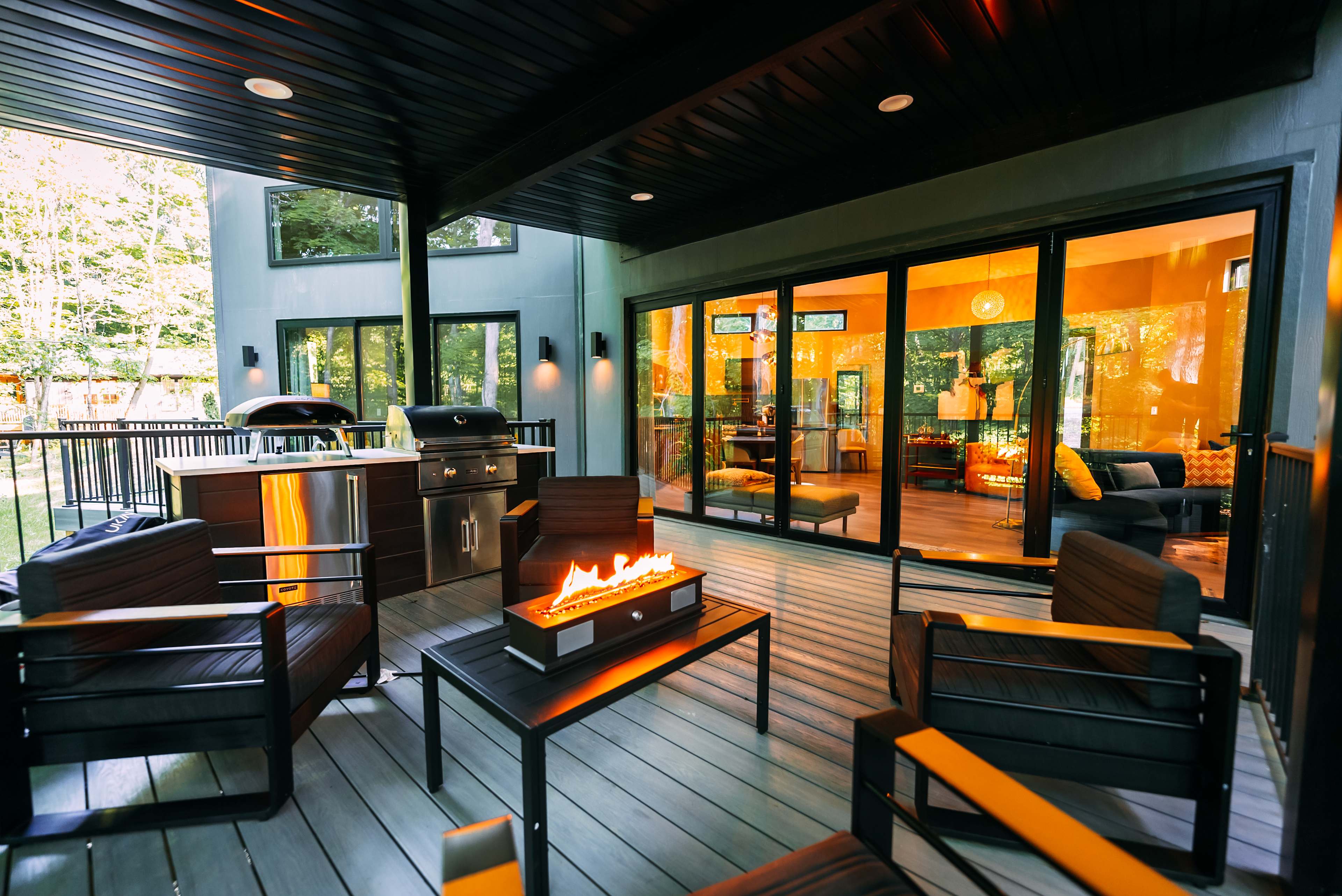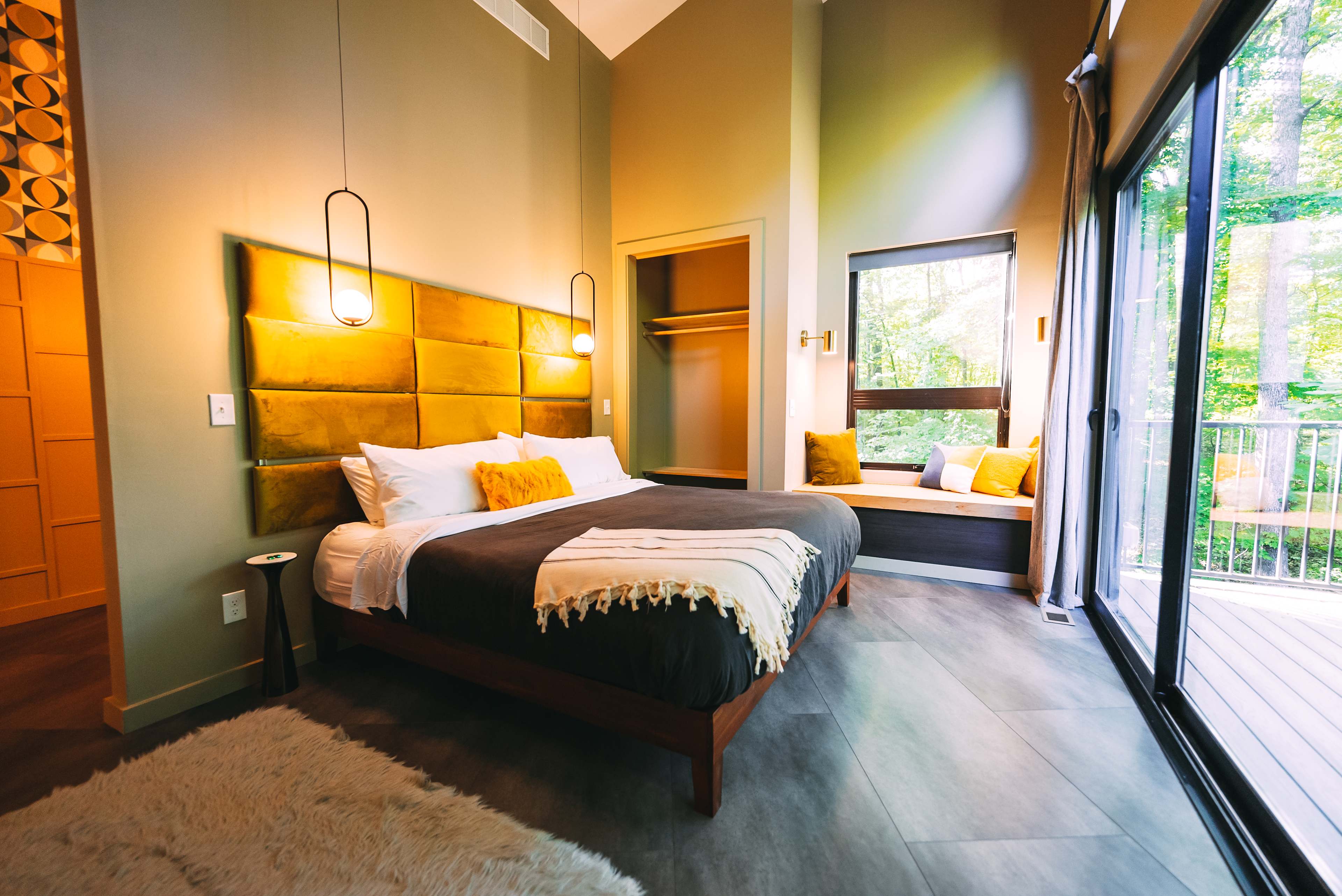 Twelve34 House is a modern, midcentury-inspired cabin that offers luxury amenities for the person looking to elevate their vacation. The glass wall opens the indoor chef's kitchen to the outdoor kitchen with gas grill, beverage fridge, and pizza oven on the back deck. Comfortable seating and a tabletop firepit complement the covered area that overlooks the forest and ravine. The butterfly shape of the house offers bedroom suites in both wings, complete with spacious designer baths and king beds with organic bamboo linens and expansive views to the forest just outside the 12 feet sliding doors to the back deck. Bathrooms offer organic Turkish bath towels and organic body products. The living area has generous seating on the 11' feet long curved sofa, a smart television with bluetooth speaker (connect your phone for music too!), DVD player, a record player with vintage vinyls, and a bar cart for you to supply your own beverages. A hot tub tucked in the trees overlooks a second firepit for the ultimate fire & water experience. Certified accessible for those with limited mobility. Twelve34 House shares a parking area and EV charger with our tiny GloCabin and sits on 32 beautiful wooded acres with trails. The location is 5-20 minutes from everything Hocking Hills is known for and just 5 minutes to downtown Laurelville with access to grocery, gas, and multiple small restaurants.Twelve34 House is a luxury, mid-century-inspired modern cabin that sits perched at the edge of our ravine on our 32 beautiful wooded acres. Inside the butterfly-shaped house you will find a large suite in each wing. King beds with organic bamboo & linen bedding encourage you to snuggle in and enjoy the incredible view from the expansive window wall with 12 feet wide slider to the back deck. Like the bedrooms, the designer baths are spacious and offer organic Turkish cotton bath towels and organic body products In the living area, the 16 feet wide glass accordion wall opens the indoor chef's kitchen to the outdoor kitchen complete with gas grill, beverage fridge, and pizza oven on the back deck. Comfortable seating surrounds a table top firepit on the covered area. A vintage midcentury electric fireplace warms the living area that includes an 11 feet long curved sofa, smart television with bluetooth speaker (connect your phone to play your own playlist), DVD player, record player, and vintage vinyl. A bar cart is ready for your beverages of choice. The hot tub sits under the trees and overlooks a wood fire pit for the ultimate fire & water experience. Twelve34 House shares a parking area and EV charger with GloCabin, our tiny vacation rental. Guests are encouraged to hike the trails on our beautiful property while also enjoying everything Hocking Hills has to offer, just 5-20 minutes away. Downtown Laurelville is just 5 minutes and has a grocery, gas, and multiple small restaurants. Handicap accessible certified.