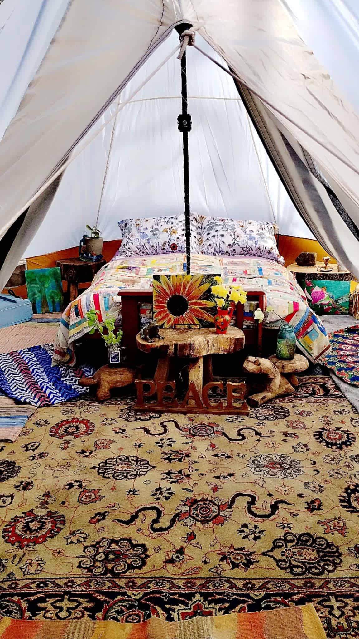 Escape the ordinary and embrace the soulful rhythm of the countryside in our Bohemian-style tent, nestled on a peaceful working farm. Inside the tent, you’ll find a comfy bed, boho décor, and charm in every corner of your free-spirited sanctuary. Step outside to your private fire pit, a hammock swaying under the trees, and breathtaking stargazing after sunset. Whether you’re journaling by candlelight, or practicing yoga at dawn, this is your space to be wild. •open tent spots with personal fire pit •large bohemian-style tent •hammocks overlooking the emerald-toned creek. •find our hidden queen size swinging bed in the trees •hanging rope swing for the brave hearts (swing to your own risk!) •farm animals such as chickens, chicks, pigs, piglets, goats, horses etc. •farm fresh eggs available for purchase •firewood available on an honor system •learn to milk goats and taste fresh goats milk •kayaks •Canoeing •electric bikes for rent •fishing •420 friendly Come embrace the slow, soulful rhythm of the countryside on the farm. You won’t want to leave this charming, one-of-a-kind place.