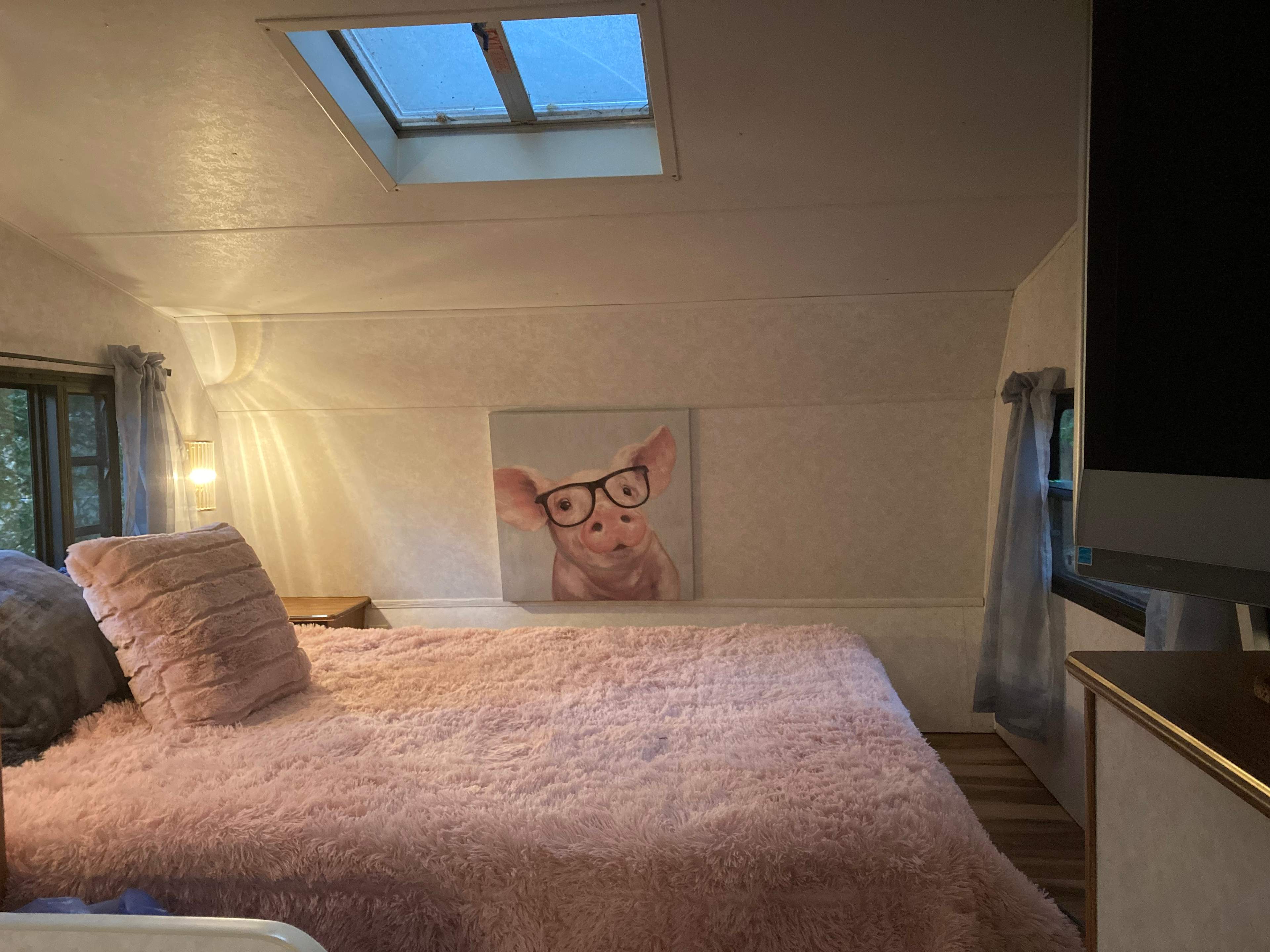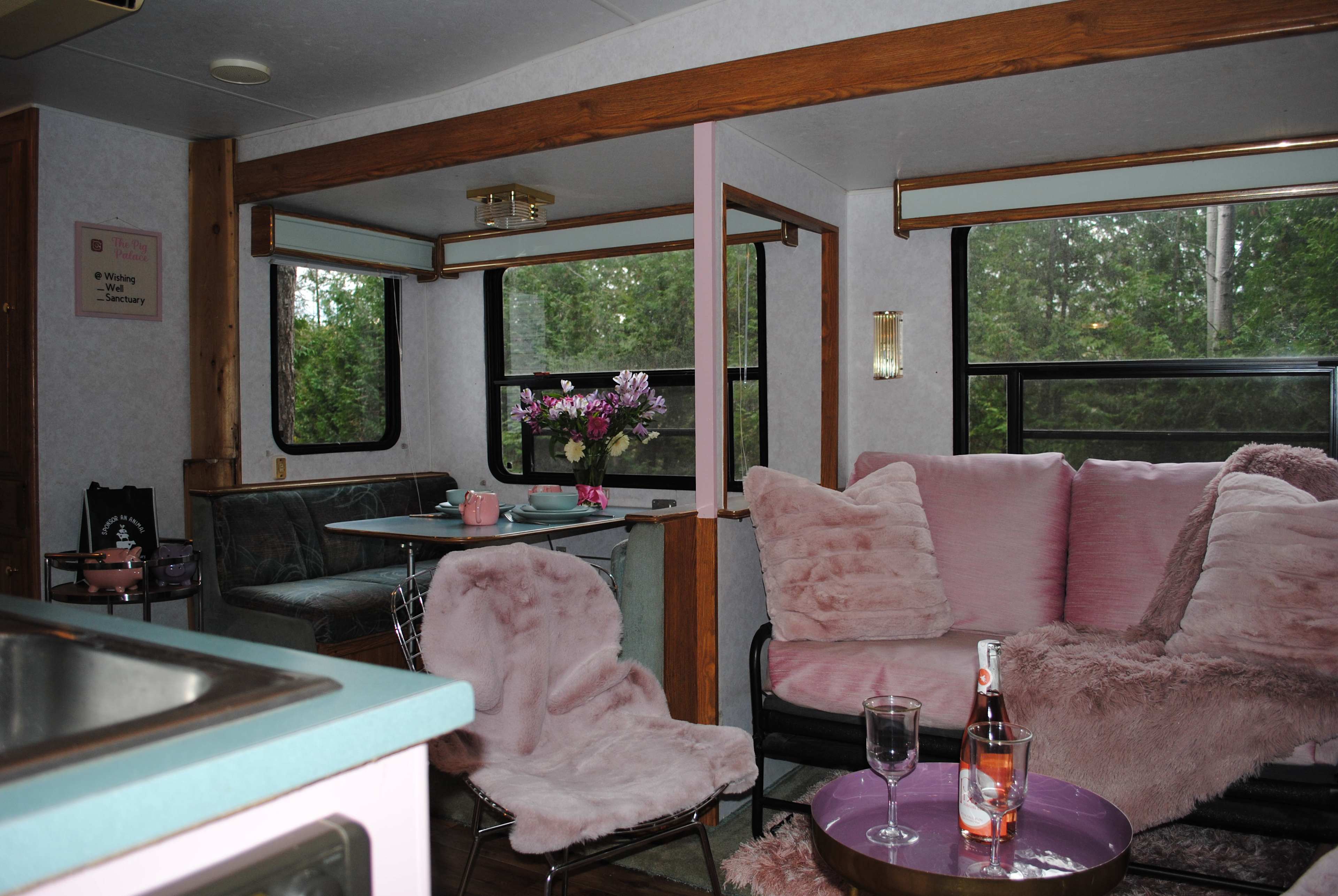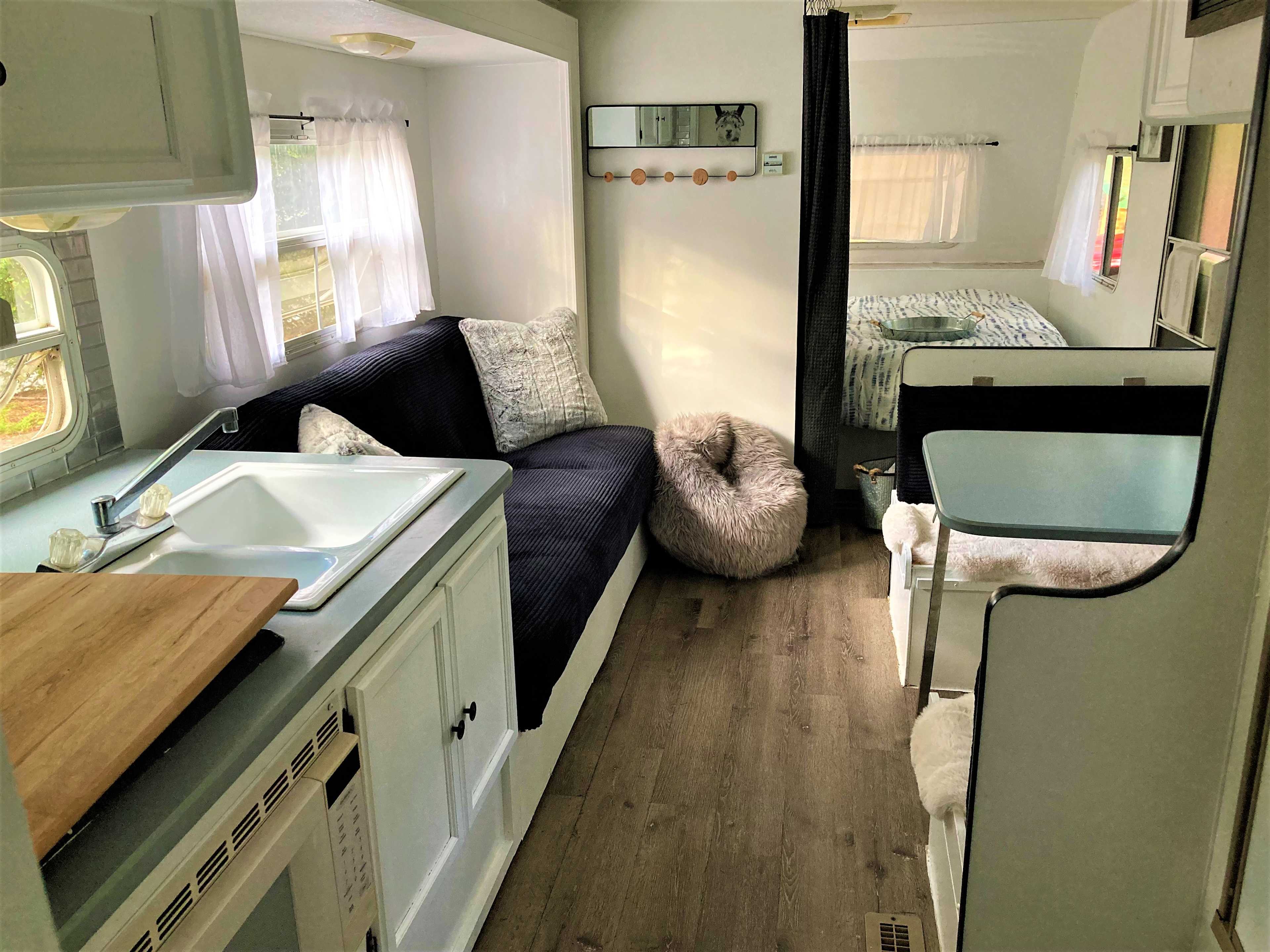 Our gorgeous trailer has a queen size bed, fold down bed, bunk beds and all the comforts of home.
