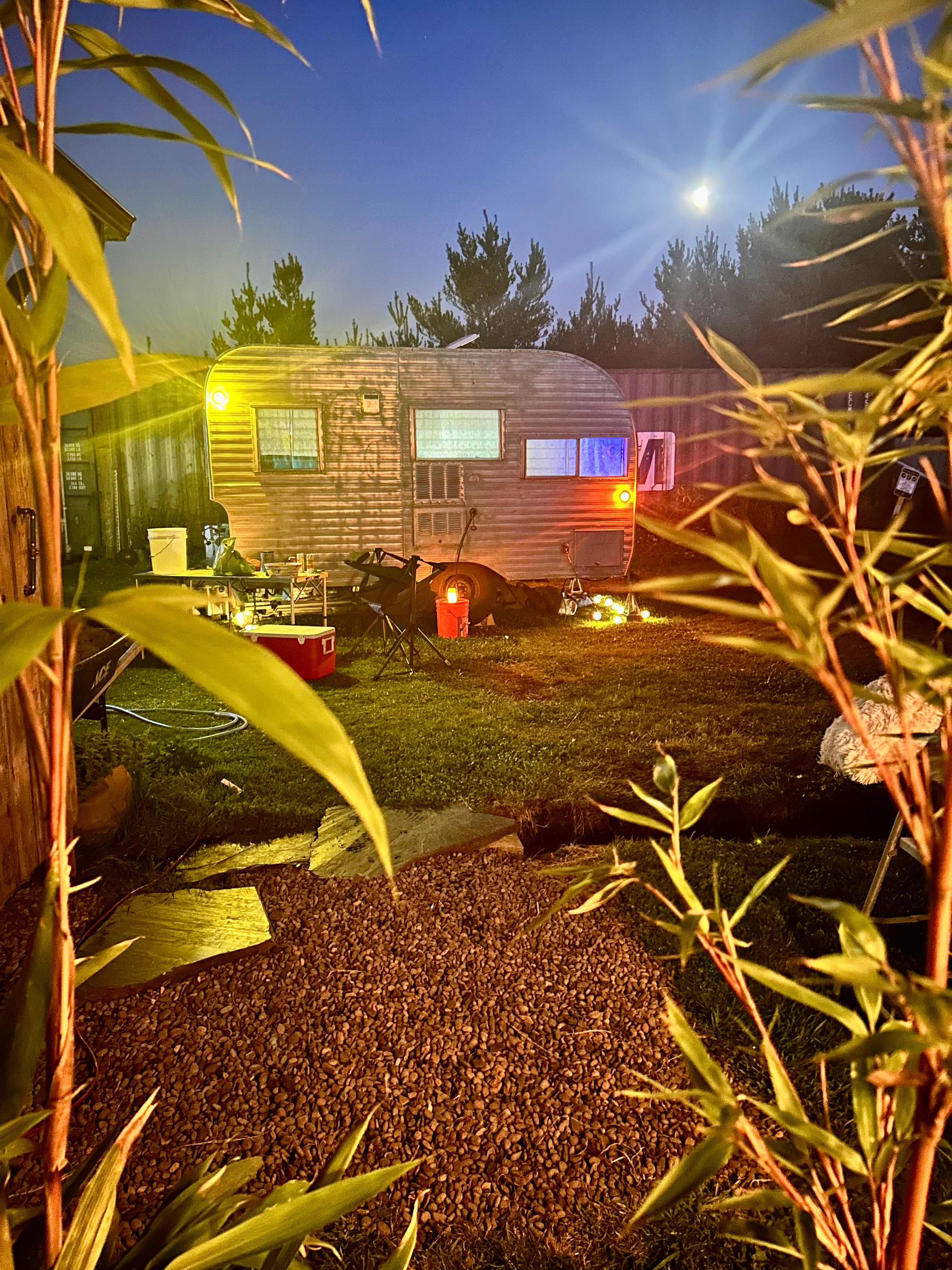 :: OFF SEASON RATE SPECIAL :: Select Your Dates To View Discounted Rate. Site 1 aka Bamboo Camp is sunny and south-facing with garden, mountain and forest views. You can hear the sound of the ocean from this site especially when the waves are big. It is situated in a small meadow that is about 600 sq ft. On the north and east sides it is surrounded by an ever growing collection of medicinal and biodynamic plants, colorful flowers and plentiful bamboo. Looking south you will see the hemp (cannabis) field and the vegetable garden is to the west. This spot is perfect for unloading your boards and/or bikes and getting situated for your next adventure(s). There is plenty of space at Bamboo Camp to spread out a bit. Carefully drive straight in or back your vehicle in through the gate and get set up. Put out your tent, pop up your camper or slide open your van door. Feel free to set up camp chairs, portable table, solar shower, etc. The portable toilet is located nearby this site and solar and motion lights make it easy to see at night to walk around if needed. Potable water is also just feet away via a spigot/hose. Recycling, compost and trash bins are provided for guests. Just remember to always pick up after yourself and leave no trace. Easy access to our outdoor shower - it's open air with no enclosure so bring a bathing suit toi use while showering. Afternoons can be breezy and tents should be staked down. Please keep your pet on leash at all times while on our property. Great dog walking areas right outside our gate and in town and on the beaches.