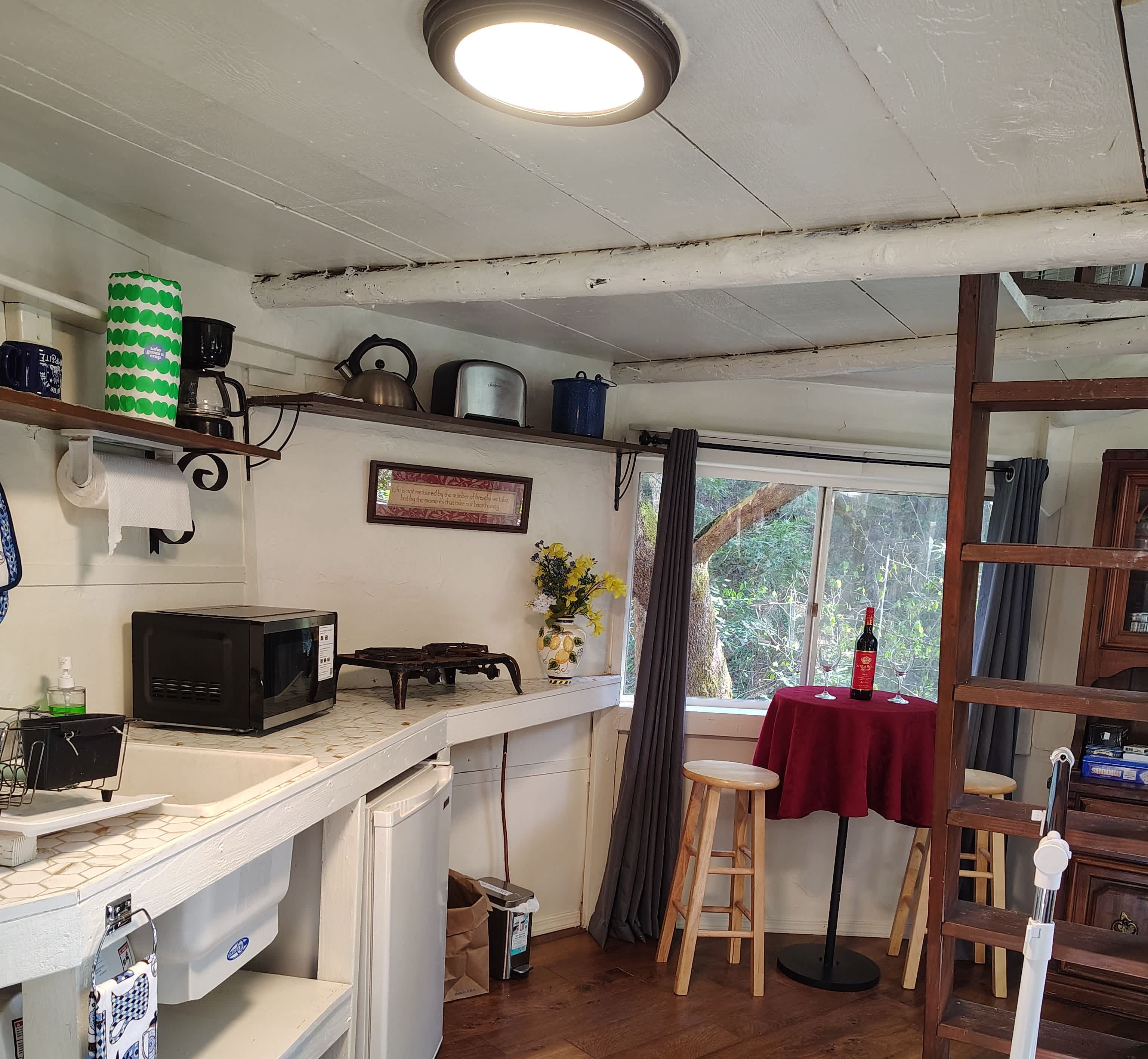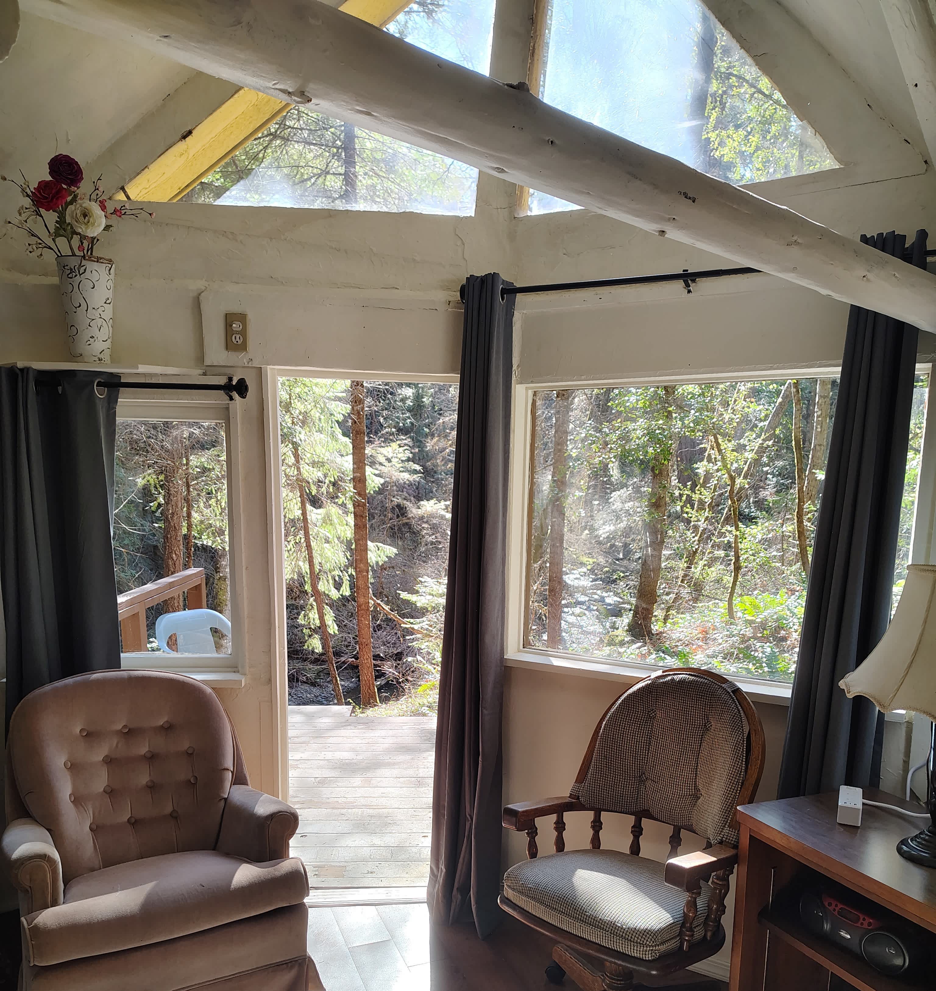 You will appreciate the peace and quiet of this little cottage on Rock Creek, situated on 11 acres of forest in Williams Oregon. The only sounds you'll hear are the birds in the trees and the flowing creek water. Enjoy sitting on the deck overlooking the confluence of Rock Creek and East Fork Williams Creek. A bridge crosses Rock Creek and there is a hiking trail beyond. Our garden hot tub is a welcome place to soak and enjoy the stars at night. Its an older tub but still keeps the water at 102 degrees. Our cabin has a kitchenette with a small fridge, sink, 2-burner gas stovetop, microwave, teapot, toaster, and 2-cup coffee maker, plus a few dishes, cutlery, and pots and pans - enough for simple meal preparation. Coffee, tea, sugar, and creamer are provided along with a dozen fresh eggs from our chickens. The cabin has a small woodstove as its only heat source. A little wood can be provided, and we provide newspaper, matches, and fire starters. There is an abundance of kindling around the property - great for getting a fire going. The stove holds 18" x 4" split logs, if you have some to bring. There are two smaller stuffed chairs, and two bar stools at a small bar-height table with views of the creek. The bathroom has a shower and vanity sink, and towels and toiletries are provided. There is hot and cold running water, although the 3-gallon hot water heater limits showers to less than 5 minutes. Nice sturdy steps lead up to the loft upstairs which has an 8" full-sized (wider than a twin but narrower than a queen) memory foam mattress with fresh linens. The loft is low and cozy which allows the camper to sit up on the bed but not stand up. A compost toilet is about 100 yards away, and has a rechargeable motion detector indoor light. Bring your flashlights to find the compost toilet as well as the hot tub as the property is very dark. WiFi is available and good in some locations. The password is listed in the binder on the hutch. Some games and puzzles are provided.This rustic octagonal cabin nestled in a forest overlooks Rock Creek. Cross the bridge and walk to East Fork Williams Creek. Cabin has a loft containing a comfy 8" thick memory foam standard (full) mattress with fresh bed linens. Below there is a sitting area with wood stove and two small padded chairs. Kitchenette has coffee pot, toaster, fridge, sink, and 2-burner propane stove. Coffee and tea provided. Bathroom has shower, and sink, with towels and toiletries provided. A compost toilet is 100 yards away.. Hot tub in garden also overlooks Rock Creek and a picnic table holds clean towels.