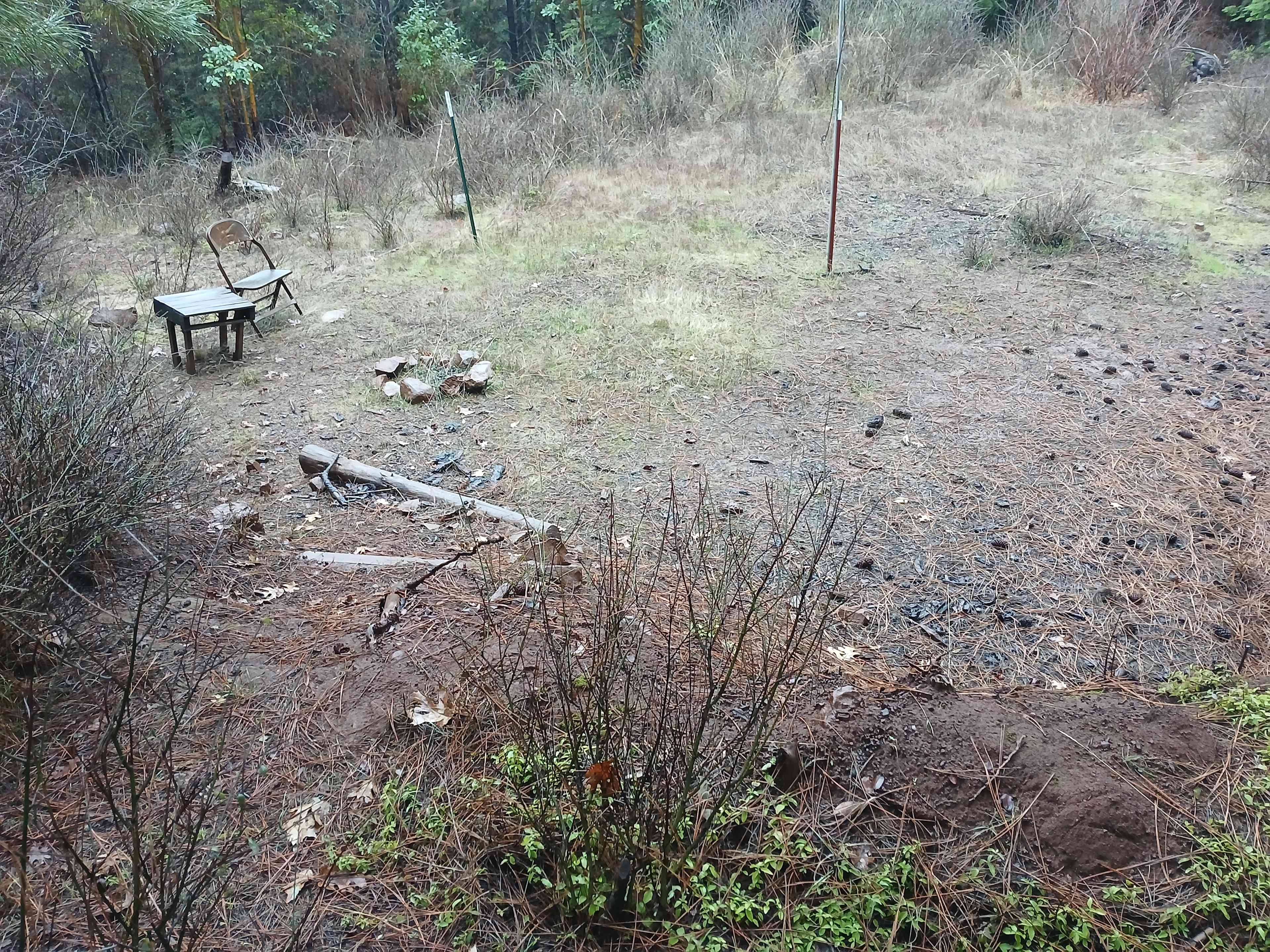 This site has a fire ring and a large flat spot for multiple tents. It's off the beaten path but the right vehicle can drive close to it. It's nestled down hill in thick forest close to the showers and less than a minute walk to the central spaces.