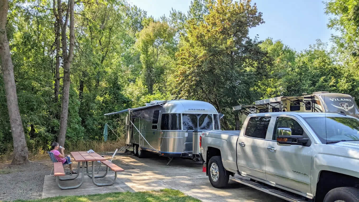 Gill’s Landing RV Park is a unique camping destination nestled along the picturesque South Santiam River in Lebanon, Oregon, providing a serene escape right within city limits. This charming city-operated campground features 20 paved RV sites equipped with full hookups, including water, sewer, and 30/50 amp electric service. Additionally, a select number of tent sites offer stunning views of the river, making it an ideal spot for nature lovers. Campers are drawn to the tranquil riverside setting, where they can enjoy fishing for trout, launching kayaks, or simply unwinding while watching the gentle flow of the water. The park is well-appointed with clean and secure restrooms and showers, accessible via key code for registered guests. A picnic shelter and a convenient boat ramp are located adjacent to the campground, enhancing the outdoor experience. Each site is furnished with a picnic table and fire ring, accommodating big rigs (up to 60 feet) while maintaining a cozy, intimate atmosphere. Families will appreciate the playground and open grassy areas available for recreation, and the campground is pet-friendly, with leashes required for furry companions. One of the standout features of Gill’s Landing is its proximity to historic downtown Lebanon, just a short walk or bike ride away via a scenic riverside trail. Here,