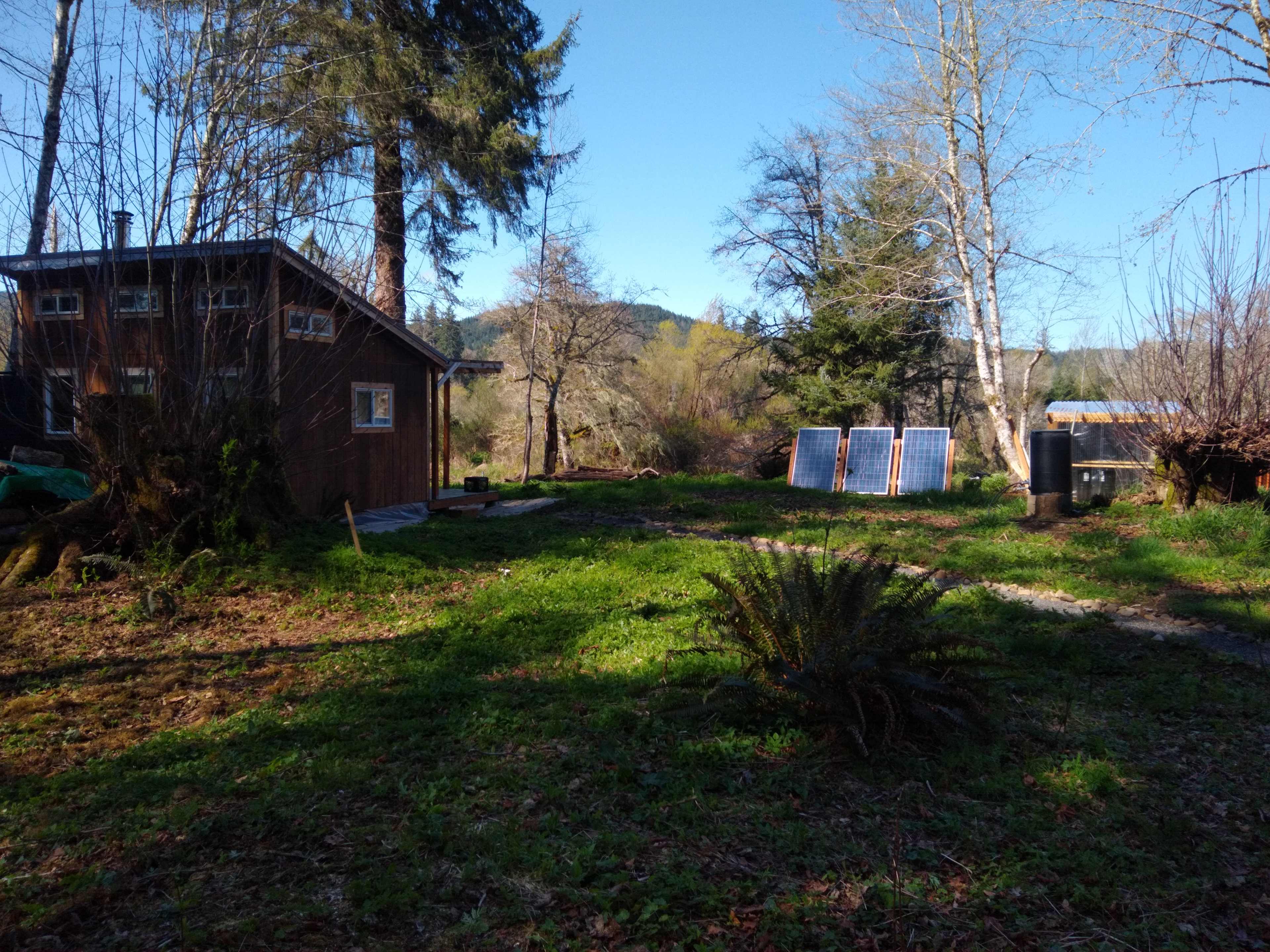 The campsite on the property is perfect for someone who wishes to spend their summer surrounded by the natural beauty of Northwest Oregon. The affordable price requires two-week minimum stays. One to three months is preferred. The campsite's fenced enclosure features an 8' x 8' sleeping shed and an 8' x 8' sunroom with a table, shelves and chairs. It also has a filtered rainwater system and a smokeless firepit with free firewood. The property has a solar system consisting of three 230-watt solar panels to power your electronics all day and night from April to November. The electrical outlet is located in the utility shed. On sunny summer days, there is enough power for the electric cooler to keep your food and beverages cold. Additional amenities include a one-person kayak and a compost toilet. The ground within the fenced enclosure is covered with reclaimed textile to help keep the area clean. The cell tower signal is strong enough for phone calls, but not always reliable for streaming videos. (The 12' x 16' insulated cabin on the property may be available in the future for off-season use at the same monthly rate.)