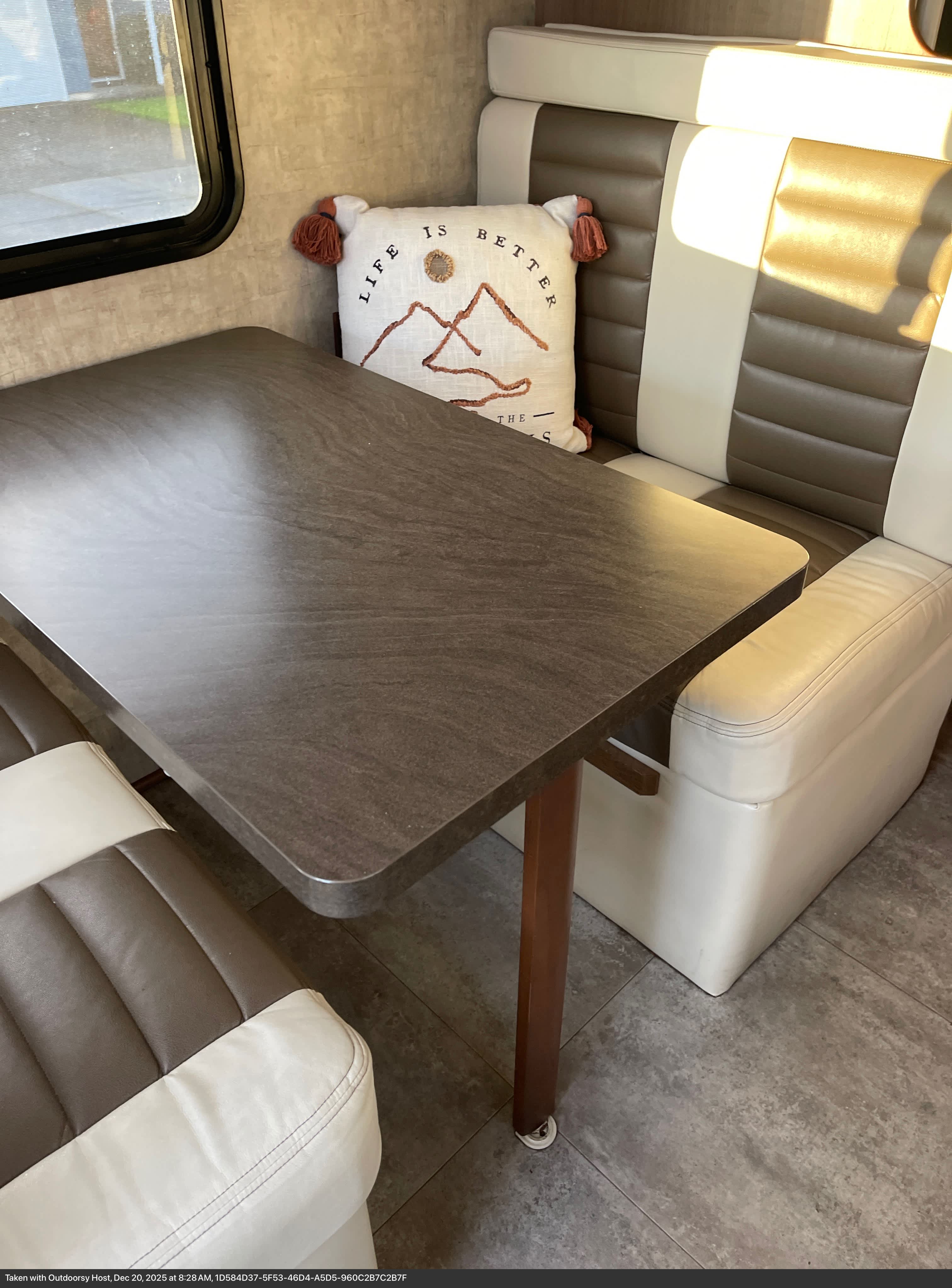 Welcome to our RV spot! It’s small but will get the job done. You will be cozy inside the RV with all the amenities you might need for your stay. Key Features & Highlights Compact Yet Spacious: At just 24 feet long. Maximum Sleeping Capacity: Comfortably sleeps up to 6 people utilizing its versatile sleeping system. Unique StudioLoft Bed: Features a power-retractable 58" x 78" StudioLoft short queen bed that drops down from the ceiling at the touch of a button, saving floor space during the day. Flex Bed System: The dinette and sofa/bed combine to create a large 70" x 87" Flex Bed System for additional sleeping. Bigger than a California king. Interior Comfort & Amenities Convertible Living Area: Booth dinette (with three-point seat belts) and a sofa/bed, both featuring soft Ultraleather furniture. Kitchen Convenience: Double stainless steel kitchen sink with covers, a 2-burner range top with glass cover, microwave oven, and a mid-size electric/propane refrigerator. Modern Touches: Energy-saving LED lighting throughout and MCD blackout roller shades for privacy and temperature control. Entertainment: Standard TV and DVD player, plus a coach stereo system. Cab Features: Swivel cab seats integrate into the living area, and a Radio/Rearview Monitor System with a 5-inch LCD touch screen, GPS, and Bluetooth. Full Bath: Rear bathroom with a shower, toilet, and corner sink, plus a dedicated pantry area just outside. Climate Control: 13,500 BTU Air Conditioner and a 20,000 BTU Furnace
