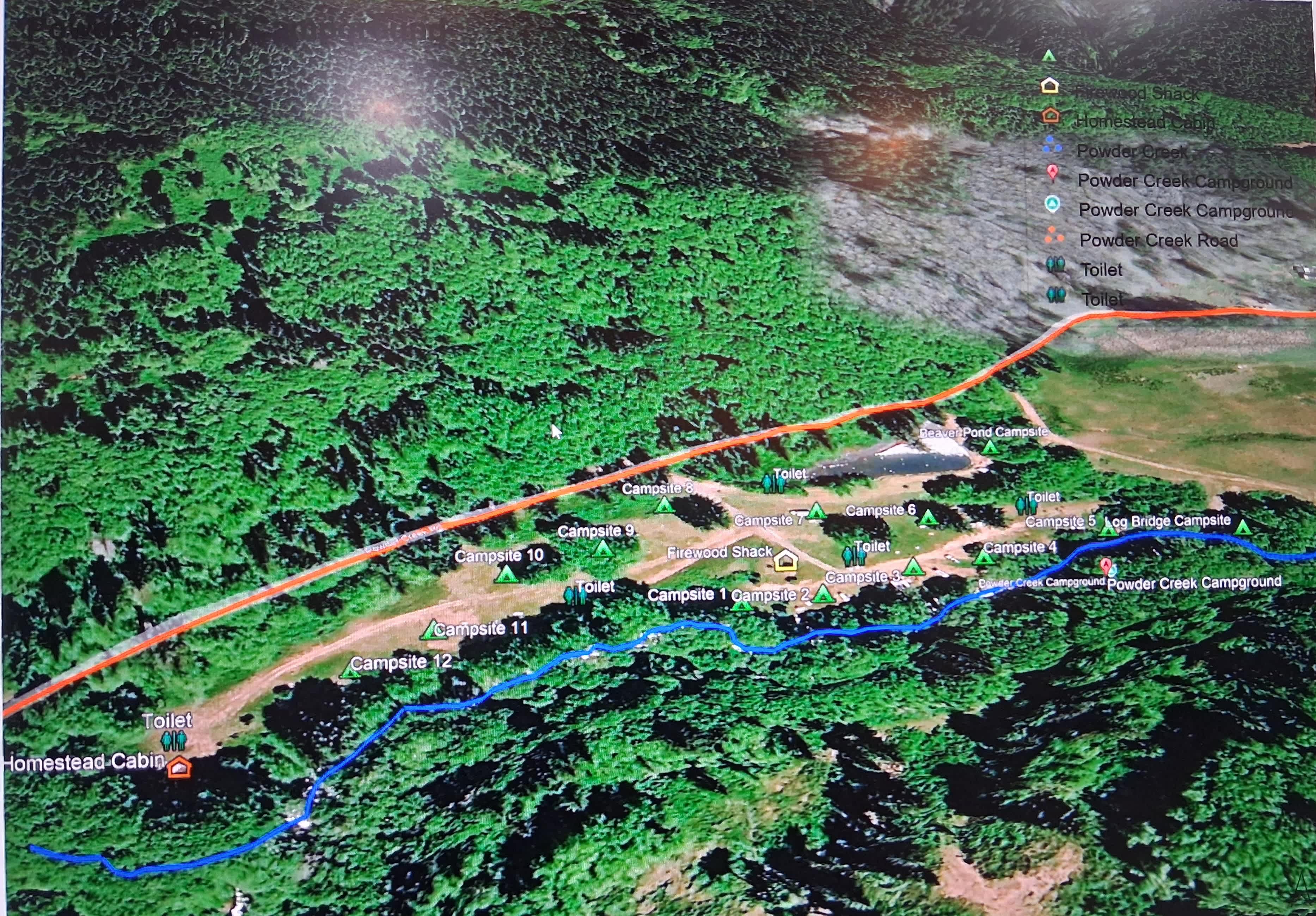 Creekside Site 1 is at the up-stream end of the row of creekside sites so it has more privacy. Right on the edge of Powder Creek, #1 is a highly shaded spot, great for the heat of summer but stays a bit damp until June. Great for smaller trailers, tents or pop-ups. No turn around for large RV's. Campfire pit, picnic table and close to the porta potties.