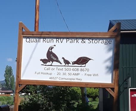 Quail Run RV Park is located north of Halfway Oregon on Cornucopia Hwy. It is quiet and clean with majestic views of the Wallowa Mountains. 20,30,50 AMP Hookups Great Internet We are a very home town laidback RV park. We have wood on site for fire pits and welcome friendly dogs or other pets upon approval. The RV park is on the edge of town in a quiet neighborhood. The school is 100 yards away and has tennis courts, a track, a basketball court and frisbee golf that are open to the public.