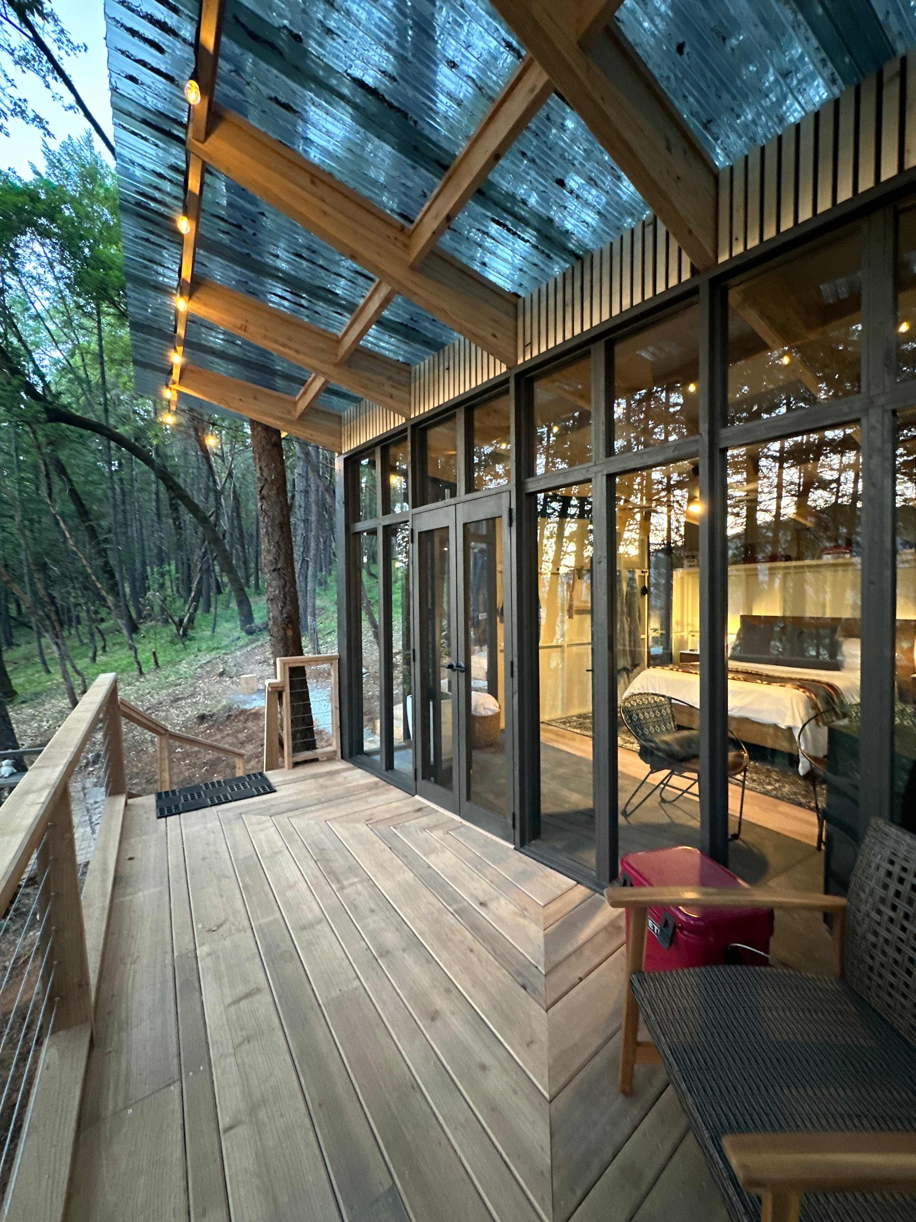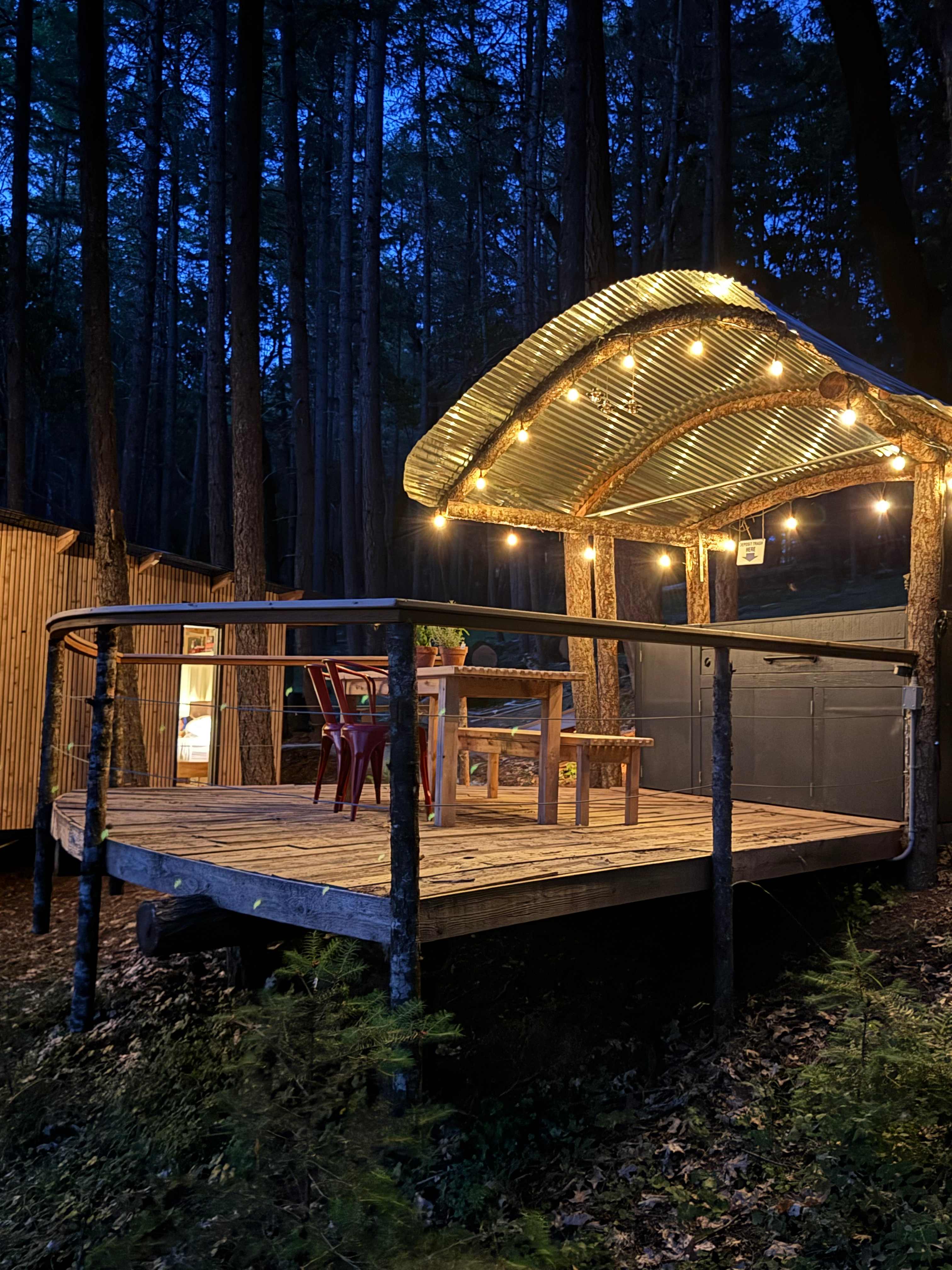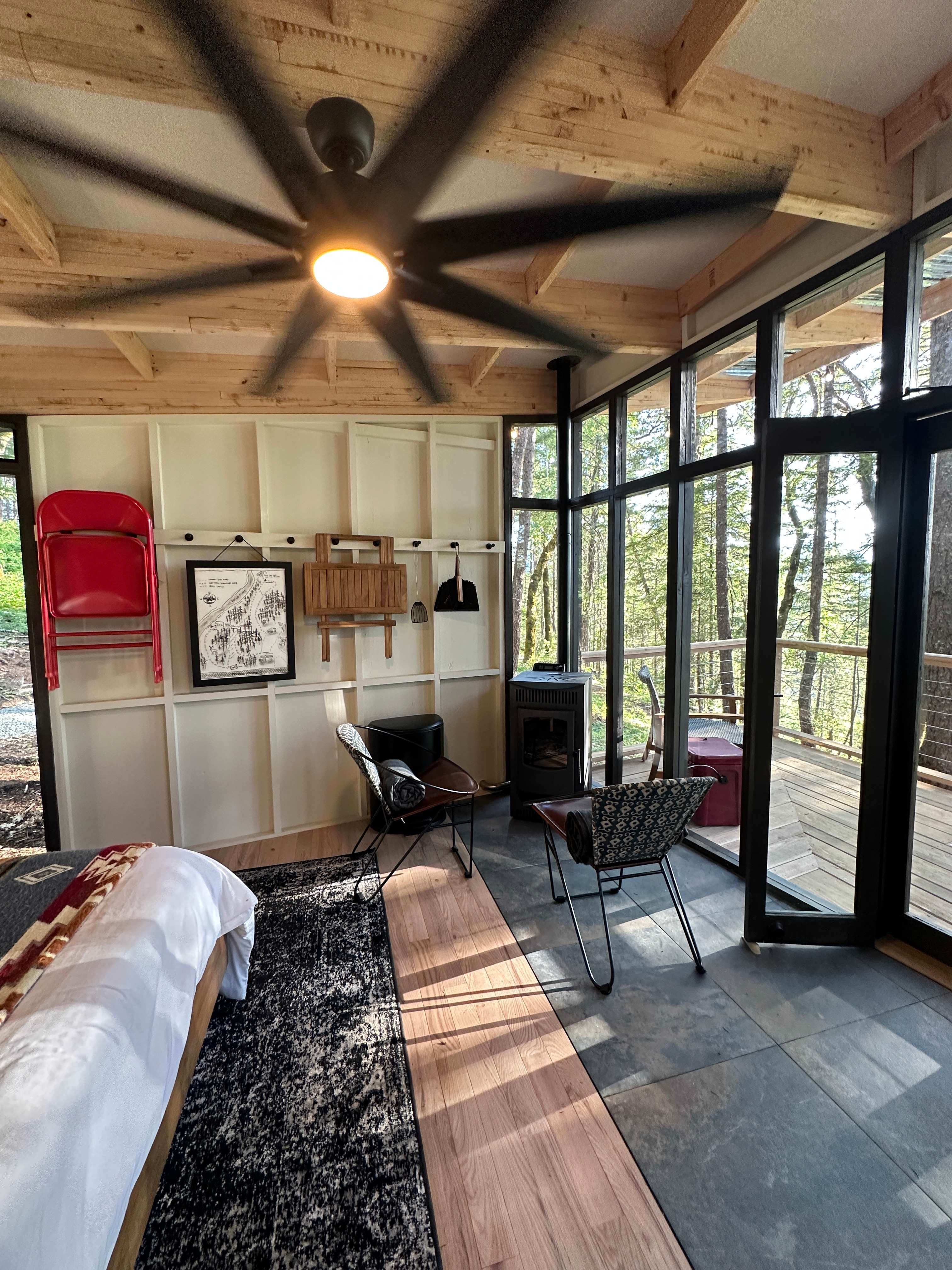 Everything was great! The tent has all of the comforts of home. From the comfy bed, to the wood stove, the cute lanterns, a nice soft rug to walk on, a table and chair all thoughtfully placed. The sitting bench at the end of the bed with baskets of more soft blankets added to the charm.. The porch offers a nice place to sit and relax. I loved the fire pit, outdoor shower, the outlook, and the sink space outside of the out house. The beautiful bouquets of wildflowers in mason jars make you forget where you are. There are just the right amount homey touches in this outdoor space, you can see how it lives up to its name. The kitchen area had all of the essentials to prepare food; dishes, utensils, pots, pans, tea kettle, a cooktop stove, bbq grill, and a sink. The picnic table is another nice place to take in the beautiful views while eating. Surrounded by tall trees and sounds of nature made it so easy to be outdoors all day and into the night. There are motion sensor lights to help you get around easily after dark. The quality linens and blankets on the bed give you a pleasant place to retreat. Everything was clean, fresh, and beautifully designed and built. I was quite fond of the steps to the tent, the hand rails, the structure that supports the tent are all made of wood. I’m assuming from the trees on the land. They really pay attention to the finer details. I would highly recommend Rogue River Glamping!