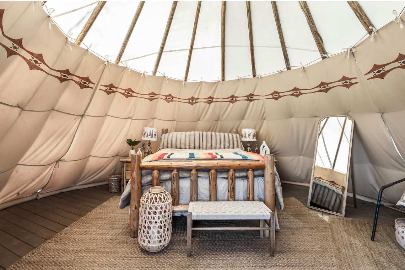 Our Tipi is on a raised deck on top of the canyon with eastern views of treetops and pond below. Views include everything from Black Butte to the Ochocos. There is a little creek that runs right next to the tipi so you can listen to the sound of water while you relax. Tipi has queen sized bed.