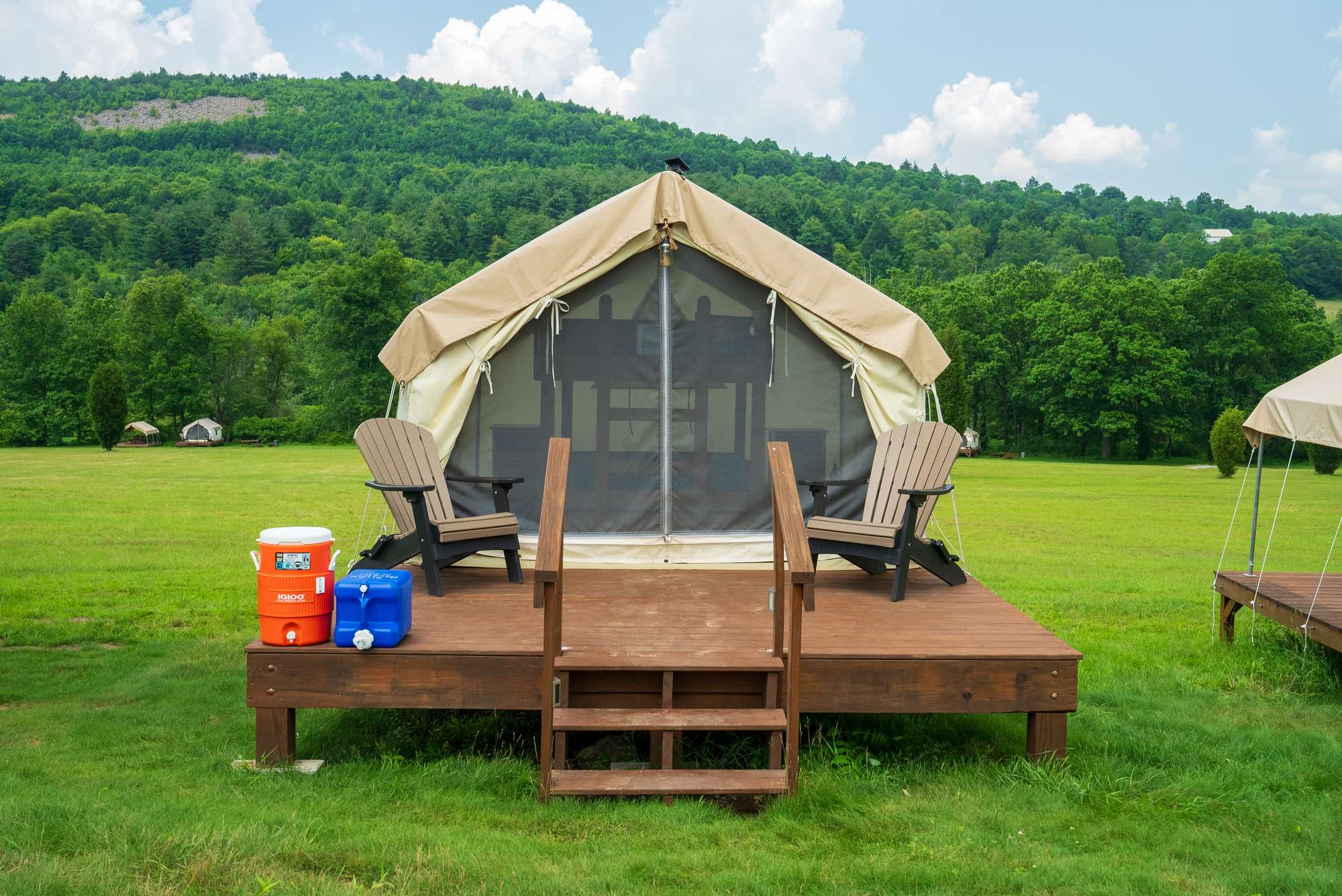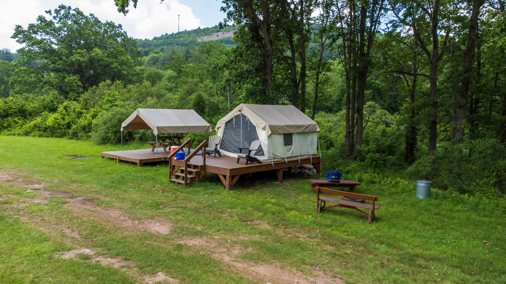 Our 'Valley View A' Glamping Site is located in the Valley of the mountain among the hemlock trees. Up to 4 guests can sleep comfortably in our canvas tent with full size bunk beds. Coming with additional guests? This site is located in close proximity to our 'Valley View B' Glamping Site making it perfect for friends and family. INCLUDED WITH YOUR SITE: -Canvas Tent -Full Size Bunk Beds -Sheets & Pillow Case -Wooden Deck -Adirondack Chairs -Fire Ring with Grill, Tongs and Brush -Picnic Tables -Bedside End Table -Handwashing Water -Cooler -Access to Indoor Bathrooms & Showers -Free Scenic Lift Rides -Free use of our Catch and Release Fishing Pond -Free Access to the Blue Burn and Cross Country Hiking Trails Camping tents can be rented for $40 to add to your site. A maximum of 6 people are allowed at each site. After 4 people, each additional person at your site is $15.