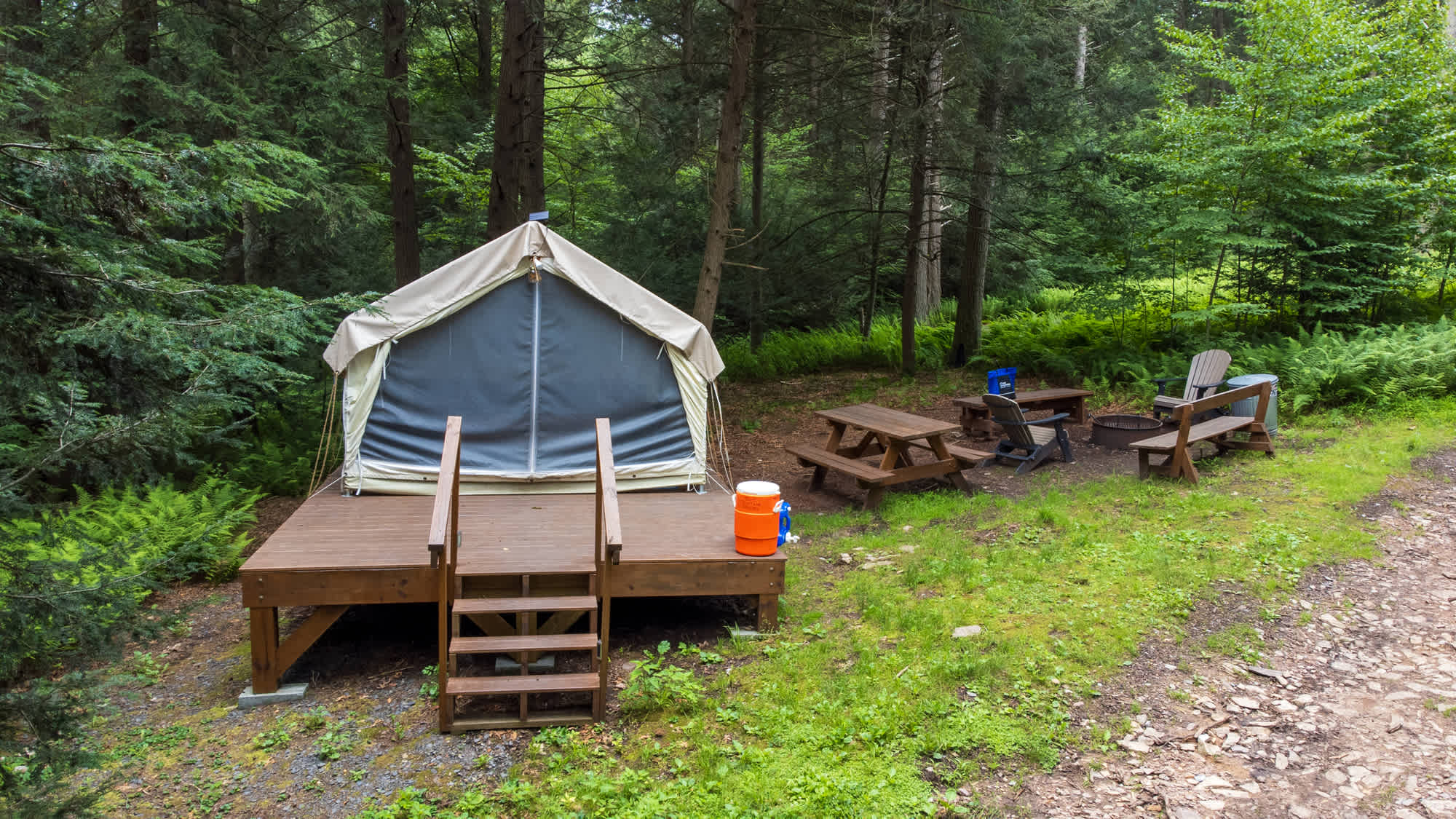 Glamping sites are located in the Valley portion of the mountain. Choose between a wooded, prairie, or creekside site. Welcome to Blue Mountain Resort! Known mainly as a premier ski and snowboard destination in Northeast Pennsylvania, Blue Mountain continues to add “green season” amenities that rival its winter business. Our property is home to 164 acres of skiable terrain and boasts the highest vertical drop in the state at 1,082 feet. In addition to the 39 ski trails, 16 lifts and 39 tubing lanes, Get access to more than 26 bike trails (accessible by ski lift), three disc golf courses, four high ropes courses, and three outdoor laser tag fields, zip lines, scenic lift rides, and more! We also have a full service indoor/outdoor restaurant onsite, Slopeside Pub & Grill. Pets are allowed at our glamping sites for an additional fee of $15 per pet. All pets must be on a leash and not left unattended for any reason. Please come prepared to pick up after your pet! Curious what's included in your glamping stay? - Nearby/on-site vehicle parking - Canvas Tent - Sheets and pillowcases - Full size bunk bed that sleeps 4 OR Queen Sized Bed that sleeps 2 - Wooden deck - Adirondack chairs - Fire ring with grill, tongs and brush - Picnic table - Bedside end table - Handwashing water - Drinking water - Cooler - Access to indoor bathrooms and showers - FREE SCENIC LIFT RIDES - FREE Access to our BLUE BURN and Cross Country Hiking Trails - FREE Use of our Fishing Pond