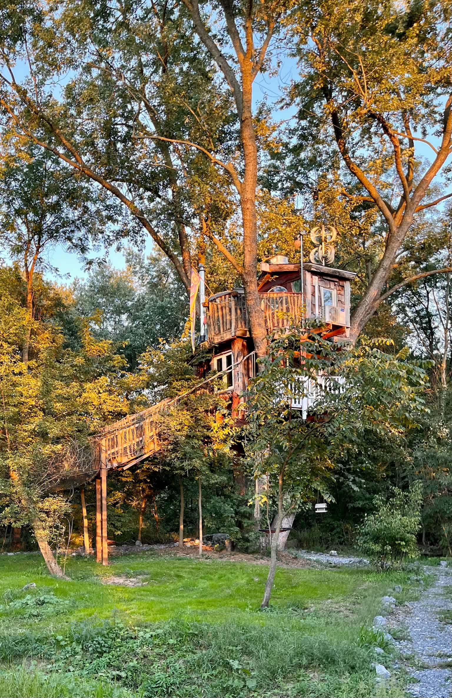 The tree house was very nice and unique, especially at night. With the lights on, it feels like a magical place. But outside of the treehouse, the grass is long (up to your knees) and unkempt. I have two small dogs and they always come back with so many ticks on them, and when I came back home, we found lots of ticks on my dogs' bodies and one on my husband's body too. We were very surprised because there were hardly any mention of it in the reviews or the description. Not only that, but there were wasps in the treehouse, which my husband killed with sprays. We woke up to the sound of wasps buzzing a few feet near us. Our son decided to sleep in the car for the two nights we were there.