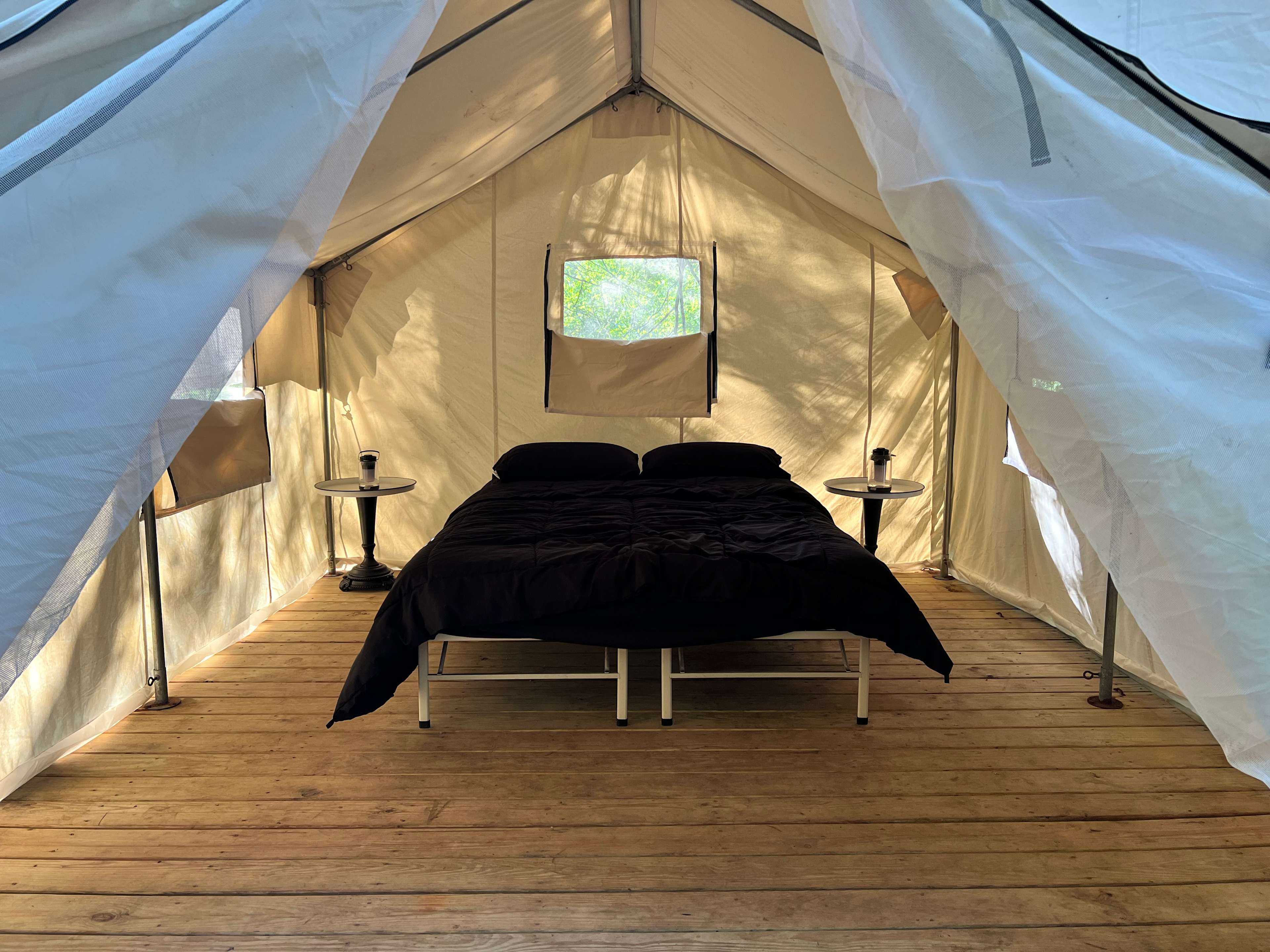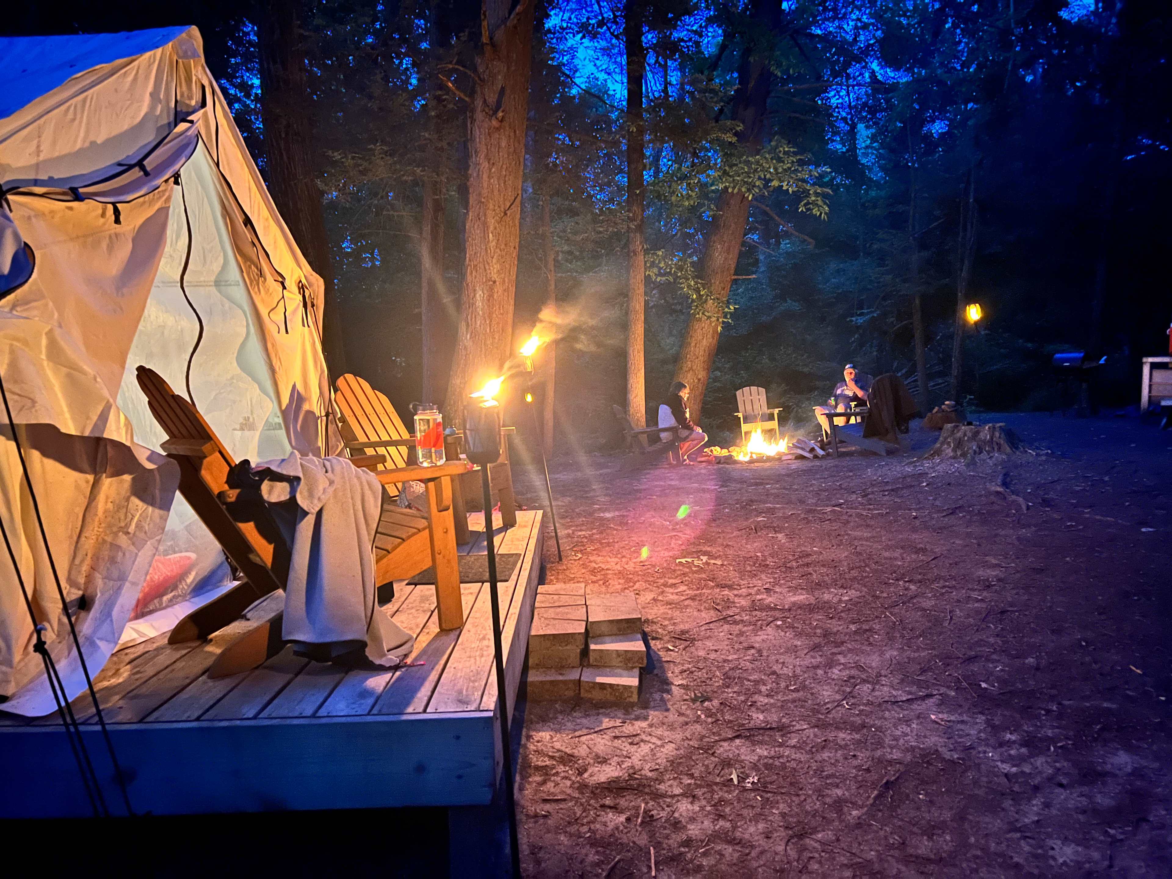The campsite is nestled on a wooded knoll alongside Pohopoco Creek. Featuring a 10' x 12' canvas tent erected on a wooden platform, furnished with a queen-size futon mattress atop a bed frame, we provide essential amenities for a comfortable stay. Guests can expect a battery-operated sprayer for rinsing off, battery-operated lanterns, tiki torches, a small charcoal grill, charcoal, lighter fluid, fire starter, and the first night's firewood. Additionally, a 5-gallon container of fresh drinking water and bedding are supplied. For extra campers, a secondary tent is available; however, extra bedding for this tent is not provided. The primary tent comfortably sleeps 4 individuals, with the secondary tent serving as additional sleeping quarters. For privacy and convenience, a separate tent houses rustic toilet facilities. Although the listing specifies a maximum of 6 campers, we can accommodate a greater number with advance notice. Guests are encouraged to bring their own food, beverages, and a deep appreciation for the tranquil symphony of water, wind, and birdsong. This is truly a serene retreat.We offer a total camp setup located steps from a trout stream. Although located in a semi-rural area, the site is very very secluded. A 10'x12' large canvas tent, queen sized bed frame with a futon style mattress, a secondary popup tent for additional campers, fire ring, small grill, picnic table, rechargeable lanterns, 1st night's firewood, fire starter, rustic toilet, 5-gallon water jug, 3-gal battery operated rinse kit are all included with your stay. Nearby to the site: Beltsville Lake State Park, Appalachian Trail, Blue Mountain Ski area and outdoor park, Big Creek Winery, Haydt's Meat Market, Beltzville Beverage. Bring your food, libations and a love for the outdoors, leave the rest to us.