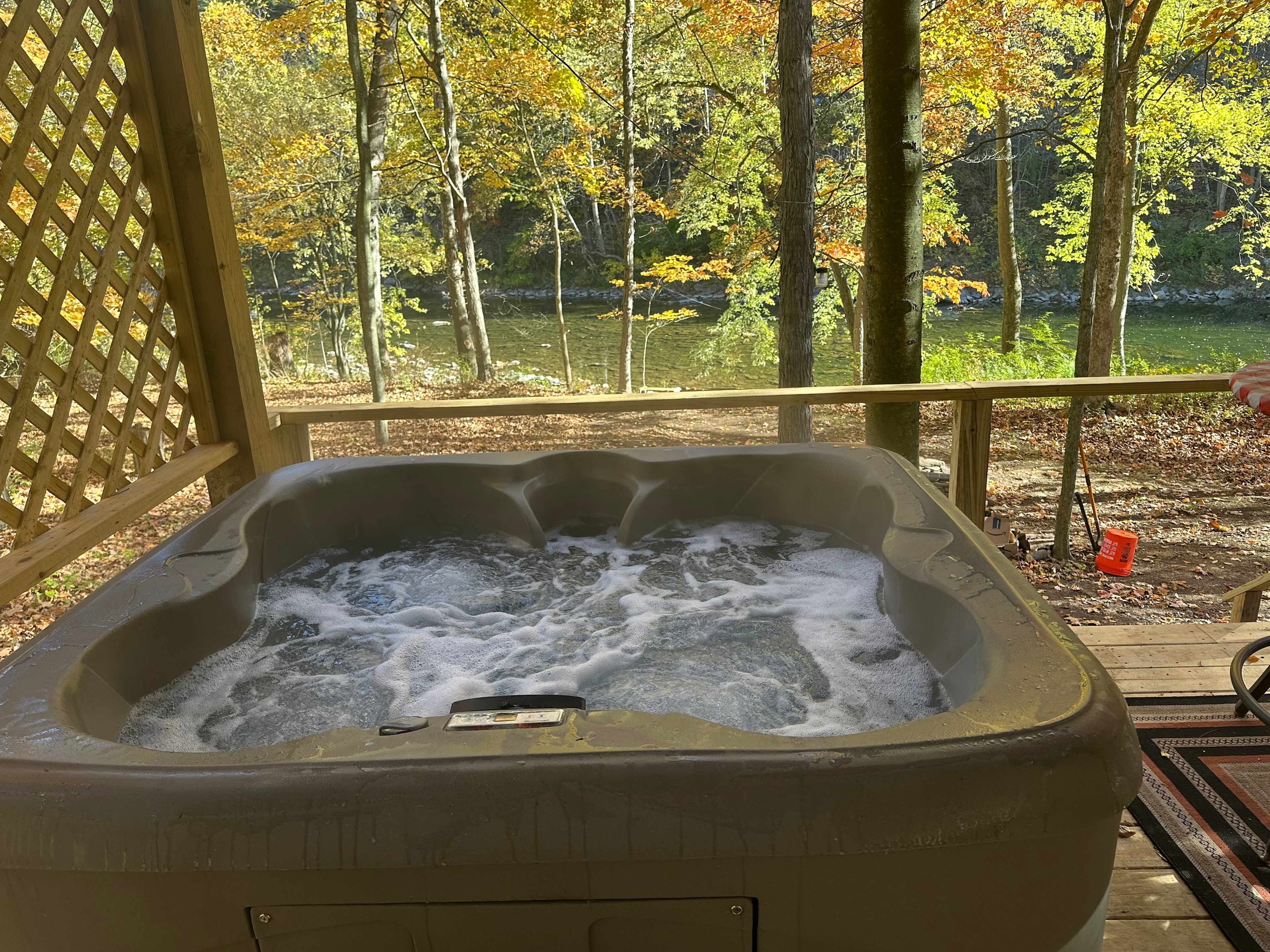 This riverfront, fully equipped, beautifully crafted treehouse is not your average child's treehouse, but kids are certainly welcome. Walk up the easy 14 steps into this A Frame tiny house and you'll be surprised at the roominess. Inside you'll discover a full kitchen, full bathroom with shower, living area with sofa bed sectional, dining area, and loft with a queen bed. Step out on the deck, just a stone's throw from the river and listen to the sounds below of the gurgling moving water over the rocks. Move down below the treehouse to find another huge deck with a hot tub, relaxing seating, and a table for dining outside. But that's not all; step off that deck to a fire pit and steps leading to the river. The river is great for swimming, fishing, and boating and we even supply a canoe and kayaks. Much of the treehouse was built with wood from the property, including the poplar floor joists, rafters, and siding. Inside you'll find several different species of beautiful wood, most from the property, including black walnut, oak, ash, cherry, and more. The two giant Tulip Poplar trees that supports the treehouse continue to grow and in the early summer produce the tulip like flowers. If you're up for exercise or adventure, just across the river is the H&BT Bike Trail, which is now 14 miles long. A short drive takes you to a trailhead or if you're just looking for a hike on the trail, canoe across and climb up the short hill to the trail. Also across the river is a 2600 acre Pennsylvania State Game Land and 2000 foot high Kimber Mountain; if you're looking for a challenging and primitive hike, climb the mountain or work your way up Kimber Run, a small brook with many small waterfalls. Adventure abounds near Treehouse Waters. There are also many other things to do in Bedford and Huntington Counties. The Raystown Lake is less than 20 miles away and the county seat, the small, charming town of Bedfrod is also only 20 miles away. Take a look at the Bedfrod County Tourist site for more activities.Stay in the treehouse and enjoy the river.