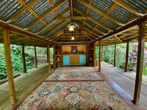 Located in one of the last truly campesino mountain valleys, this once small family coffee farm ( Finca Monte Esplendor ) has been lovingly transformed into an eco-farm of terraces, poly cultural fruit/cacao forest and retreat center. Sana and Papo arrived some 40 years ago inspired by the terrain, PR culture and local campesino community. They are professional musicians, impassioned land stewards, experienced Buddhist and yoga teachers. Enjoy the kilometer of river cascades and pools surrounded by 500+ acres of the Barreal Watershed officially designated as an ecologically sensitive /nondevelopment zone bordering the Guilarte Forest Reserve. Walk the extensive well maintained trail system and enjoy the totally private swimming hole on the Finca. Warm days (75-80 degrees daytime/62-70 degrees nighttime) And no mosquitos! There is no environ on the island quite like this- the perfect place to retreat from the hustle-bustle of modern life and commune with the serenity and beauty of the forest. The sights and sounds will astound! 25 minutes from Peñuelas Plaza and 45 minutes to the beaches of the Guanica Forest ReserveEl Bohio is a rustic hut reminiscent of past Jibaro abodes located in view of Rio Lucia ( one of the few still clean streams on the island ) with private swimming hole and water falls. Nestled within the Poly-cultural Cacao forest of the Finca Monte Esplendor, it provides all necessary amenities -- cook stove, cookware and utensils, spring water, shower (spring fed), queen bed (no linens), mini fridge. There is a nearby state-of-the-art composting toilet. Totally solar powered. Cell service is excellent. Firewood available for purchase. Special activities available (please confirm availability) There is a wood fired sauna available for $25/person / $50 minimum. Also, yoga/meditation classes at the Finca Peace Pavilion $10/person.