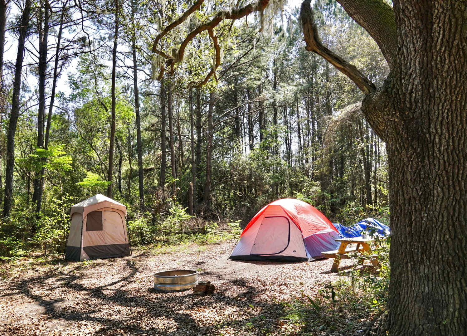 Saw Palmetto Hideaway is a Tent/RV site on a flat space in a mixed stand of magnolia, pine, sweet gum, and oak trees that also has beautiful clumps of saw palmetto palms. The site has a toilet tent, campfire ring and a picnic table. There are NO hookups at the site. Potable water is available at a nearby spigot. Guests need to pack out their trash and leave no trace.