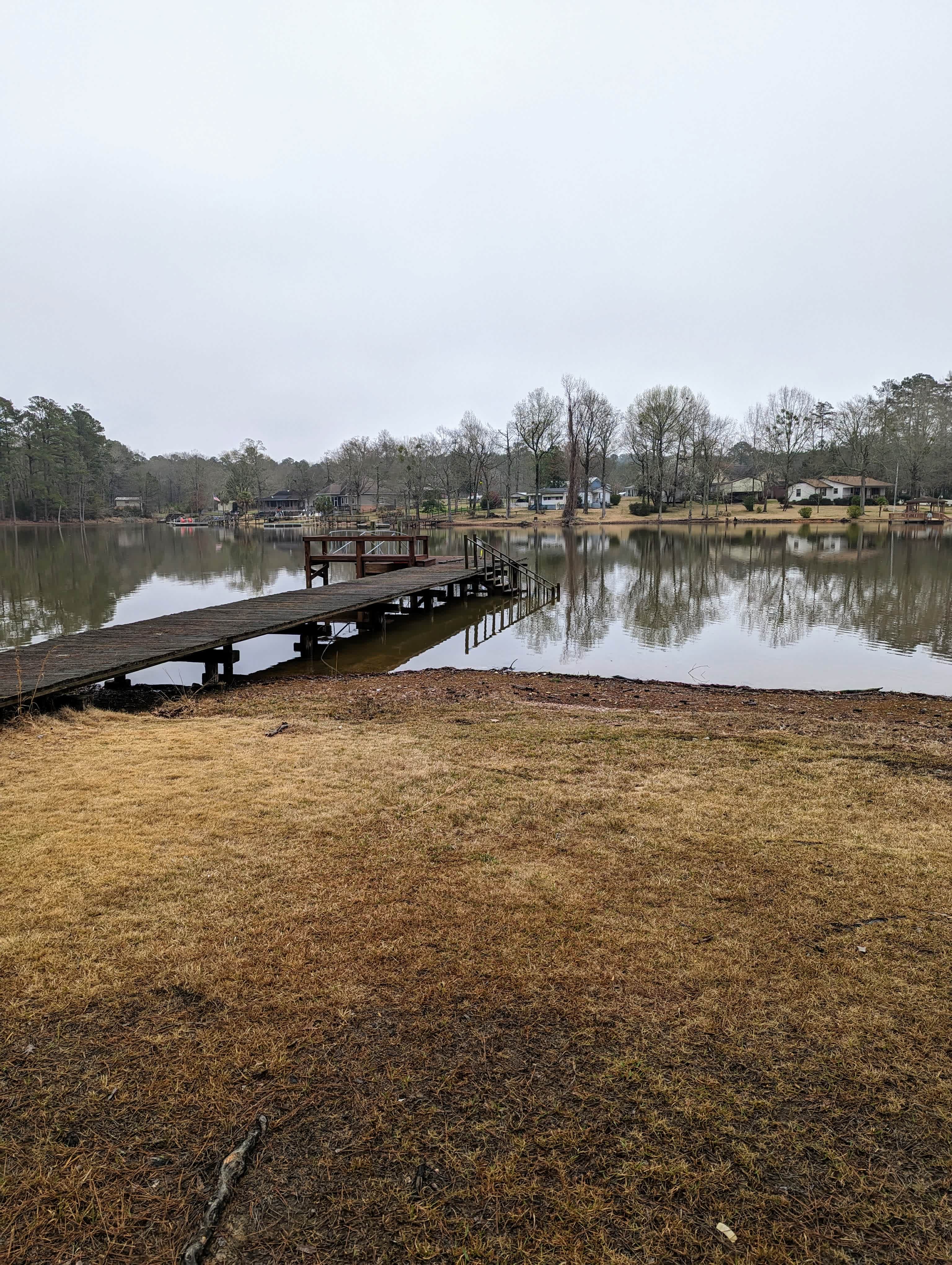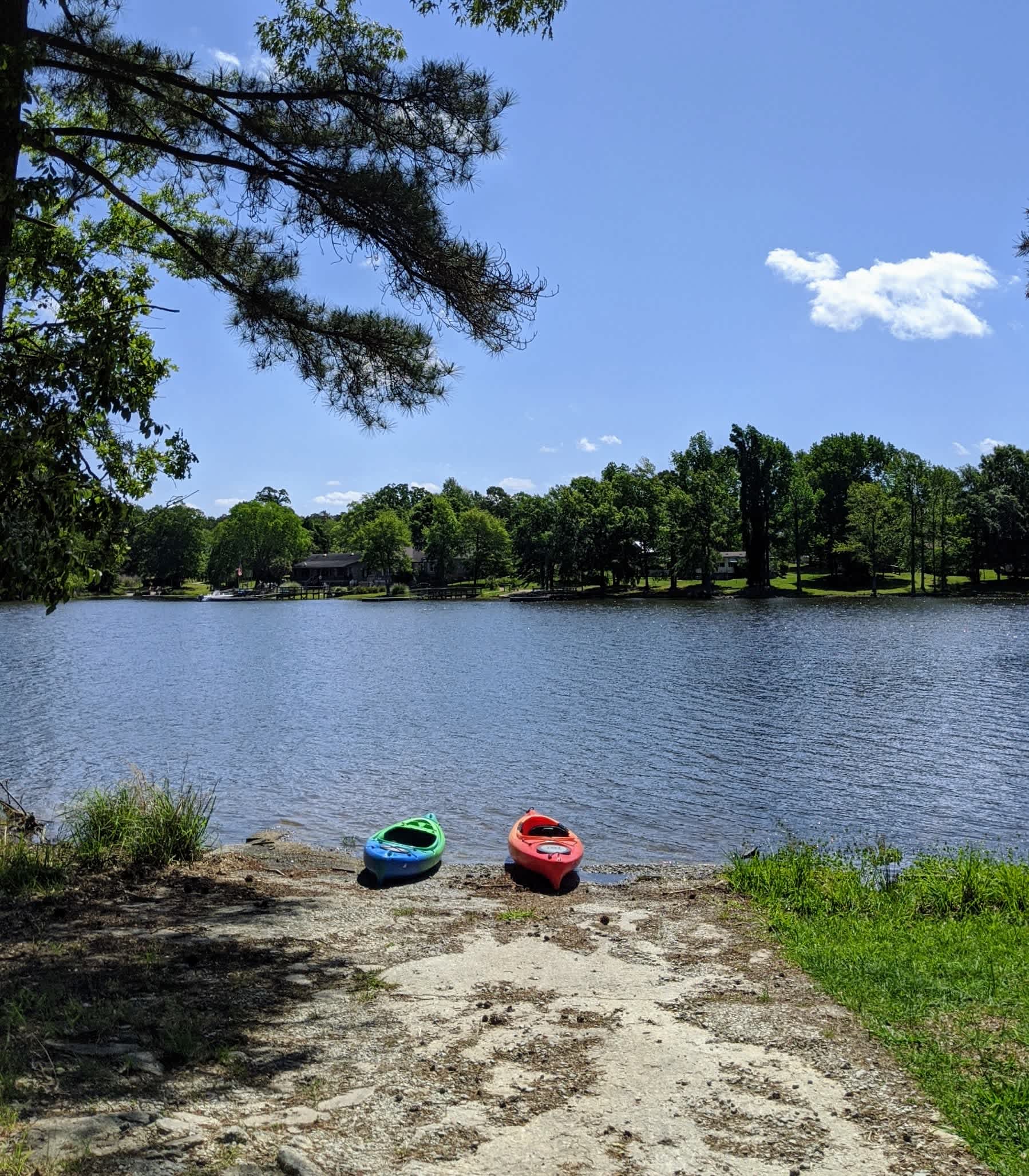 A sprawling front yard of a rustic lake house on a quiet cove at Lake Murray. Tall pine trees shade the gently sloped camping area along the lake shore. The camping area is adjacent to a dock that's available for fishing and swimming. A picnic shelter with swings and picnic tables is also available for use. Bring a kayak or canoe to explore our protected cove!