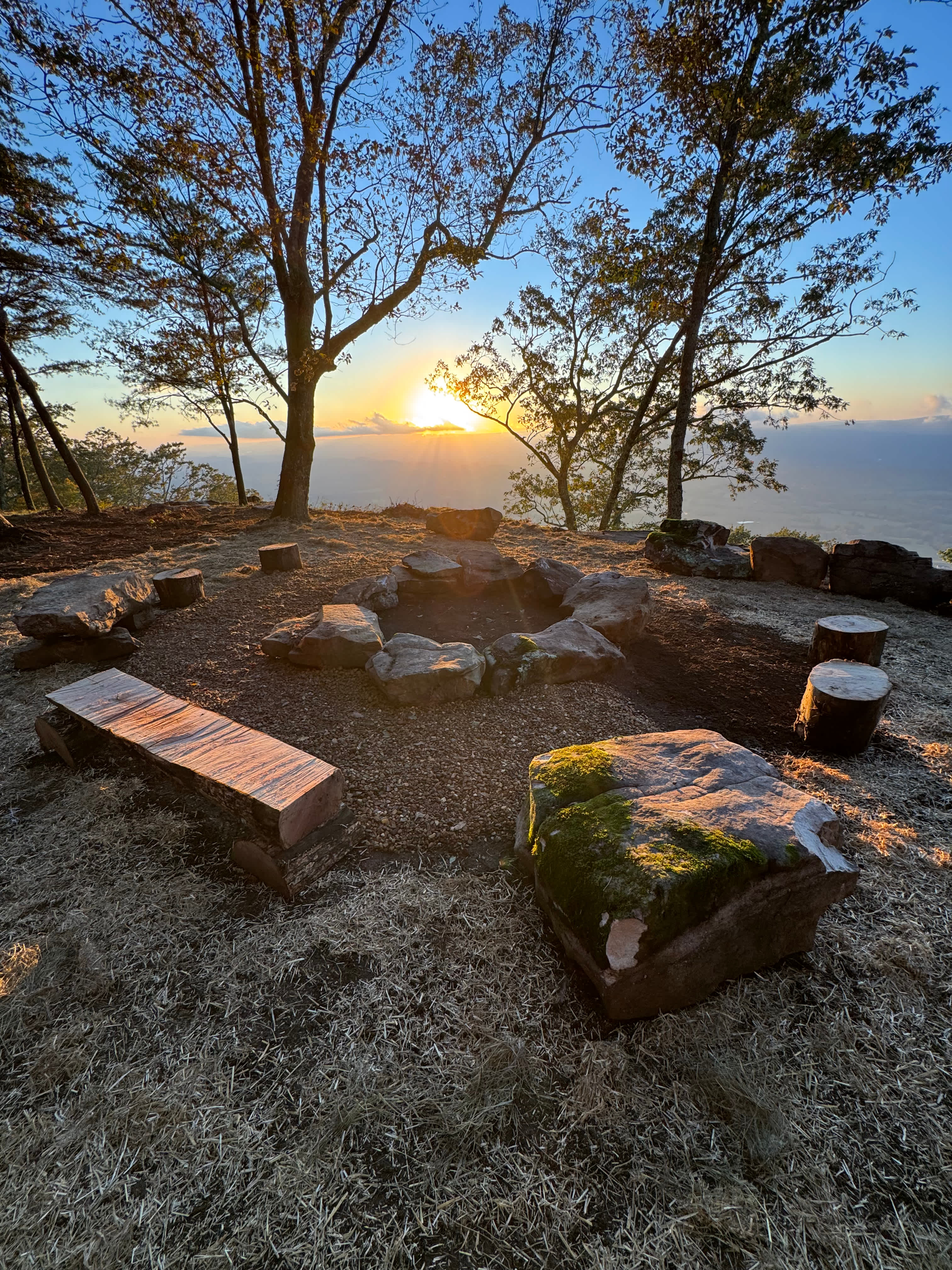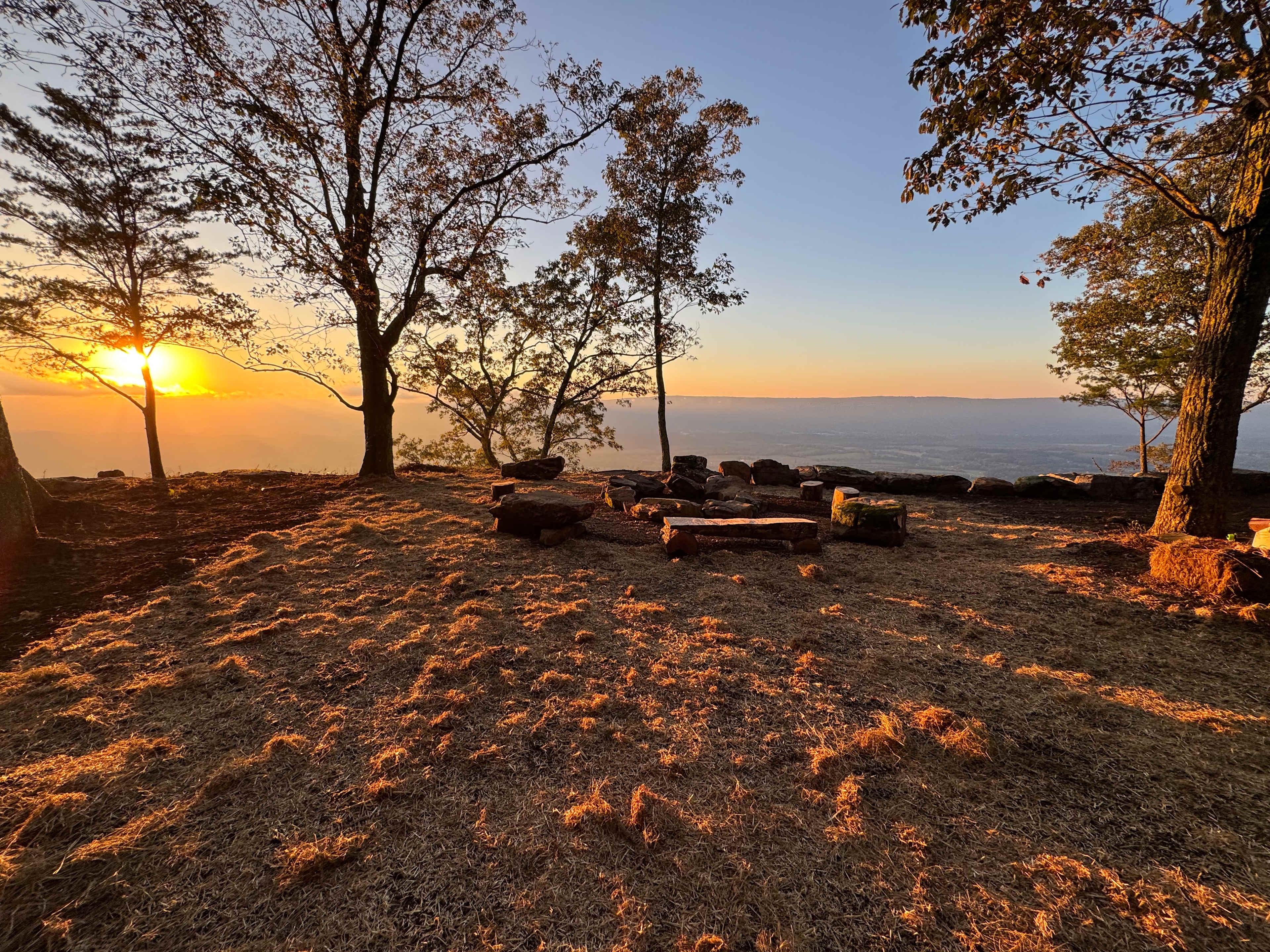 Burning Skye Bluff Stunning sunset views high above the Sequatchie Valley drop behind the expansive and breathtaking Cumberland Plateau! Perched atop Suck Creek Mountain, Burning Skye Bluff is a quiet, mountaintop campsite where the sky seems to ignite at sunset. From this cliff-top, the land drops away into sweeping, unobstructed views of the Sequatchie Valley and the Cumberland Plateau, with golden hour stretching long and wide across the horizon. The site features a stone fire ring set right at the edge of the overlook — the perfect place to gather as daylight fades and the sky shifts from gold to ember to stars. On clear evenings, sunsets here are unforgettable, and after dark, the elevation brings cool breezes, deep quiet, and expansive stargazing. This is a peaceful, secluded spot designed for campers who want space, views, and stillness. It’s ideal for couples, solo travelers, photographers, or anyone looking to unplug and spend an evening watching the sky. Adventure Access! 4 wheel drive is required. The trek to this beautiful site is not for the faint of heart, yet undeniably worth every bit of effort (and fun) necessary to get there. The site is well suited for vehicle camping or minimalist setups. Come prepared, bring what you need, and settle in — the view does the rest. If you’re looking for a place where sunset is the main event, Burning Skye Bluff delivers.Site 1 is situated on the western bluff of our property. There are now hookups. This is a completely off grid site. There is a fire pit and pick nick table. Hiking is permitted on any open trails on the property and Prentice Cooper State Park is easily accessible nearby.