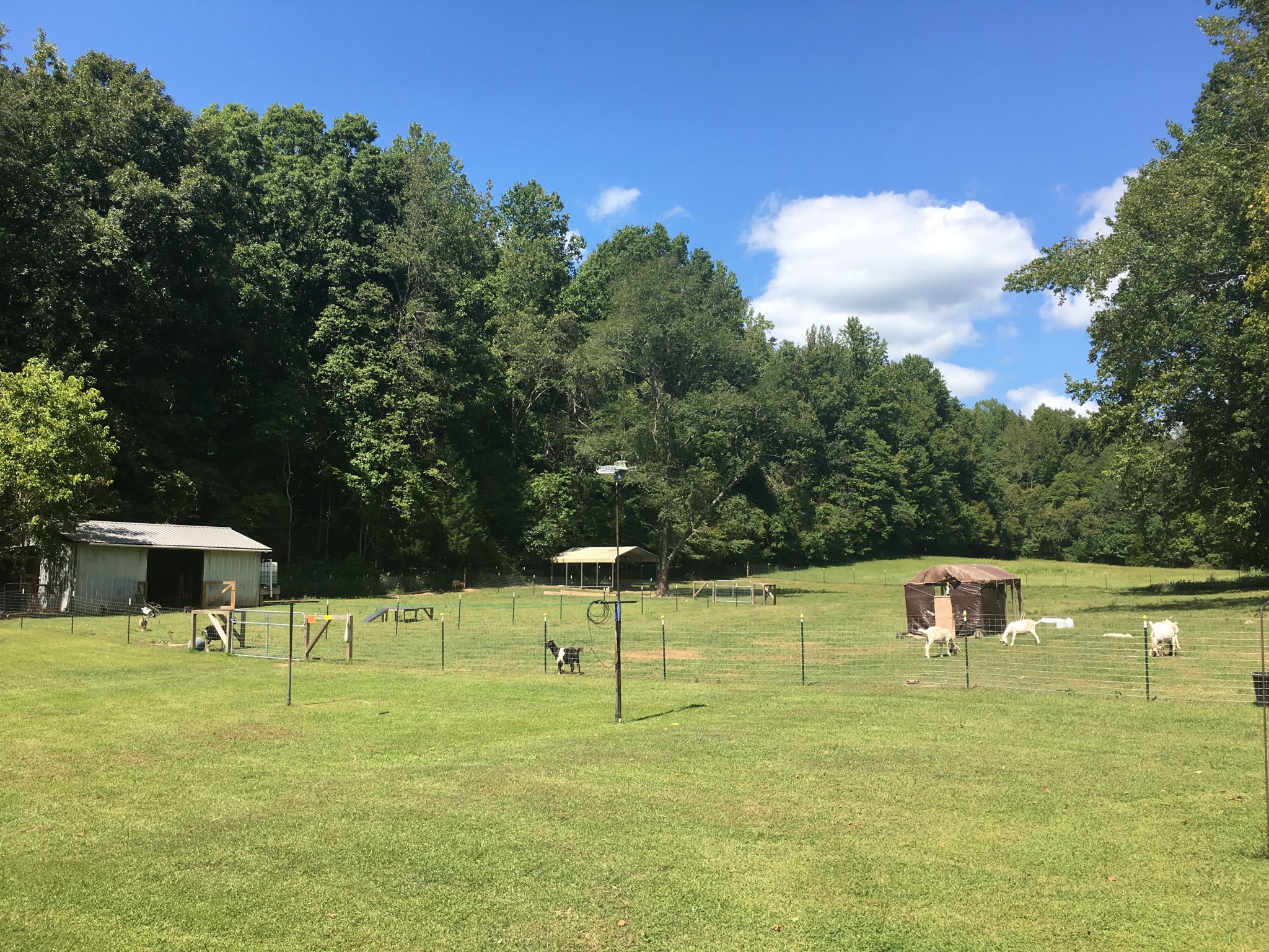 We farm livestock here. We have all different types of goats here. We also have chickens and rabbits. We do have livestock guardian dogs and they will bark at night when predators come to close. We grow all kinds of produce and sell it to the public and local grocery stores. We provide eggs to many of the local people in the area.