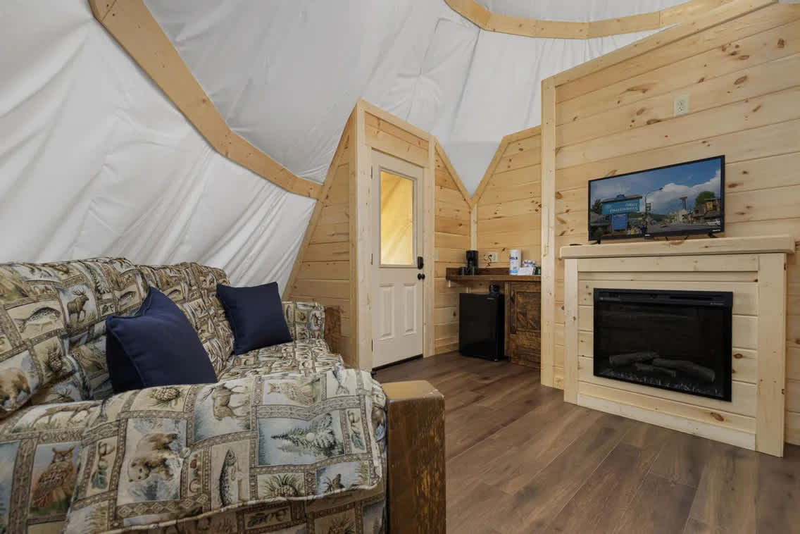 This fully heated and cooled tepee is perfect getaway. It is complete with a king sized bed, pull out couch, an electric fireplace, wireless internet access, a flat-screen TV, a full bathroom, and outdoor firepits. Through Parkside Resort pool access, access to an 18-hole putt-putt course, and hiking trails.