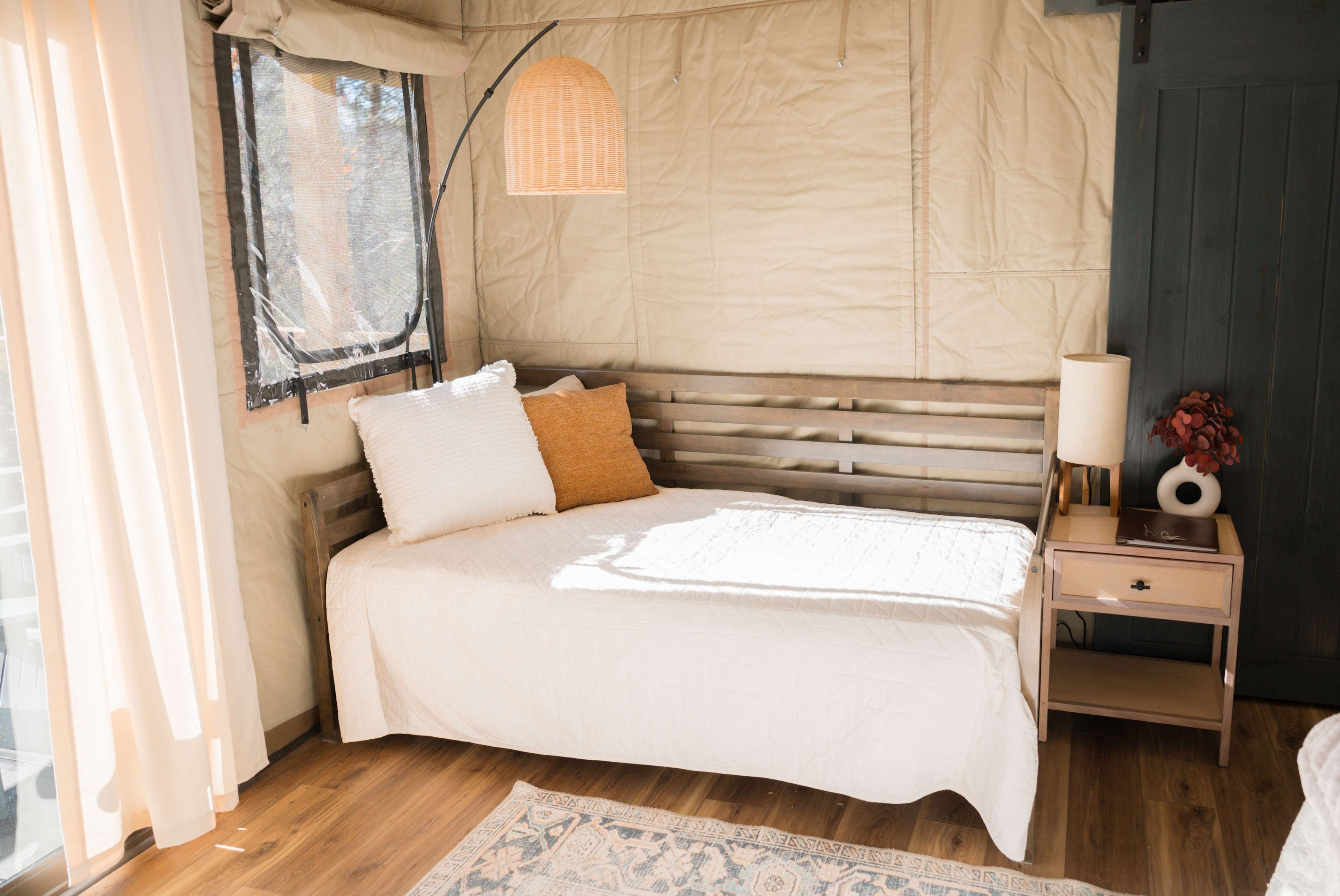 Bring the whole crew and enjoy the magic of WYLDSTAY Smoky Mountains in our spacious, family-friendly glamping tent. Thoughtfully designed for comfort and connection, this tent sleeps up to three guests and offers plenty of room to relax after a day of outdoor adventure. Inside, you’ll find a luxurious Queen bed and cozy daybed perfect for a child, soft linens, climate control, and rustic details that make it feel like home—only better. Step outside to your private deck to enjoy fresh air, peaceful views of Douglas Lake, and the sounds of the forest. It’s the perfect mix of wild and welcome—ideal for families looking to unplug, explore, and make unforgettable memories together.