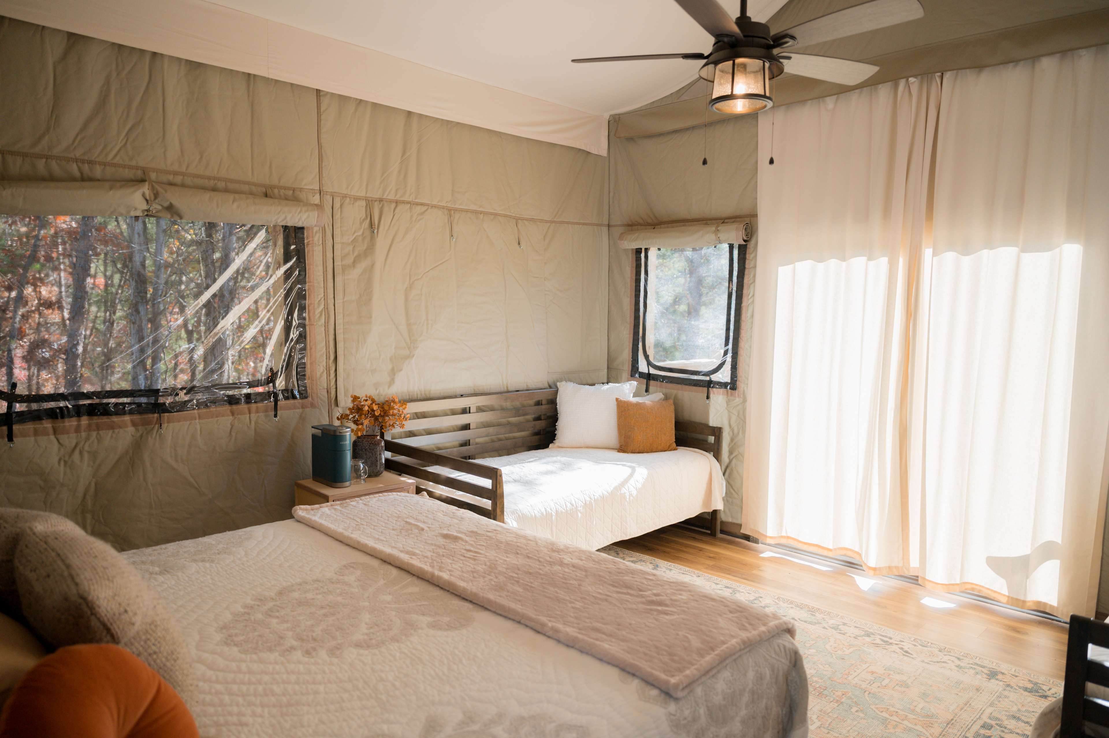 Bring the whole crew and enjoy the magic of WYLDSTAY Smoky Mountains in our spacious, family-friendly glamping tent. Thoughtfully designed for comfort and connection, this tent sleeps up to four guests and offers plenty of room to relax after a day of outdoor adventure. Inside, you’ll find a luxurious king bed and cozy daybeds for the kids (or extra guests), soft linens, climate control, and rustic details that make it feel like home—only better. Step outside to your private deck to enjoy fresh air, peaceful views of Douglas Lake, and the sounds of the forest. It’s the perfect mix of wild and welcome—ideal for families looking to unplug, explore, and make unforgettable memories together.