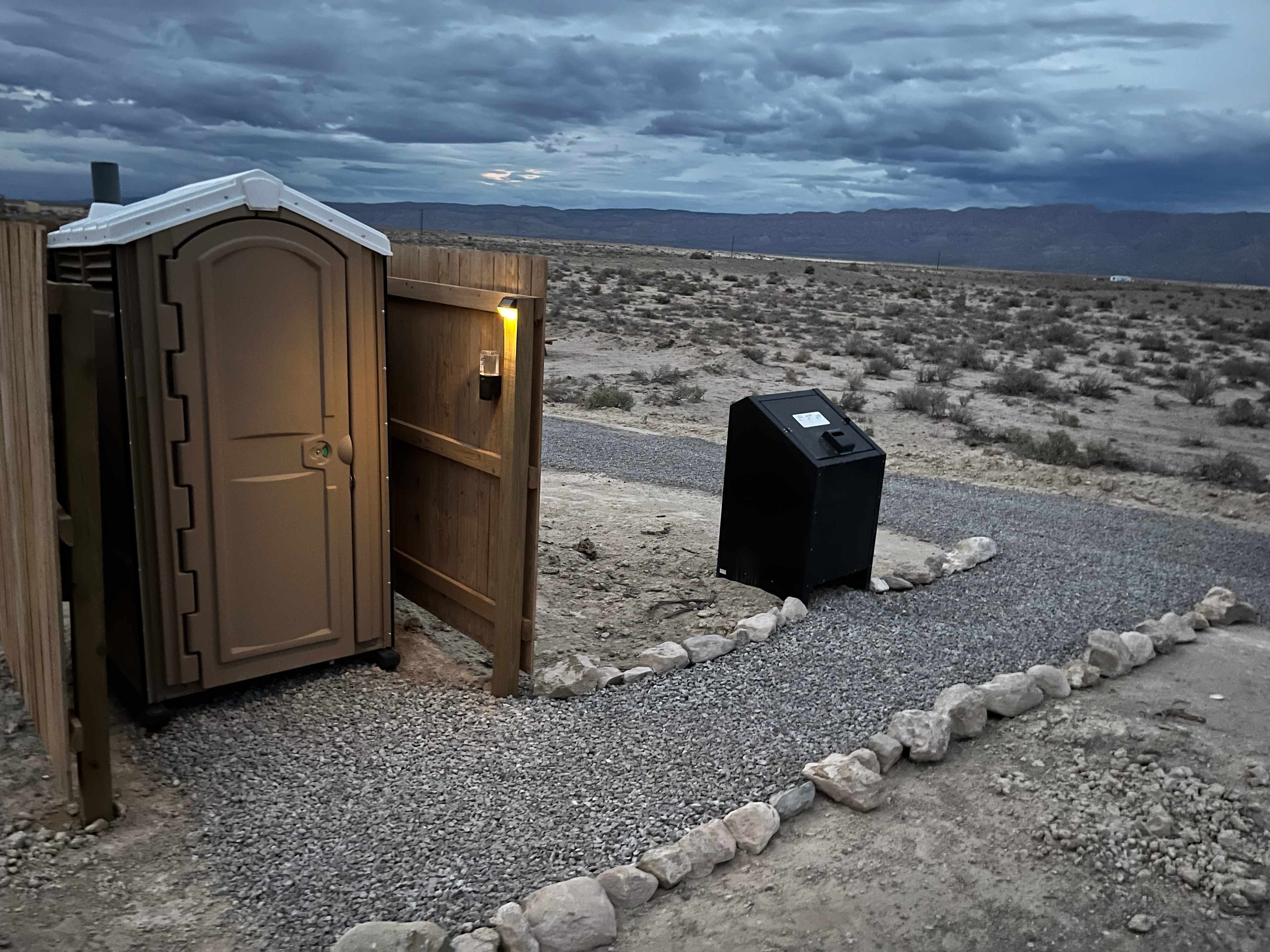 Settle into this peaceful desert campsite featuring a gravel parking area, picnic table, and BBQ grill (bring your own charcoal). Just 100 feet from a convenient porta-potty, the site offers simplicity and comfort in the wilderness. Enjoy wide-open skies and a stunning view of the Guadalupe Mountain Range, perfect for sunrise coffee or evening stargazing.