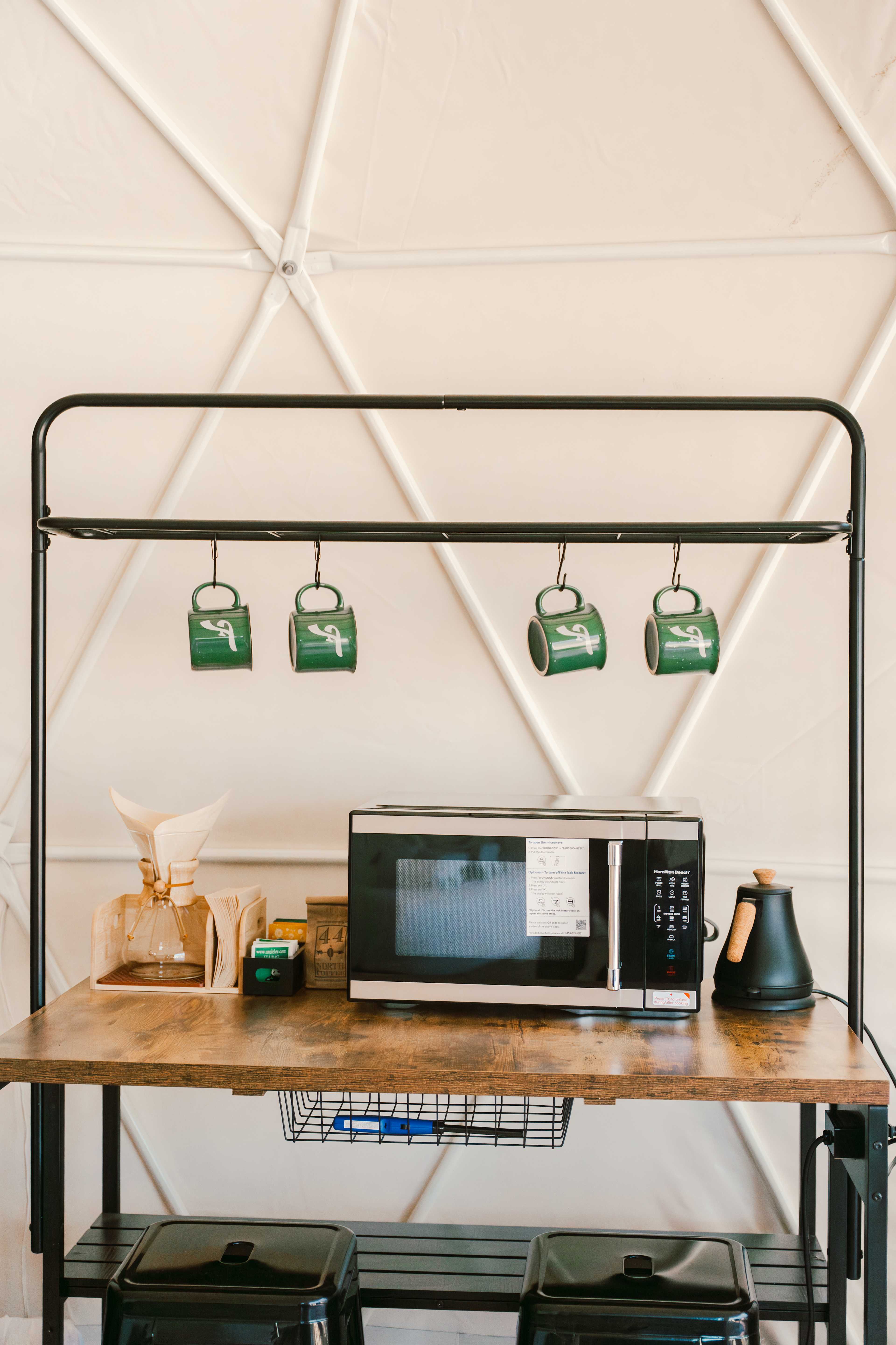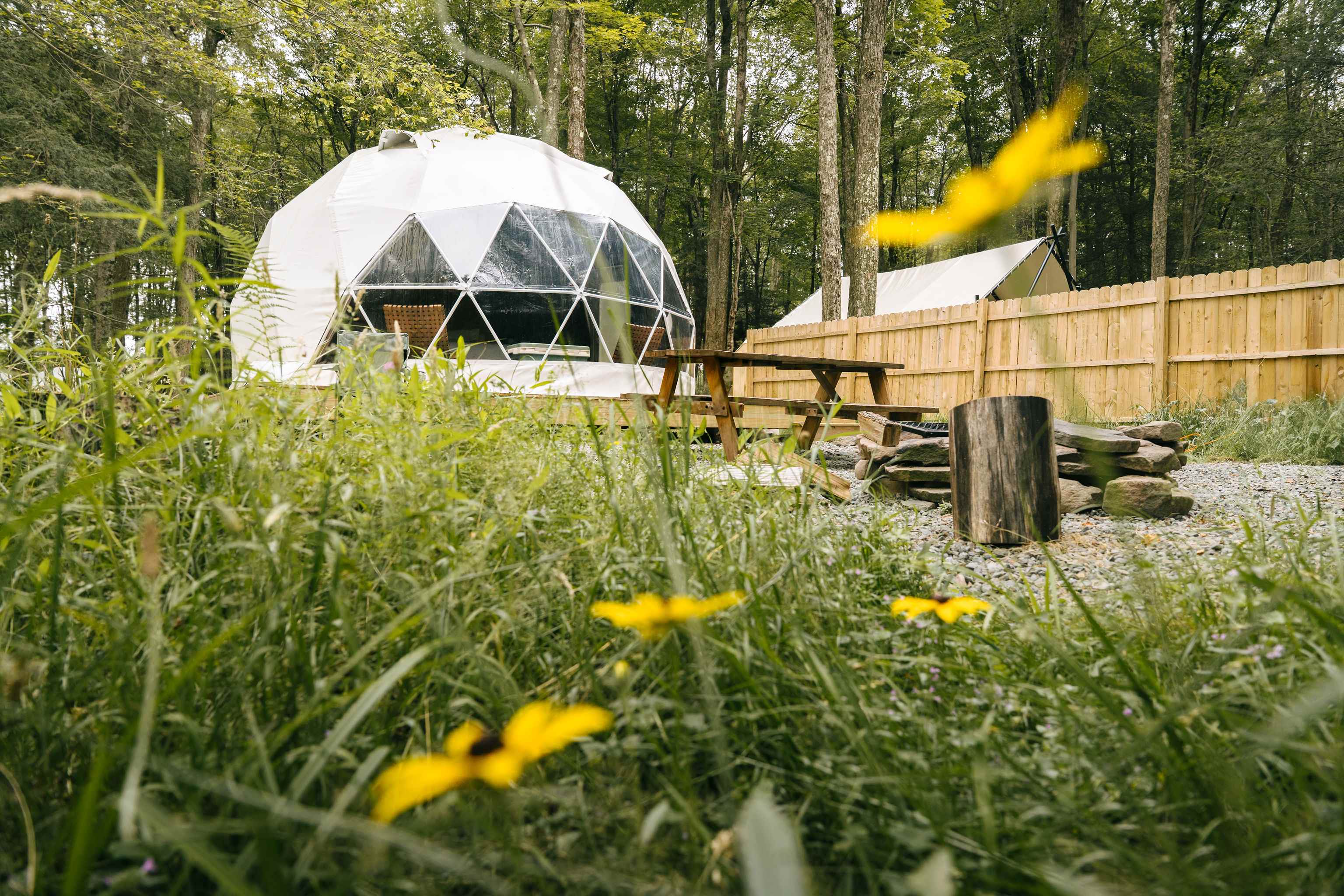 Experience elevated outdoor camping in our climate-controlled Dome Tent, featuring a king bed (sleeps 2). Enjoy modern conveniences like a mini-fridge, microwave, Chemex pour over coffee maker, electric water kettle, outdoor wood-burning fire pits, WiFi, and full climate control (A/C & heat). Linens and toiletries are provided, along with access to power outlets, a picnic table, and an RTIC cooler. Dog-Friendly: Bring up to 2 dogs for $40/night. Please select the “Dog Friendly” add-on at checkout.