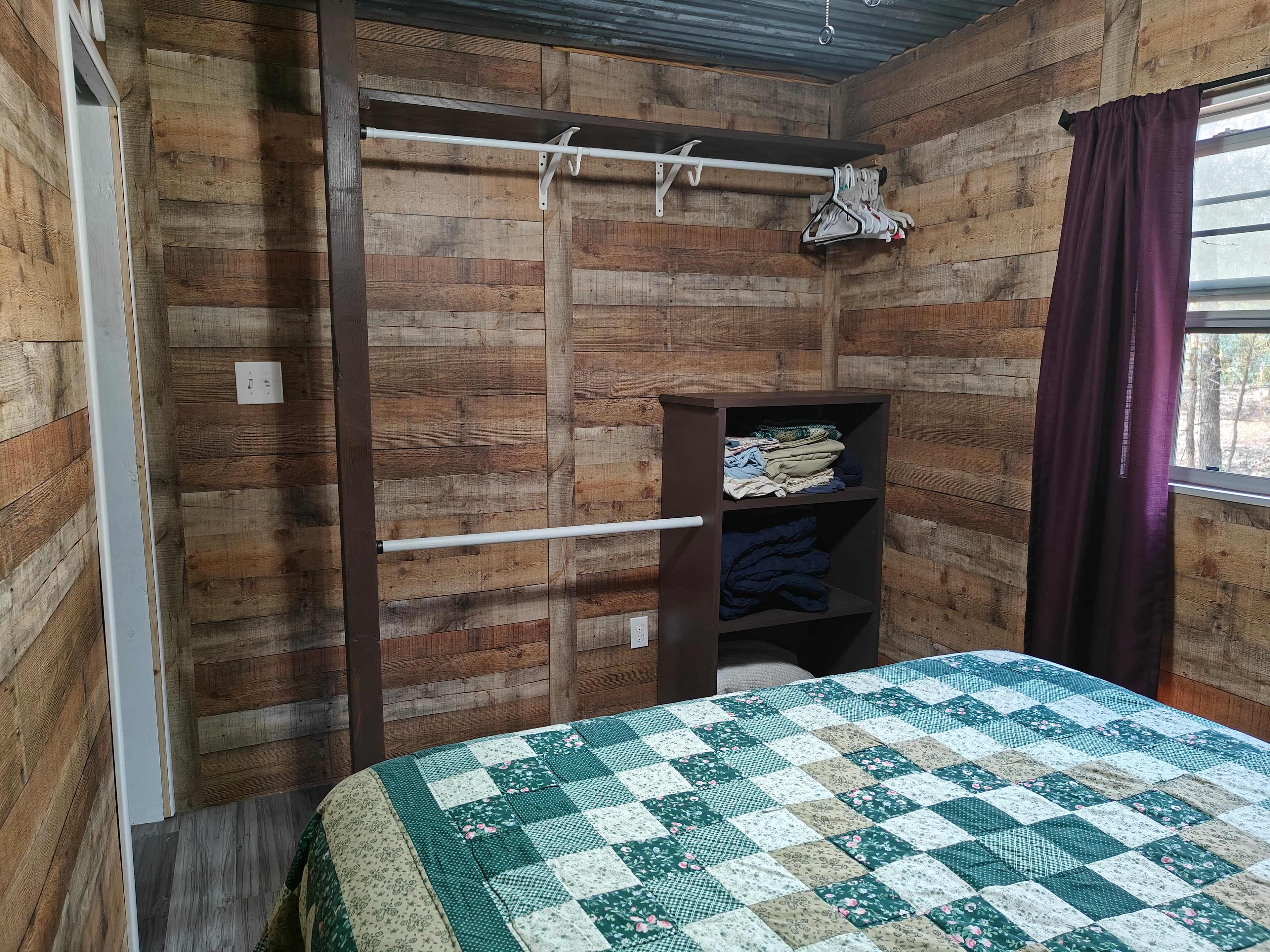The cabin 1 bedroom with queen bed, bathroom with shower, full kitchen, refrigerator, den with TV & wifi.