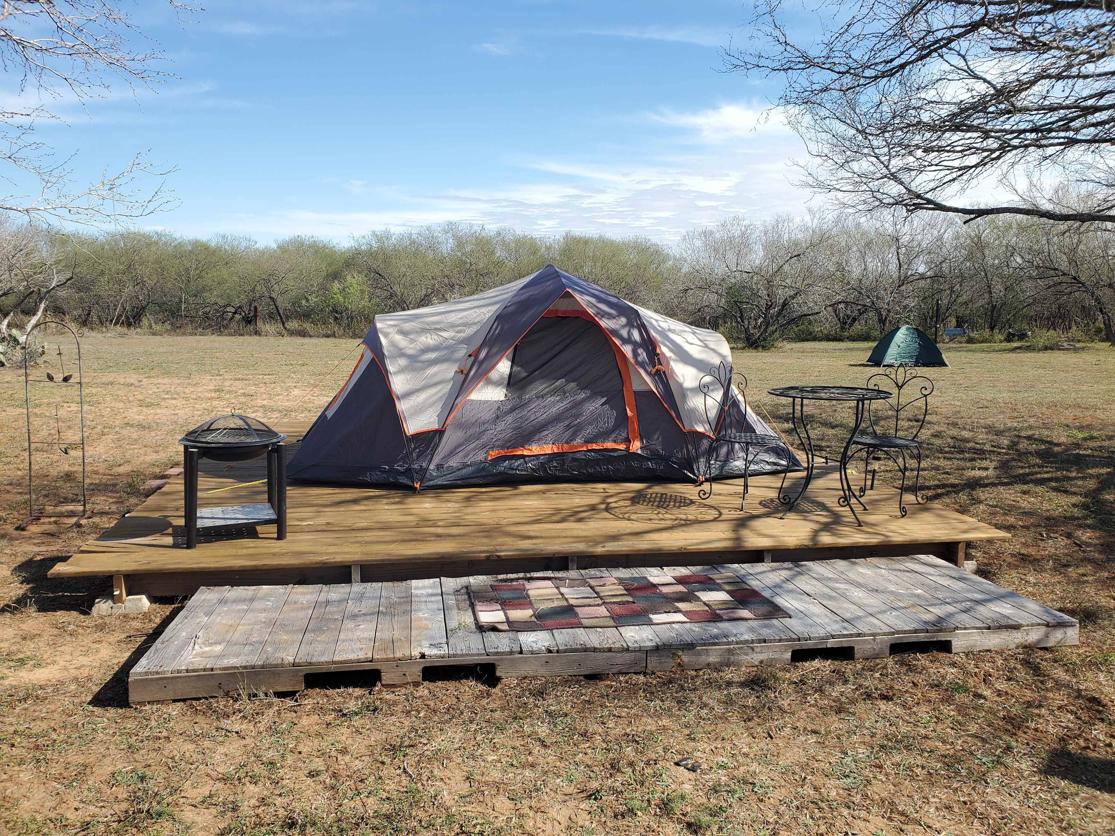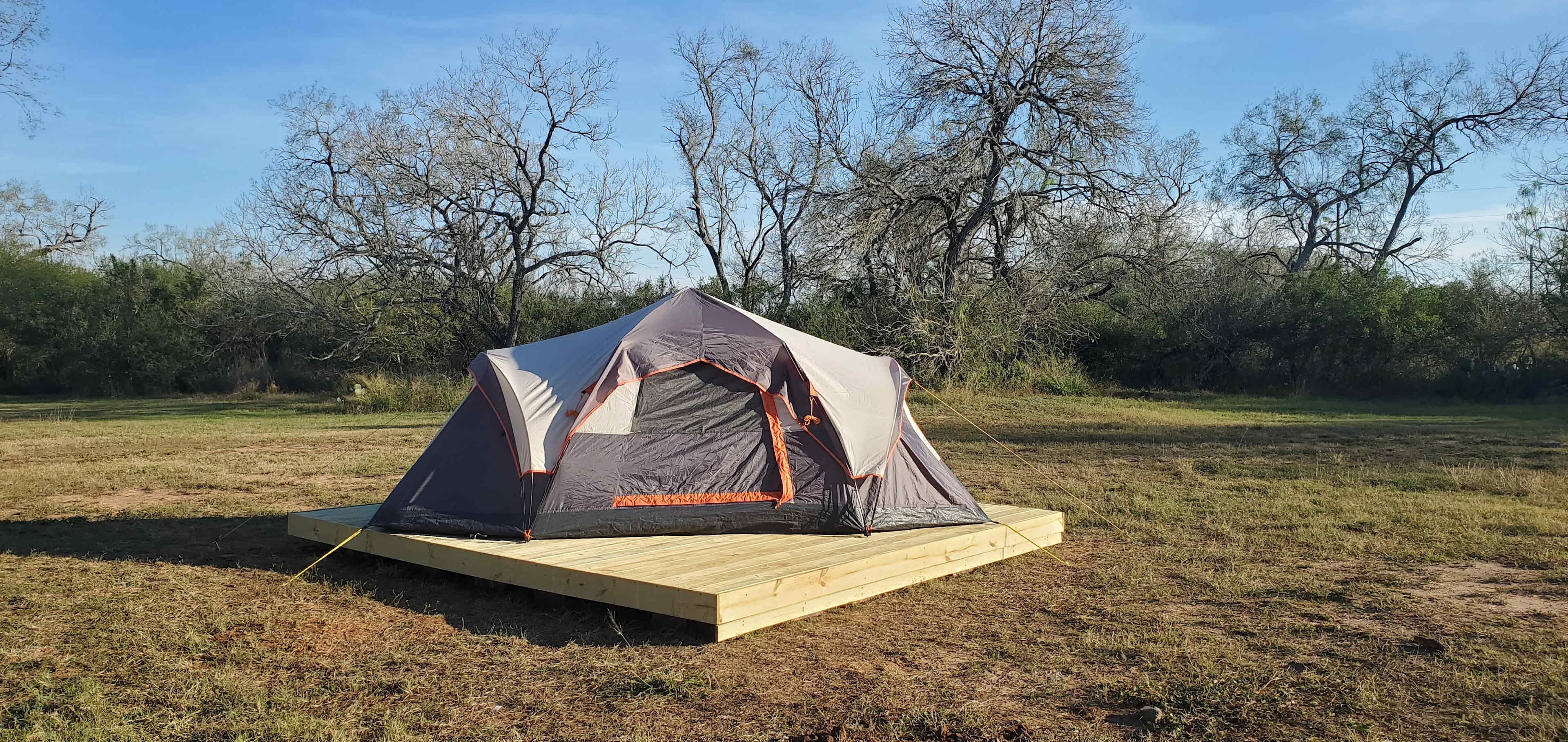 My husband and I fell in love with this property the moment that we turned "Right" after entering the access gate. There were cows and a very protective Bull. The owner took the cows away after the sale, but he left us with beautiful Mesquite and Spanish Oak and endless possibilities....We want to share this beauty with our guests. Because there are burr grass here and mesquite thorns, we built decks for some of our Glamping Tents. You have a choice of bringing your own gear and setting up on the ground or renting one of our Fully Dressed Glamping Tents that are situated on Decks. We also re-purposed our little rustic cabin and turned it into two luxury bathrooms and a separate fully functioning kitchen. The beauty of our space, is you can bring a group of your Family and Friends and enjoy Secluded Private Camping! 20 miles away you have Choke Canyon State Park. You might think fishing and boating rule at this Texas state park. You'd be right. Cast your line from the shore or a boat to catch largemouth bass and catfish. Pick from hundreds of secluded inlets or coves to find your perfect fishing spot. Return to your campsite at sunset to prepare a meal from your "Catch of the Day". Be aware that fish aren't the only creatures in the water. This lake marks the farthest west that American alligators live in their natural habitat. Don't worry too much, because alligators usually avoid humans and stay away from boats. Pack your binoculars, because birding is popular here. Head to the South Shore unit for special birdwatching trails that wind around the park. Listen for bird calls as they talk to each other or to you. Songbirds and migratory birds make homes near the reservoir. Learn more about this land: Private Camping on over 12.98 Acres. We can provide Tents for either Semi-Primitive camping or Tent Glamping. A Host Tent on a deck is available for the Guest that makes the Group Reservation and that Guest will be responsible for all other camp guests. We provide a Comfort Cabin, with City Water/Electricity and access to Bathroom w/Shower, Sink, Toilet and Hot Water Heater, Kitchen with Microwave Oven, Fridge, Hot/Cold water/Ice Dispenser, Griddles, Firepits, BBQ Pits, Some Utensils and More. Group Minimums are 10 Campers with 2 night Min stay.